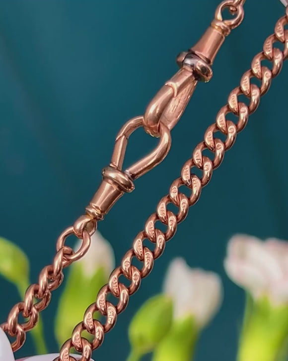 Crafted from 30 grams of solid rosy 9ct Gold, this chunky Victorian Albert chain has antique stamps on every link authenticating its high-end craftsmanship; it embodies antique charm and decadence!
