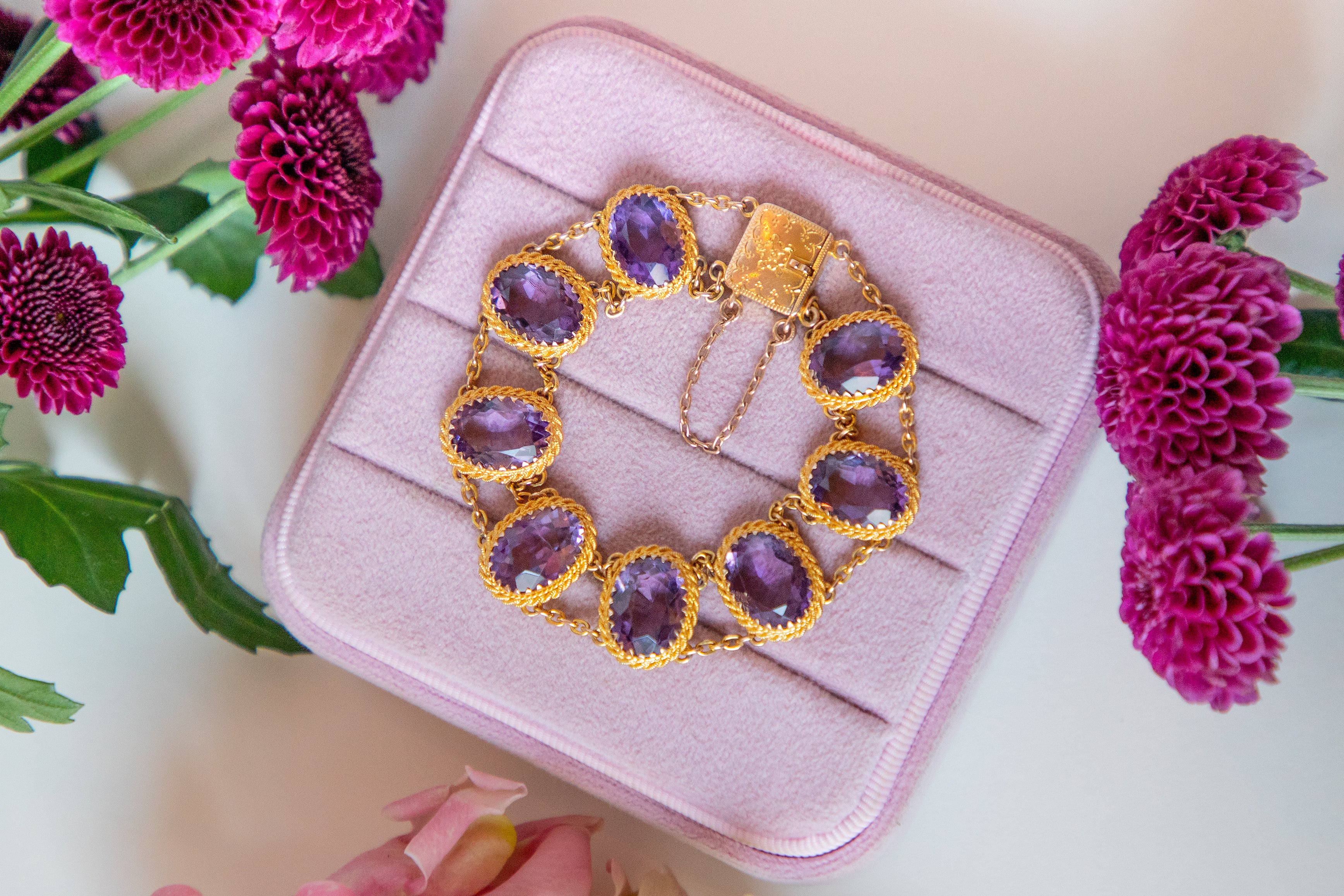 EXCELLENT. We are pleased to present this antique 9ct Gold Amethyst bracelet in excellent condition! Each Amethyst is present and secure, with a consistent vivid purple hue. The chain is firmly affixed to each setting, creating a lovely fluidity throughout the piece, allowing her to caress any wrist she adorns. The clasp shuts with a firm 'click' and with a safety chain, she comes with an extra layer of security so you can wear it with confidence!