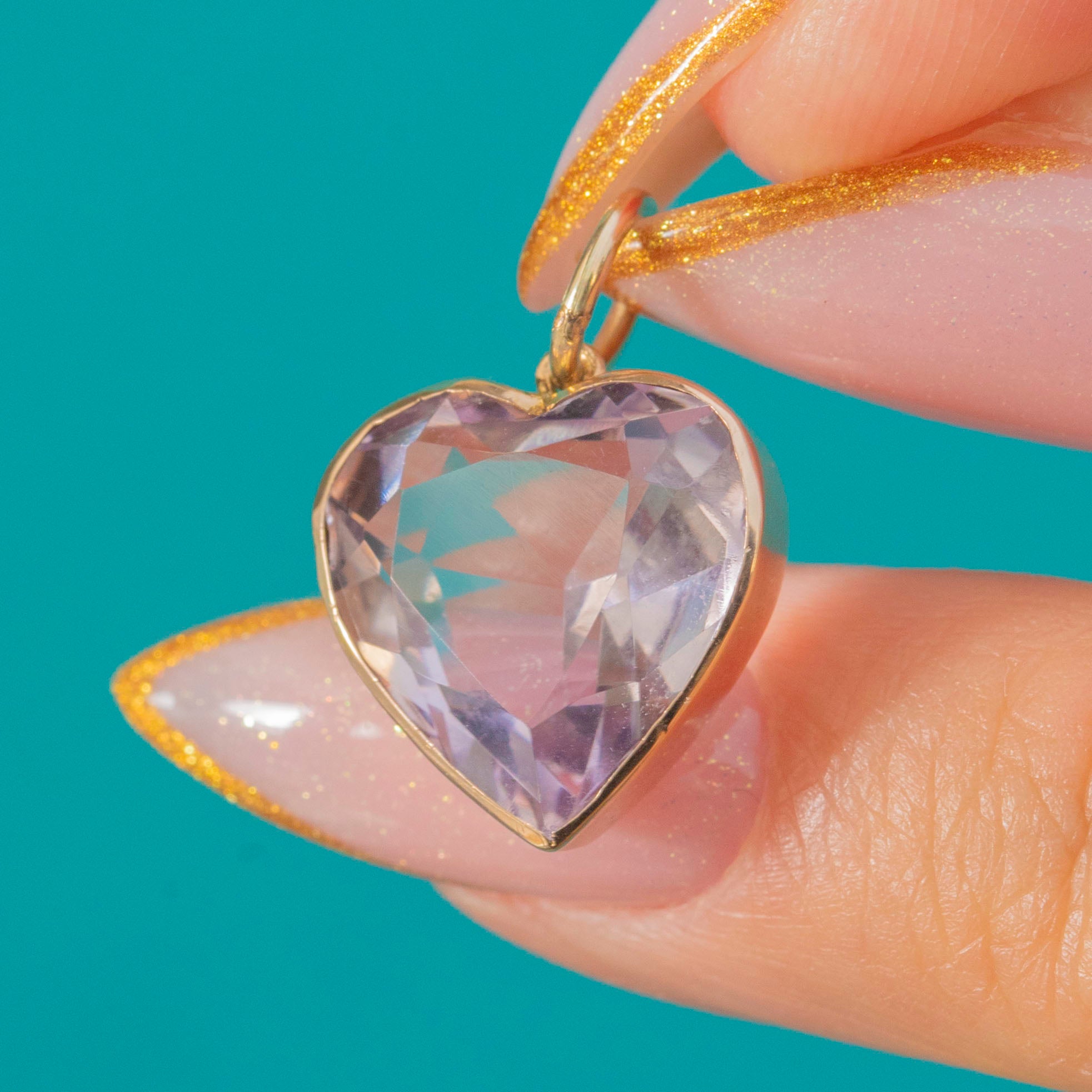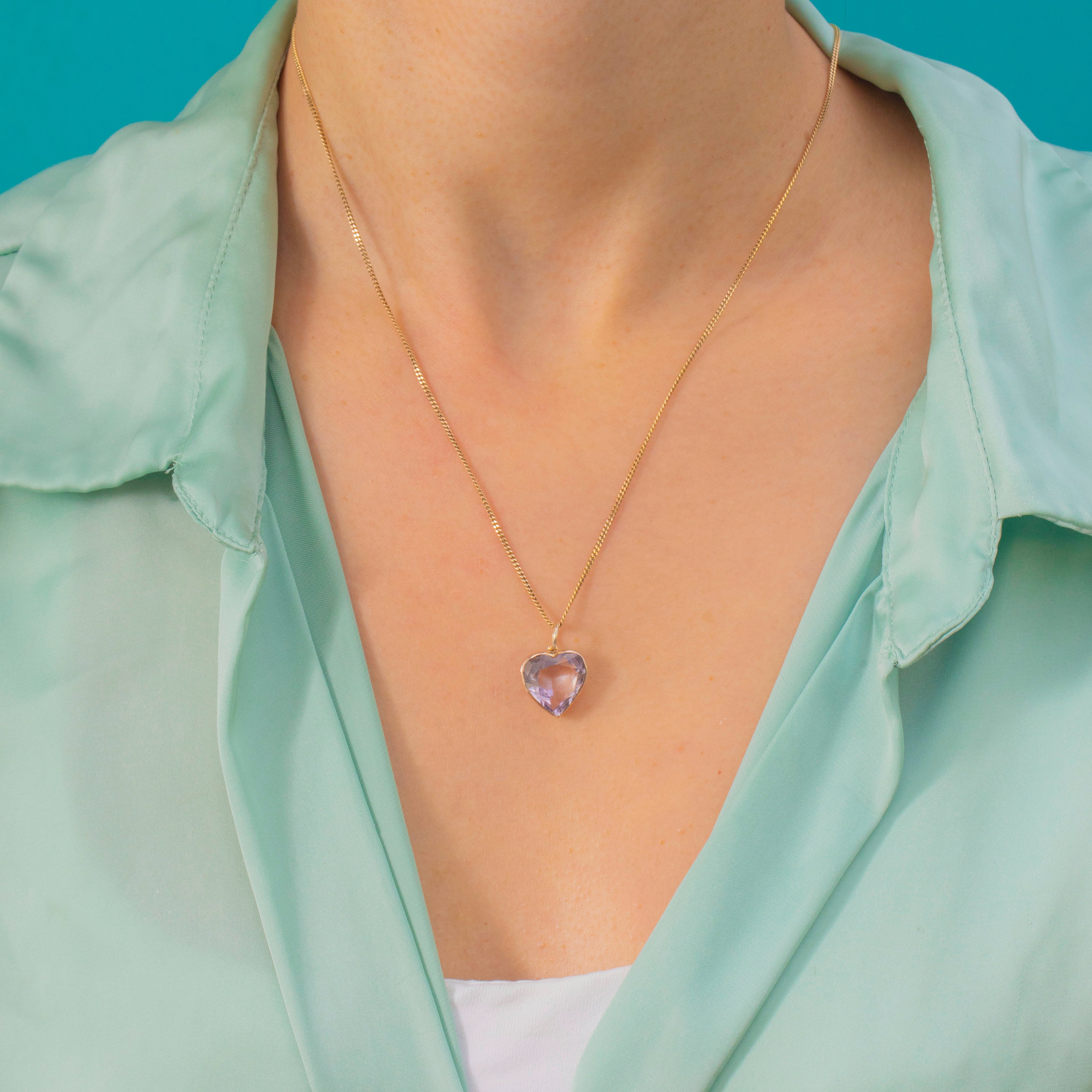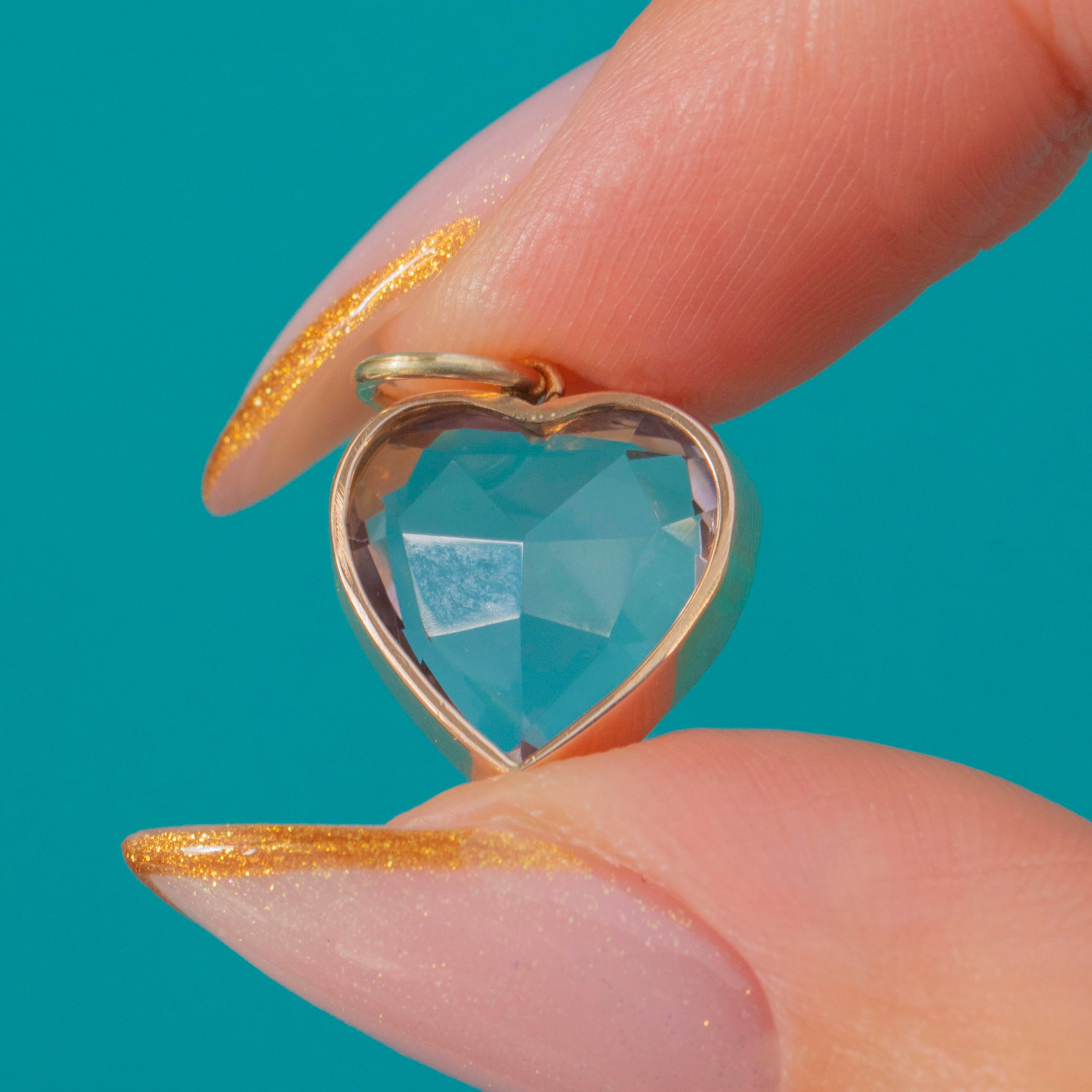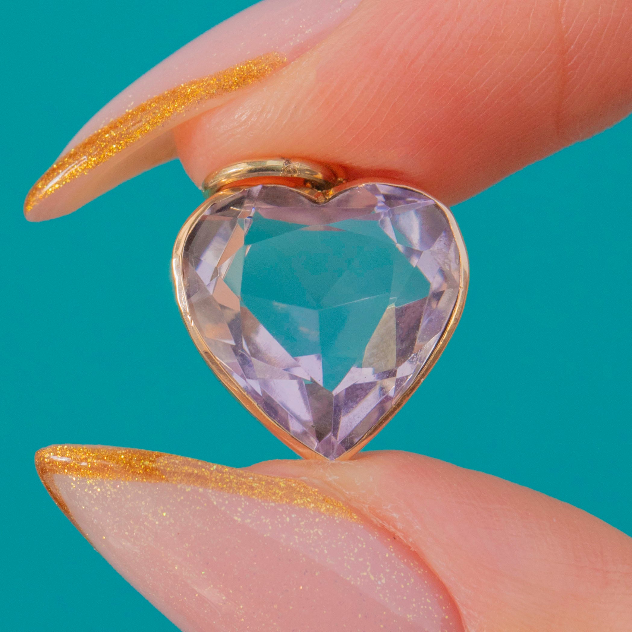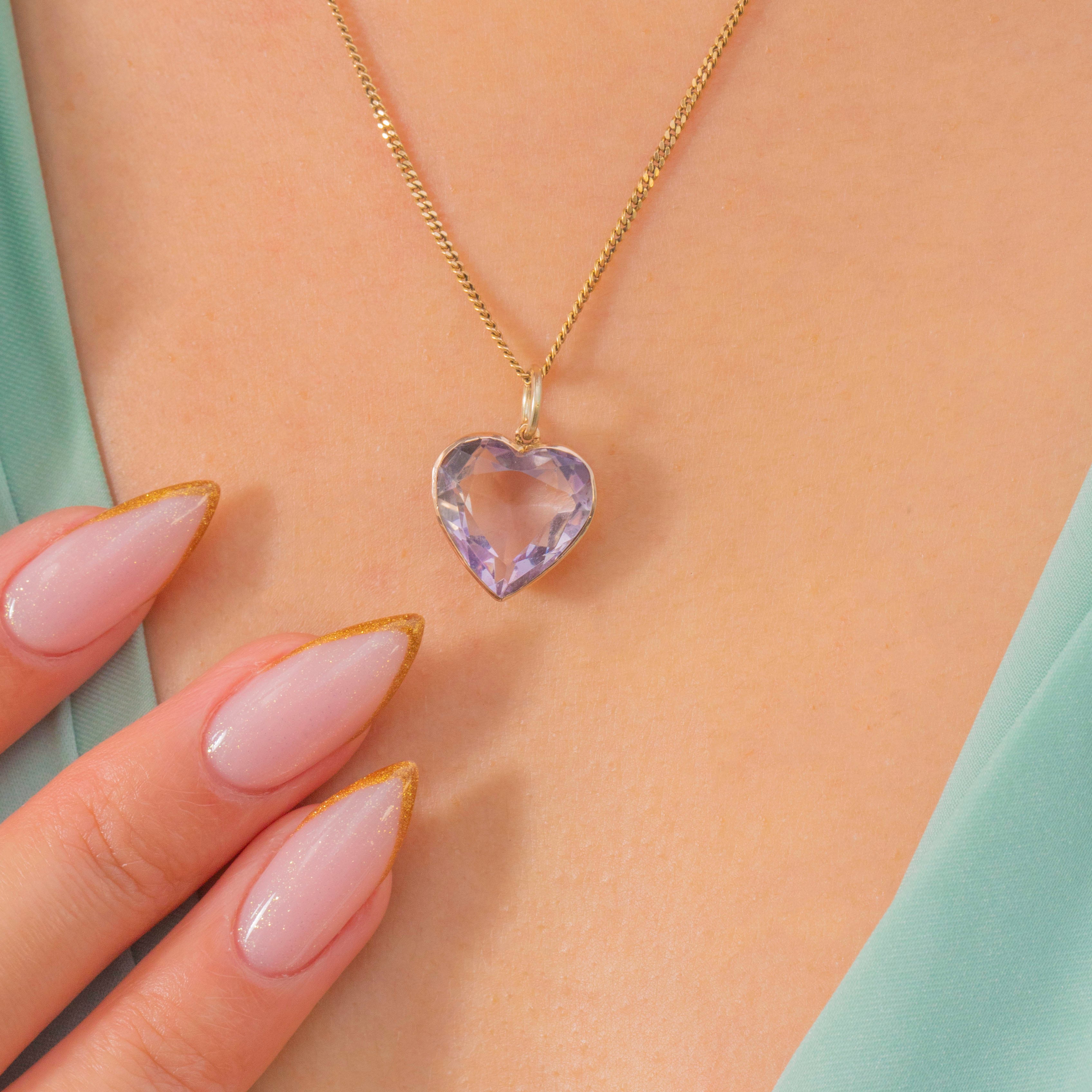 A beautifully cut Victorian Amethyst heart charm set in warm 9ct Gold. The gemstone glows with a soft lilac hue, radiating light through its faceted surface with every movement.