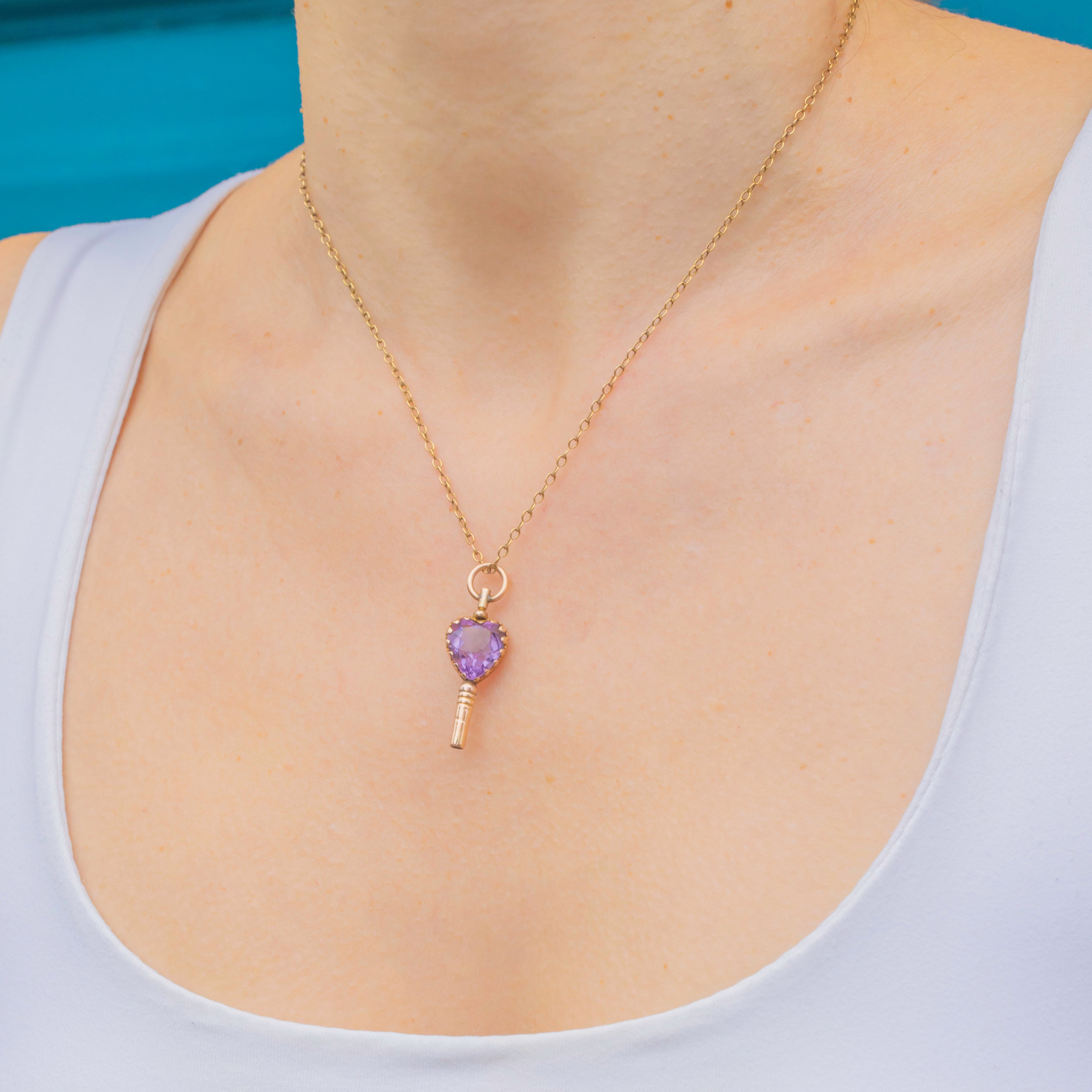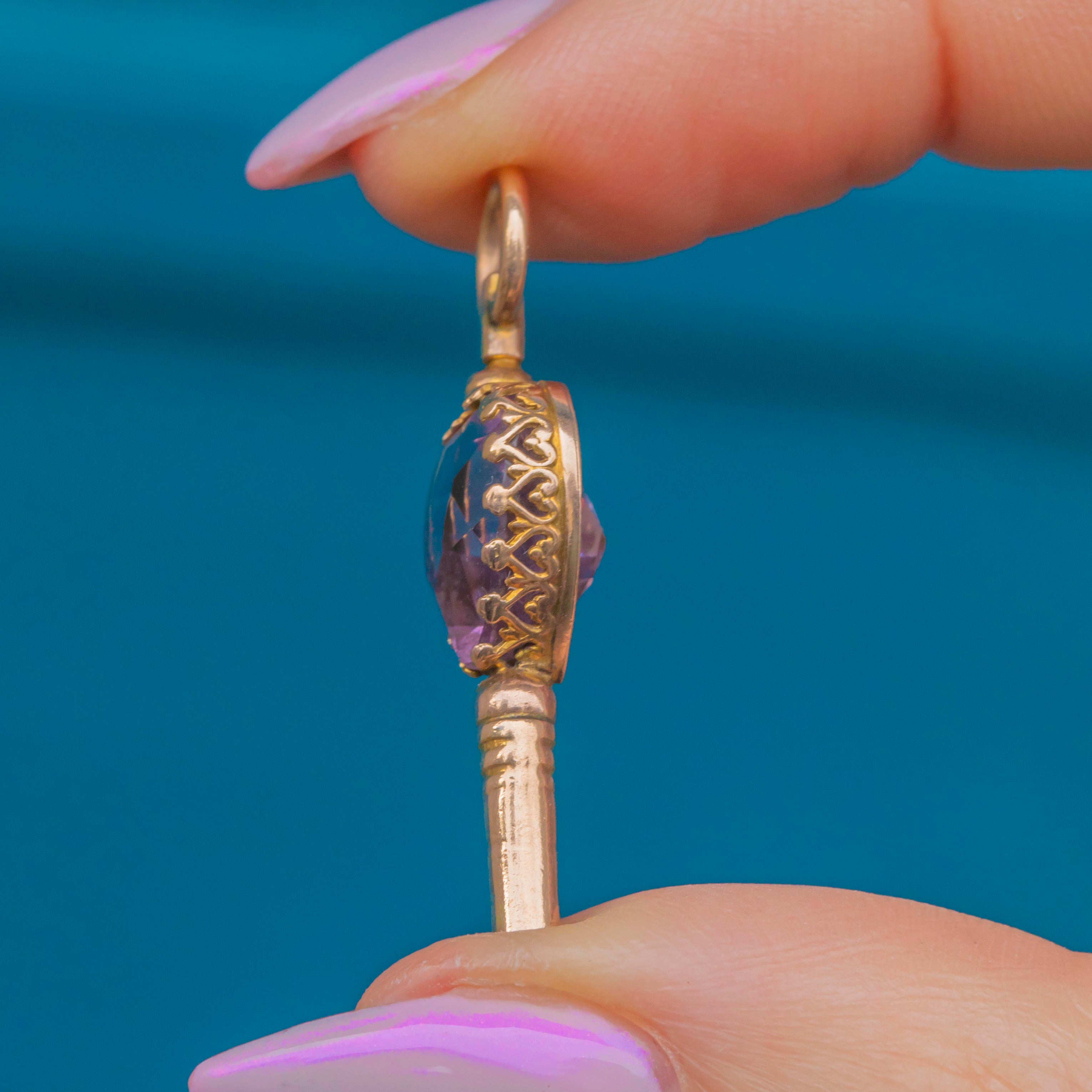 The Amethyst is held securely in ornate 9ct Gold claws, with a lovely sense of symmetry and detail throughout. Originally designed as a watch key, it now makes a stunning and romantic pendant — full of antique charm and colour.