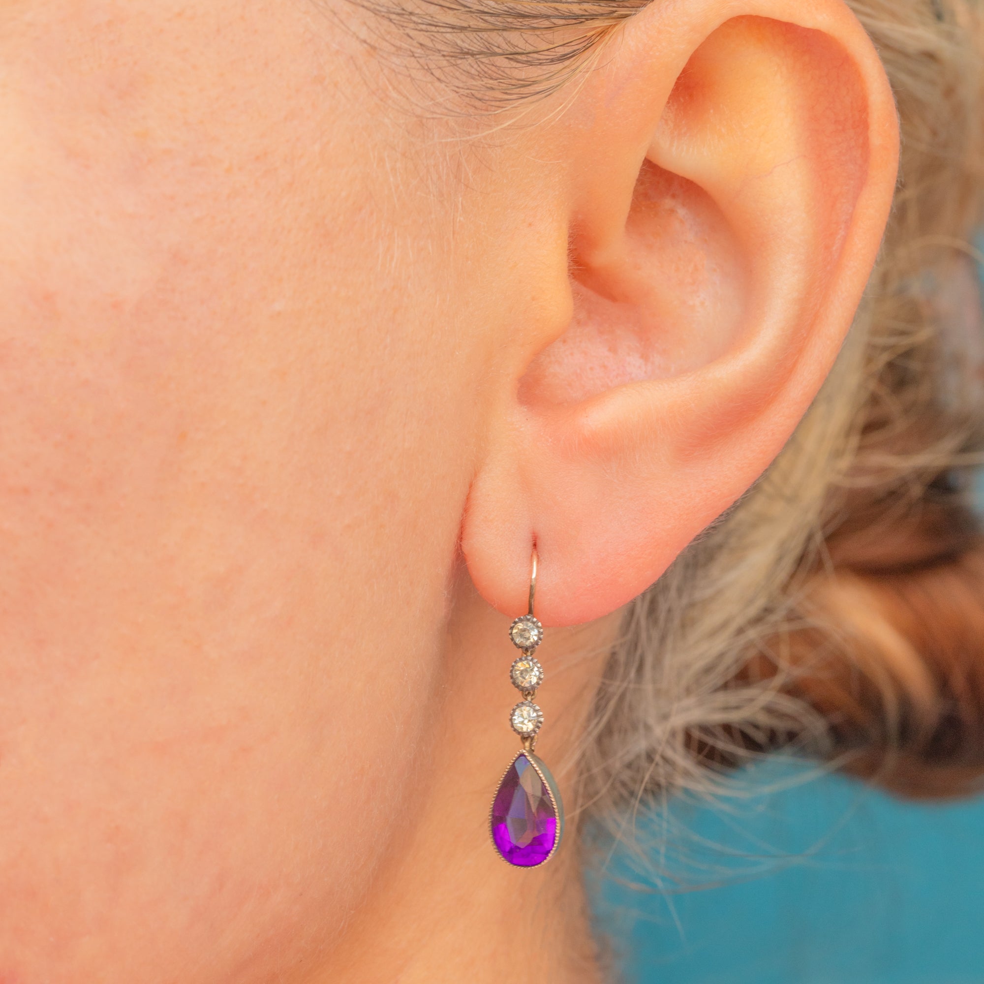 Each drop earring boasts a vibrant royal purple Paste, expertly cut into an elegant pear shape, and is adorned by a trio of twinkling Diamond Paste stones. Dancing with movement as they suspend from your lobes, these Victorian drop earrings are the perfect versatile pair to add to your collection.