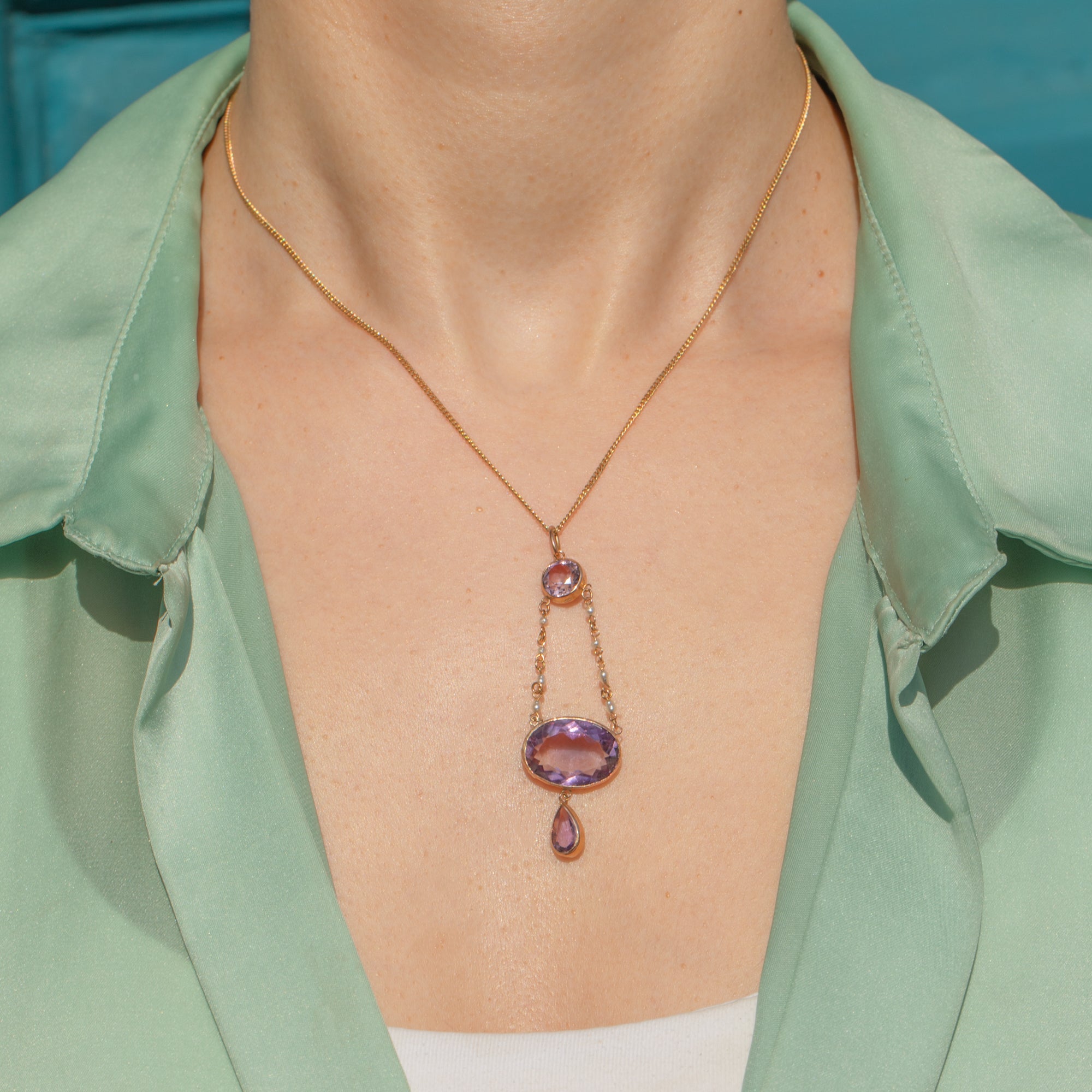 The 6.06cts of Amethysts have crisp facets that glimmer and dance in the light, each one uniquely cut and graduating in size to create an elegant silhouette. The perfect elegant piece for occasion wear, this Edwardian Amethyst pendant will add a touch of antique charm to your outfit!