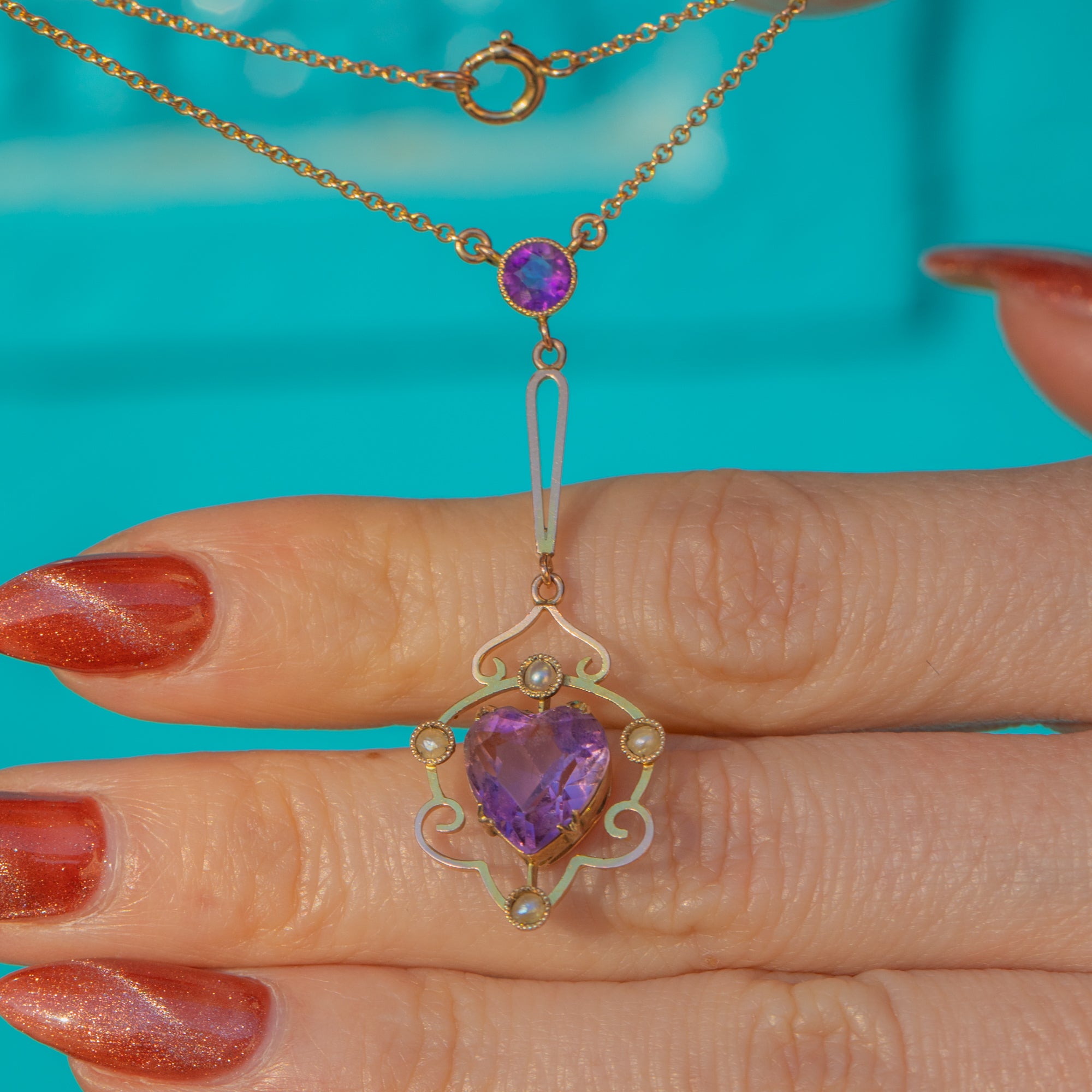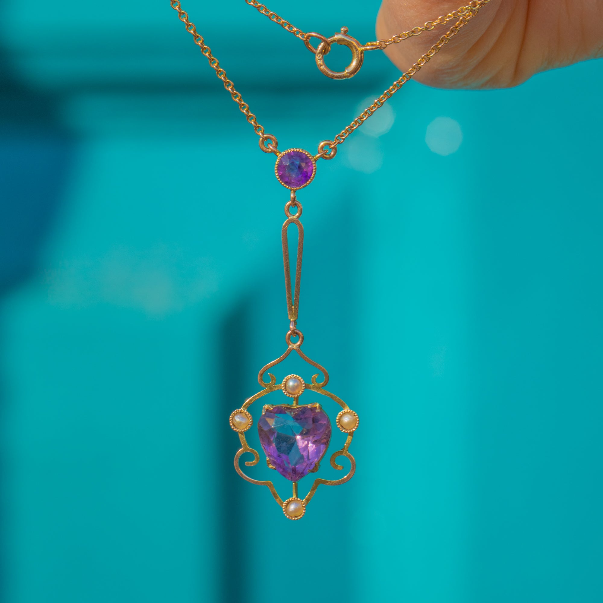 This antique 9ct Gold Amethyst Pearl heart necklace is a gorgeous antique piece! Crafted from warm, buttery 9ct Gold, this Victorian necklace features an elegant heart drop pendant as her central focus point.