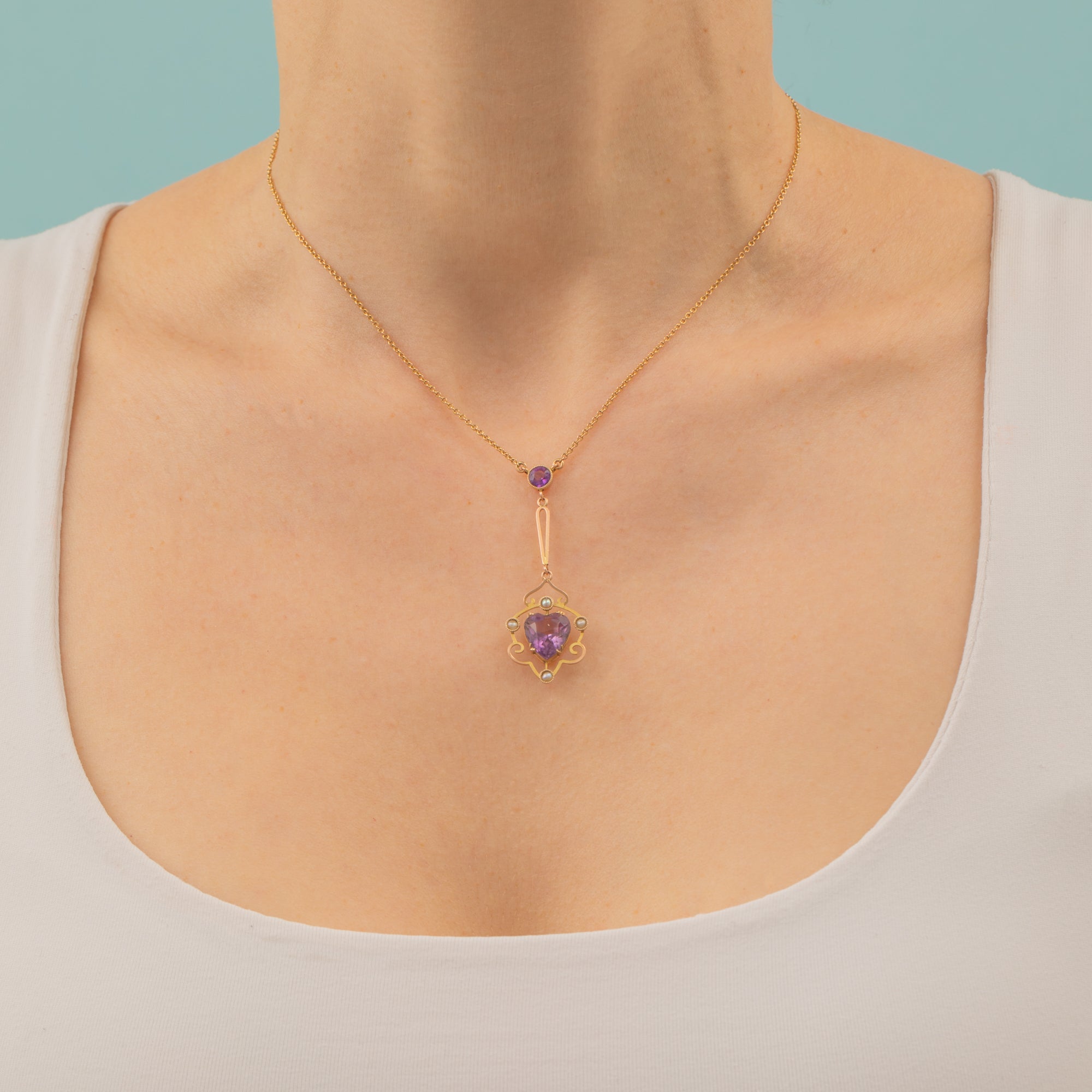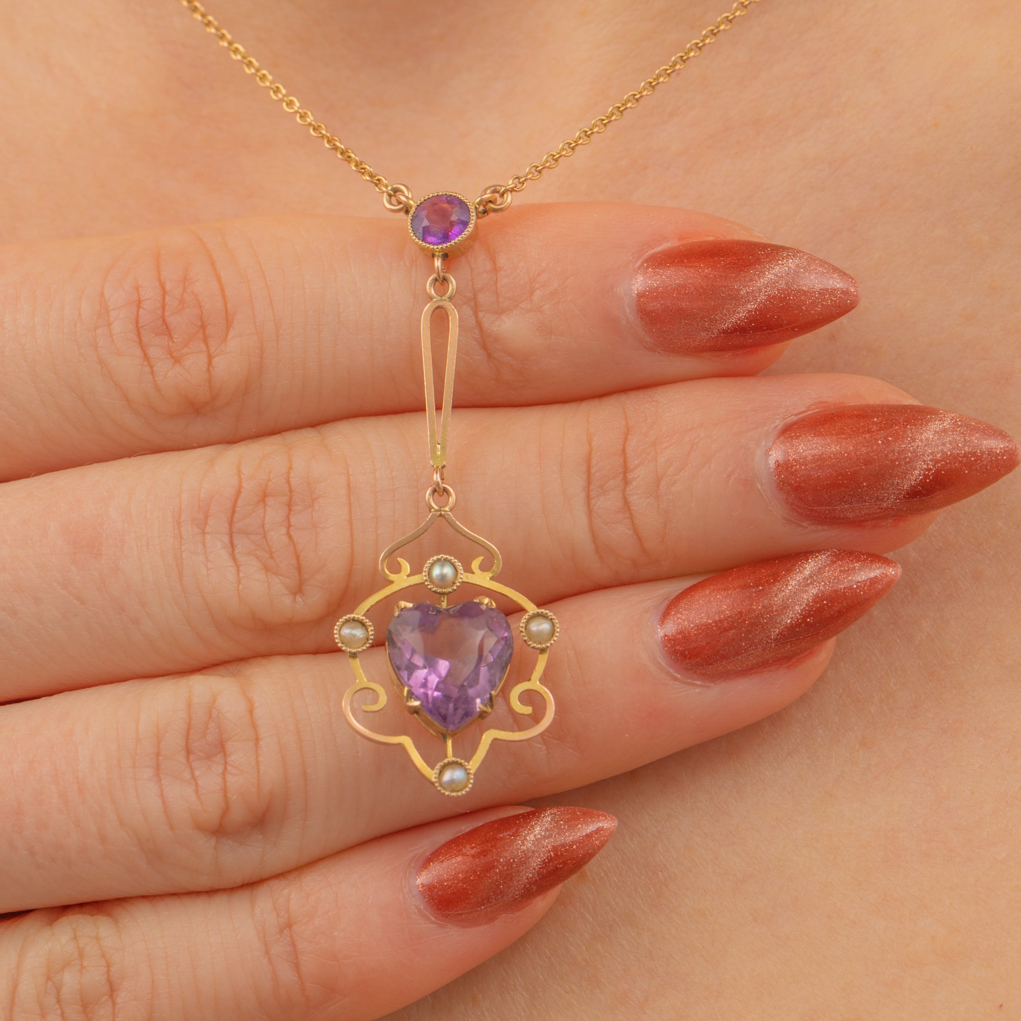Antique 9ct Gold Amethyst Pearl Heart Necklace, 2.10ct