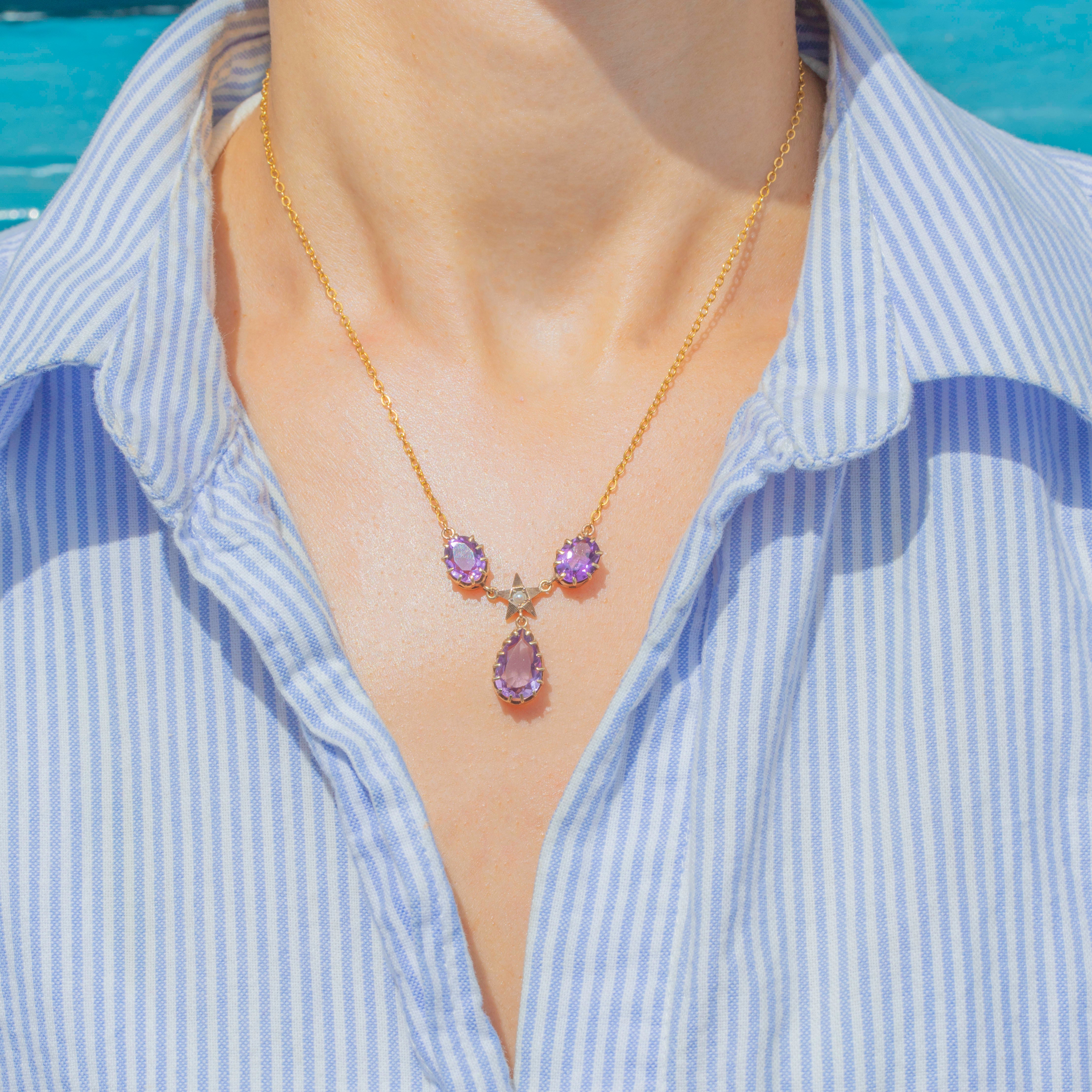 This antique 9ct Gold Amethyst Pearl star drop necklace is an outstanding Victorian treasure! At 15.5 inches long, this Victorian necklace will rest delicately across your décolletage, suspending the delectable gemstones centrally between your collarbones.