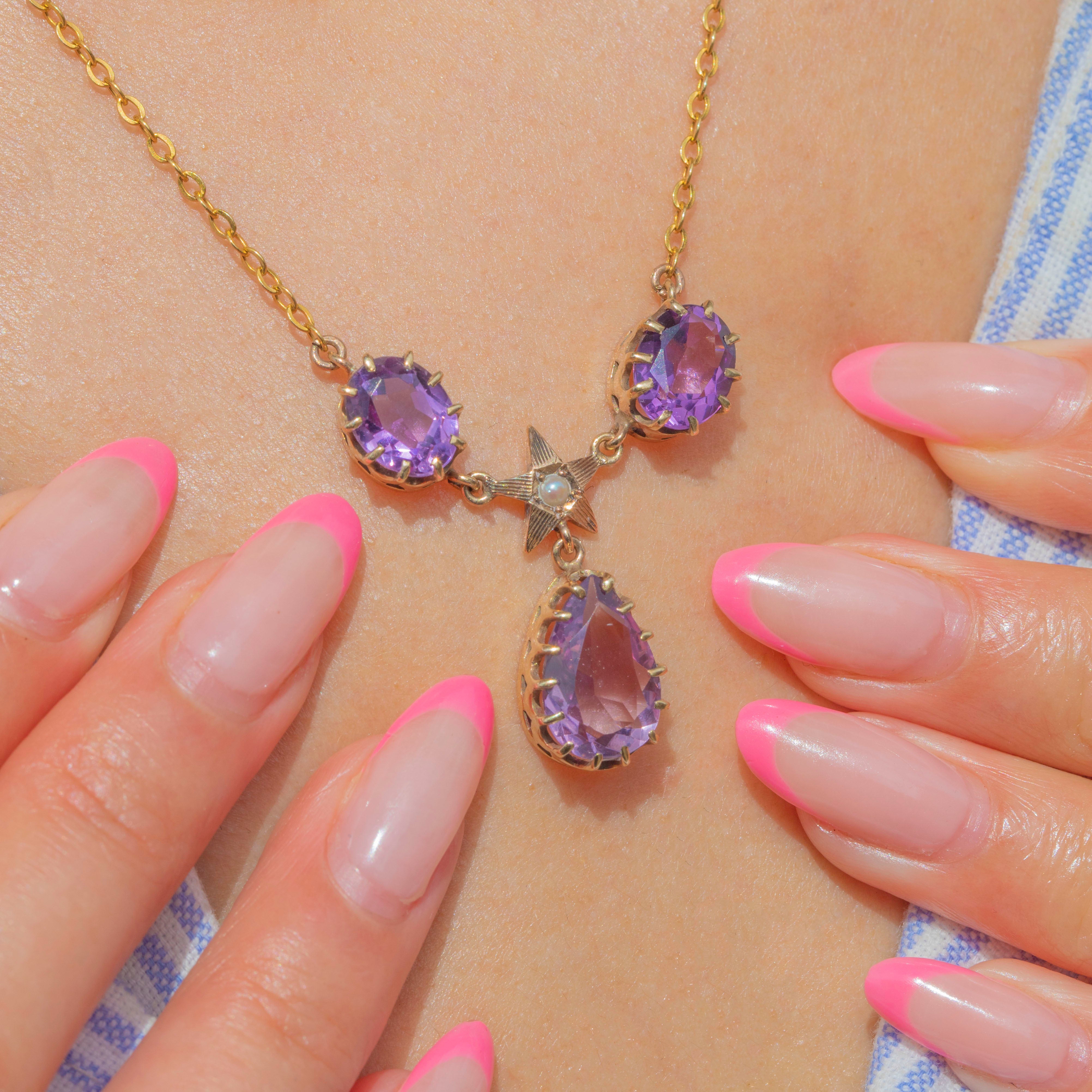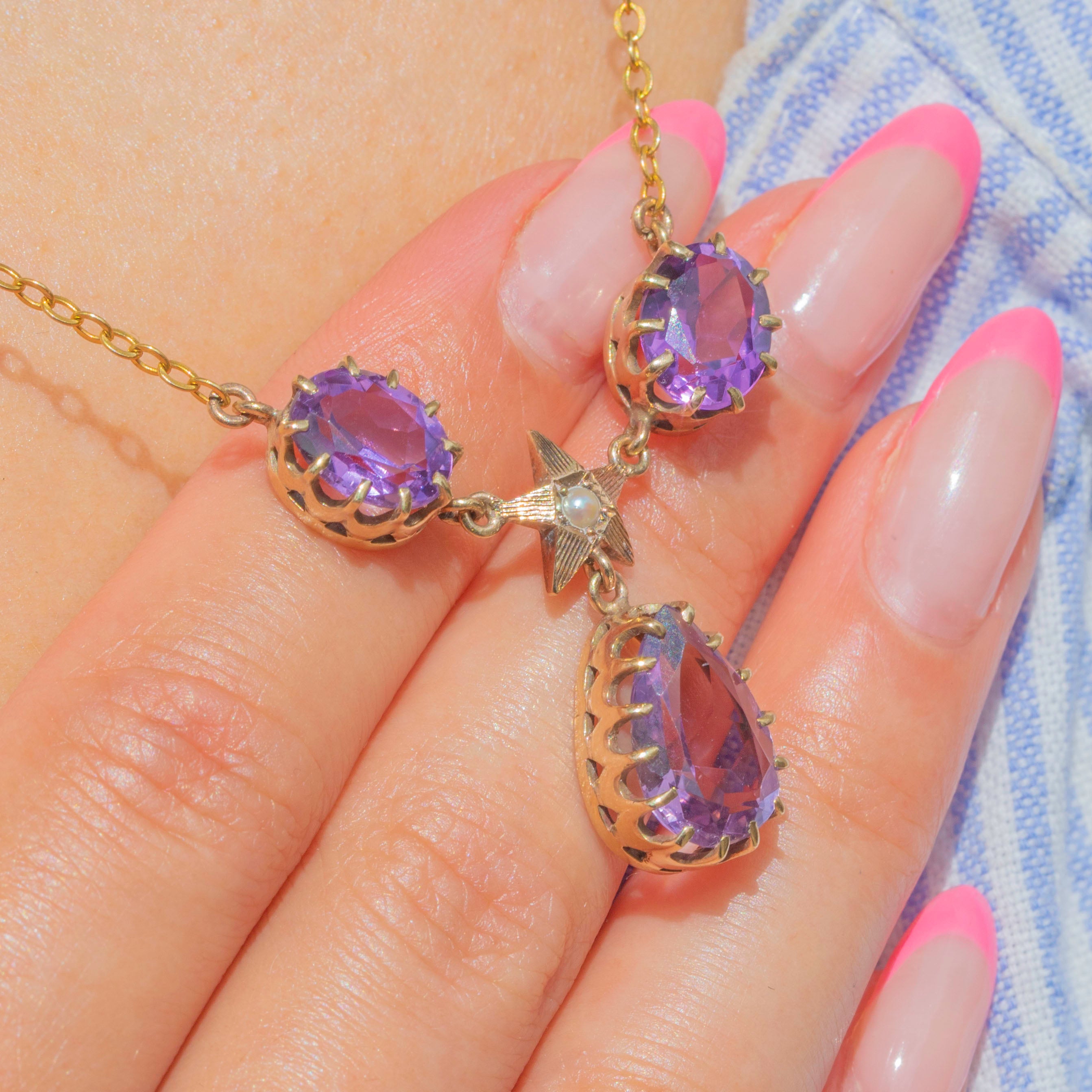 EXCELLENT: We are pleased to present this antique 9ct Gold Amethyst Pearl star drop necklace in excellent condition! The Amethysts have a delicious vibrant purple hue and boast crisp facets, free from fleabites or abrasions. The Gold is buttery and the gemstones are securely set. Each component is securely affixed, and with a fully functioning bolt-ring, you can enjoy wearing this celestial treasure with absolute confidence!