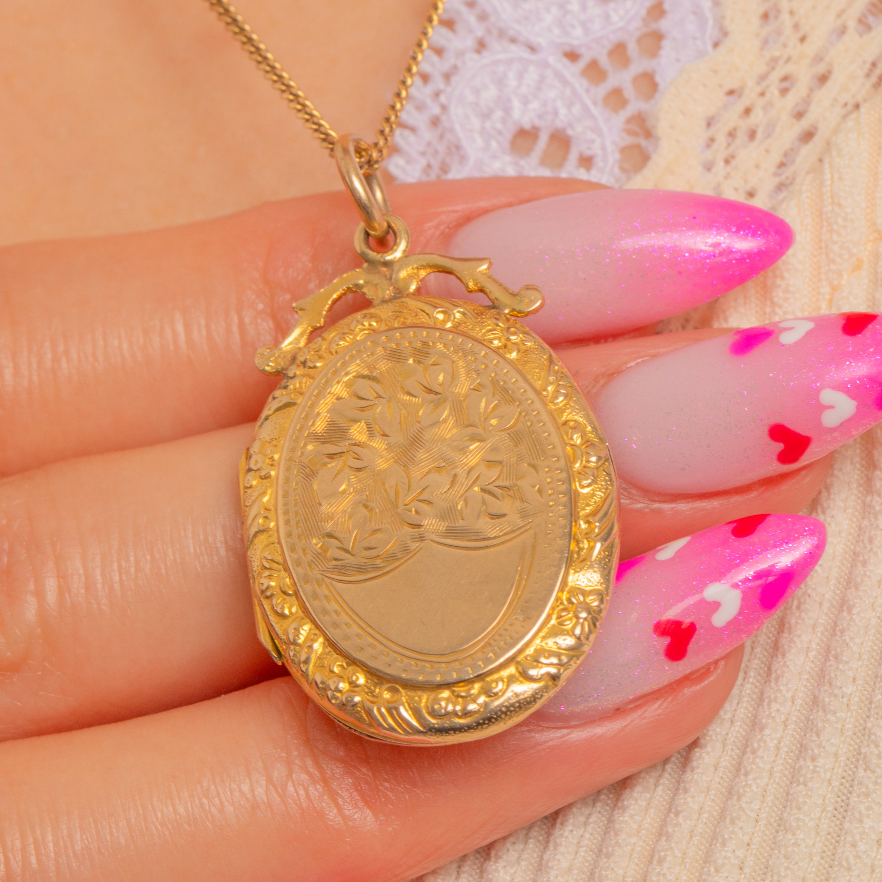 This ornate Victorian locket is a romantic keepsake in warm 9ct Gold back and front, richly detailed and framed by raised foliate and beaded ornament. The oval face is beautifully composed, with delicate scrollwork and a charming bow-like surmount to the bail that adds a softly feminine flourish.