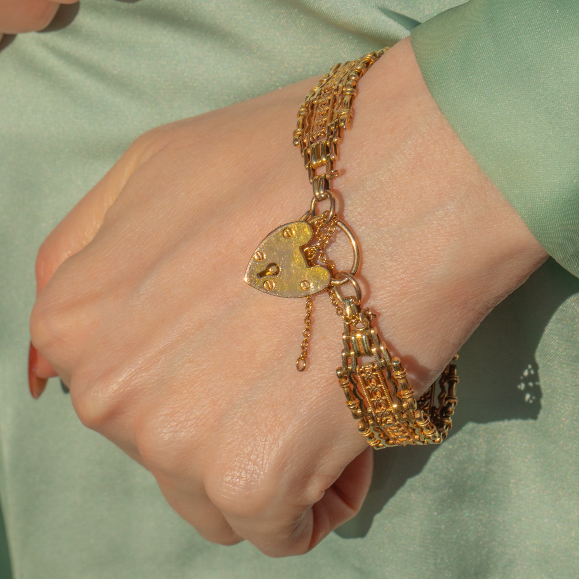EXCELLENT. This antique 9ct Gold bamboo gate bracelet is in excellent condition. All of the links have been beautifully crafted and provide a gentle movement. The safety chain is working perfectly but can be removed if you'd prefer! The padlock allows you to close this bracelet and wear it confidently. This Victorian Gold gate bracelet will bring luxury to any attire!