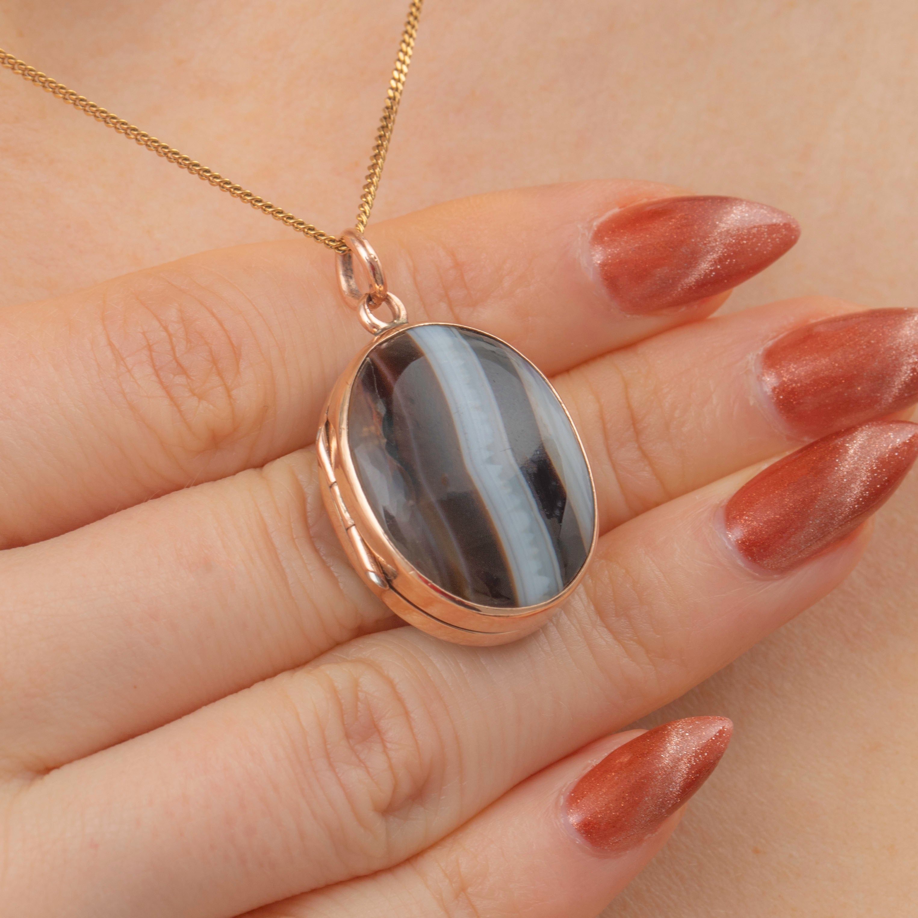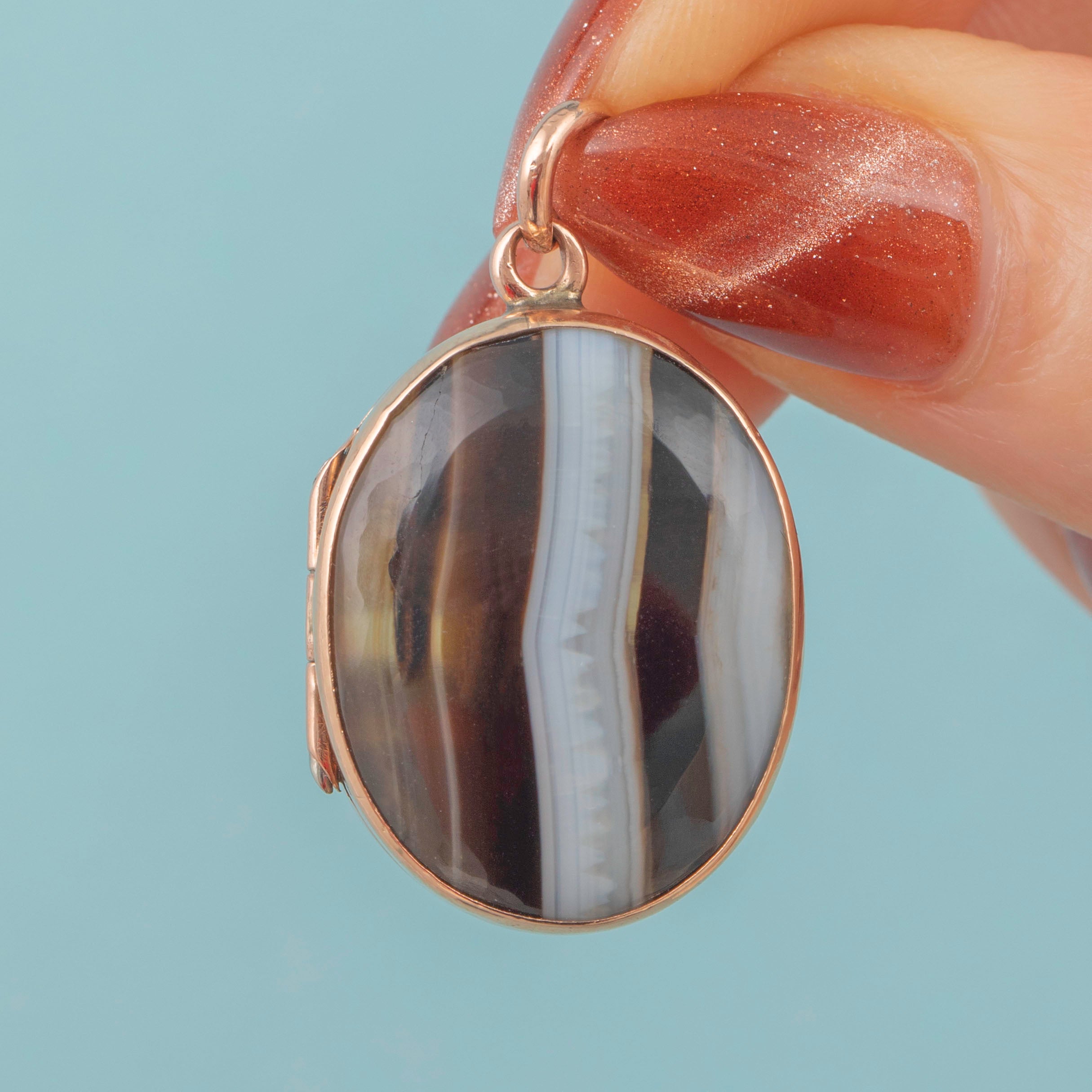 Both her back and front are crafted from stunning banded Agate stones, each an amalgamation of cool earthy tones, from black and brown to contrasting white and grey, effortlessly complemented by the warmth of her rosy 9ct Gold locket settings.
