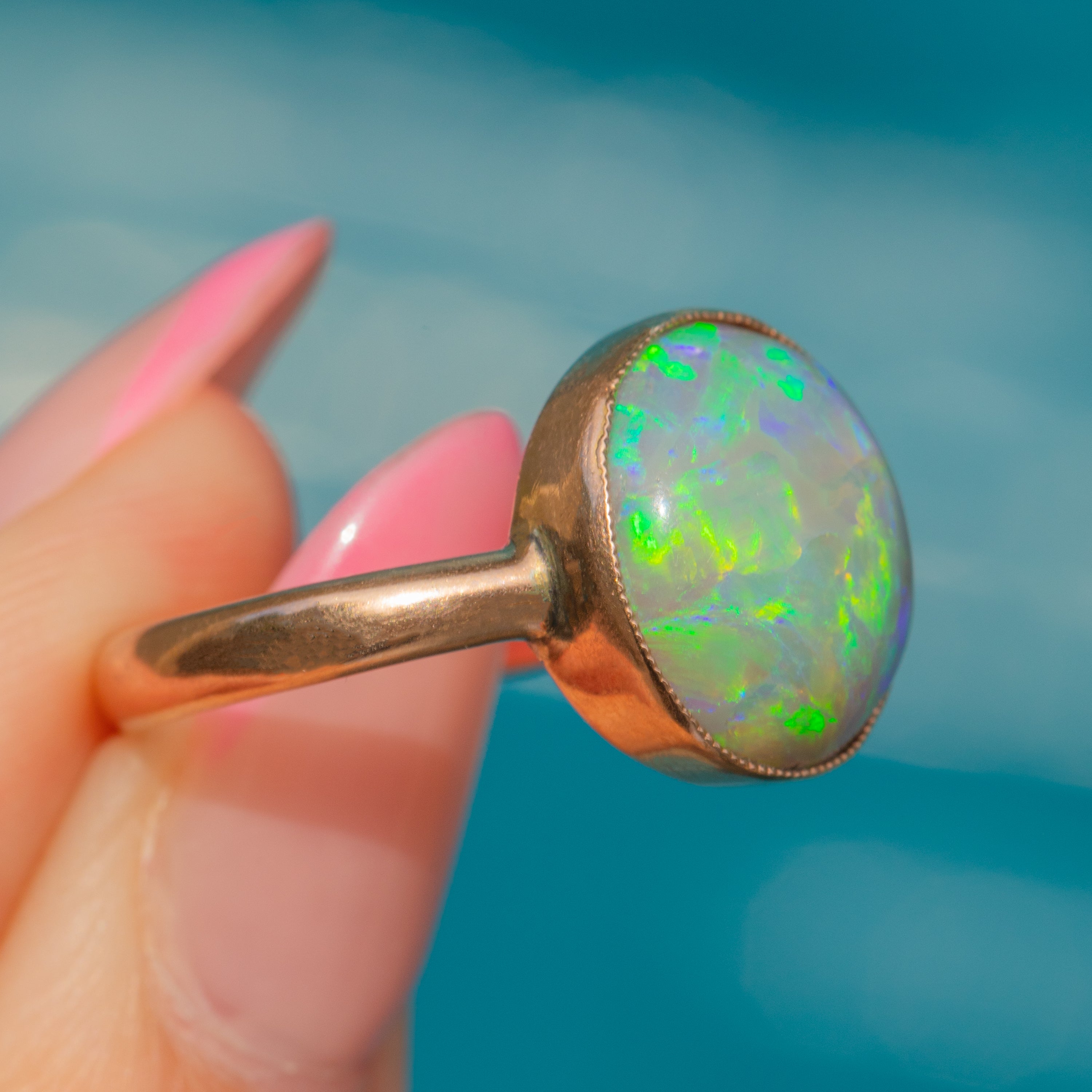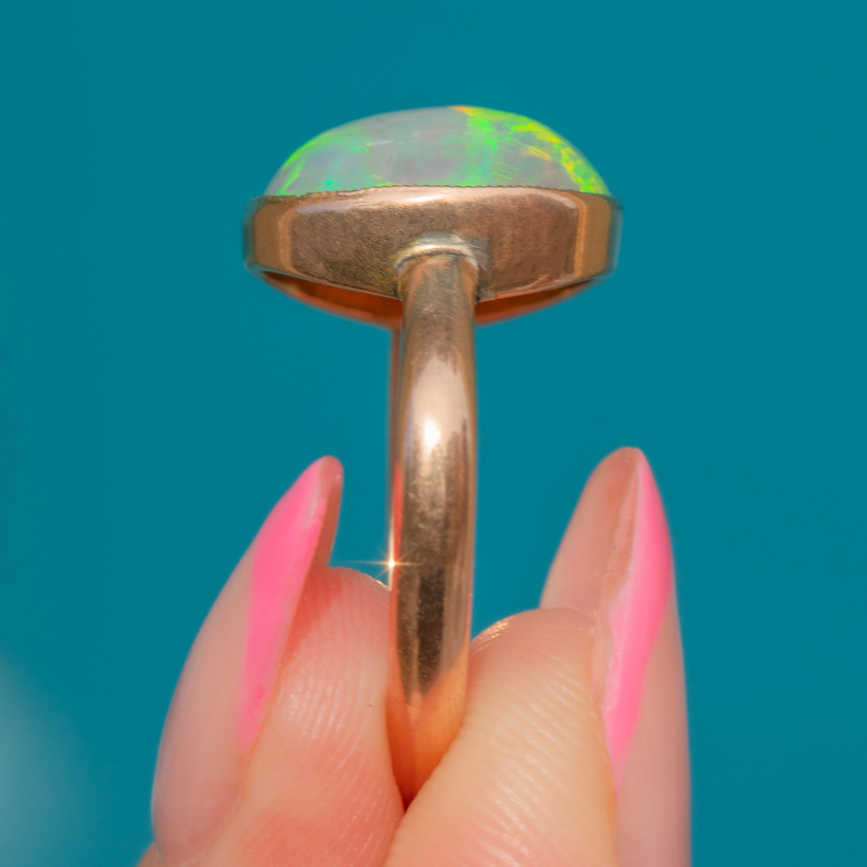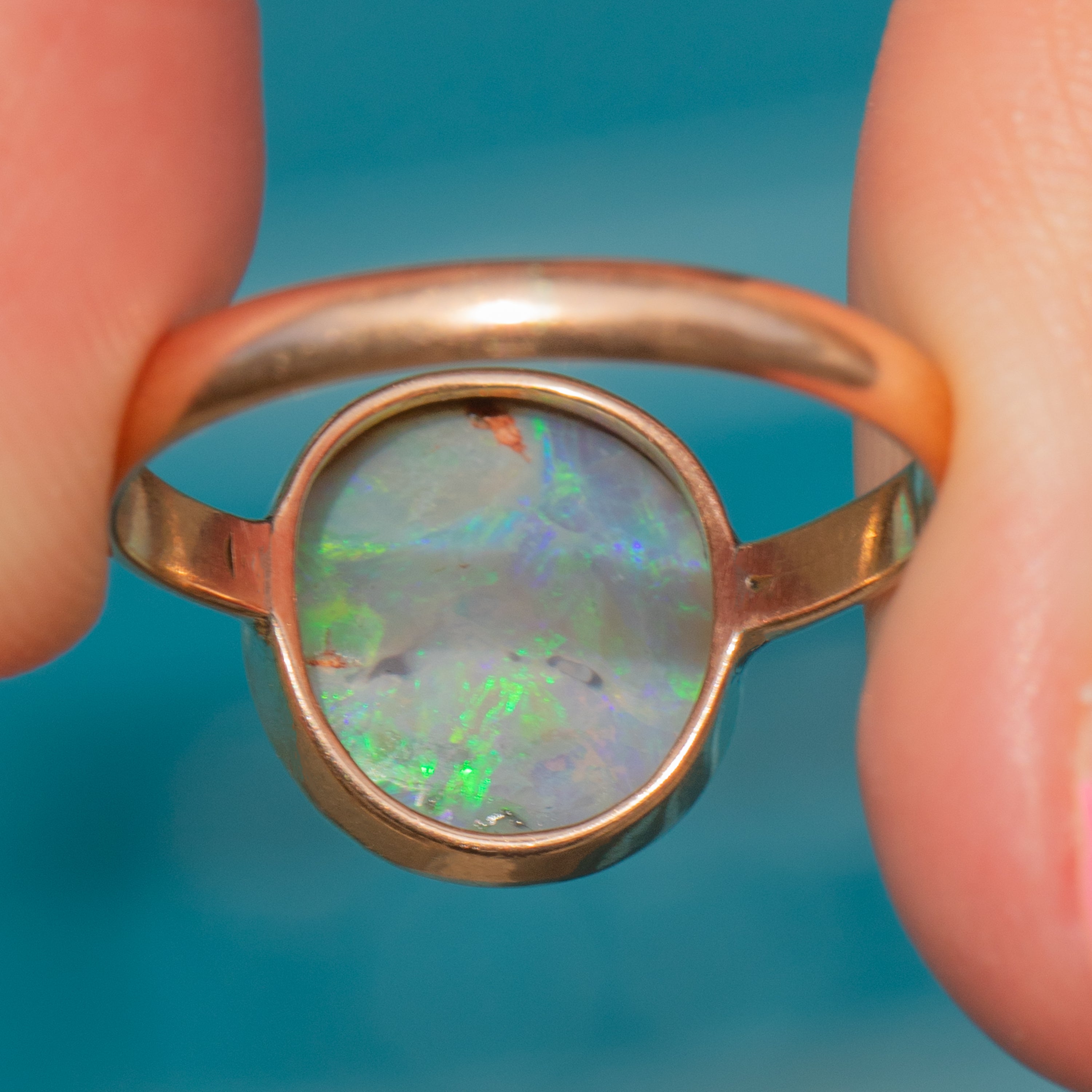 Flaunting a plump 3.10ct Black Opal cabochon, this ring radiates a kaleidoscope of sage greens and lilac hues. She is set within a rosy 9ct Gold bezel, the buttery 9ct Gold effortlessly complementing the cool tones of her stunning natural Black Opal.