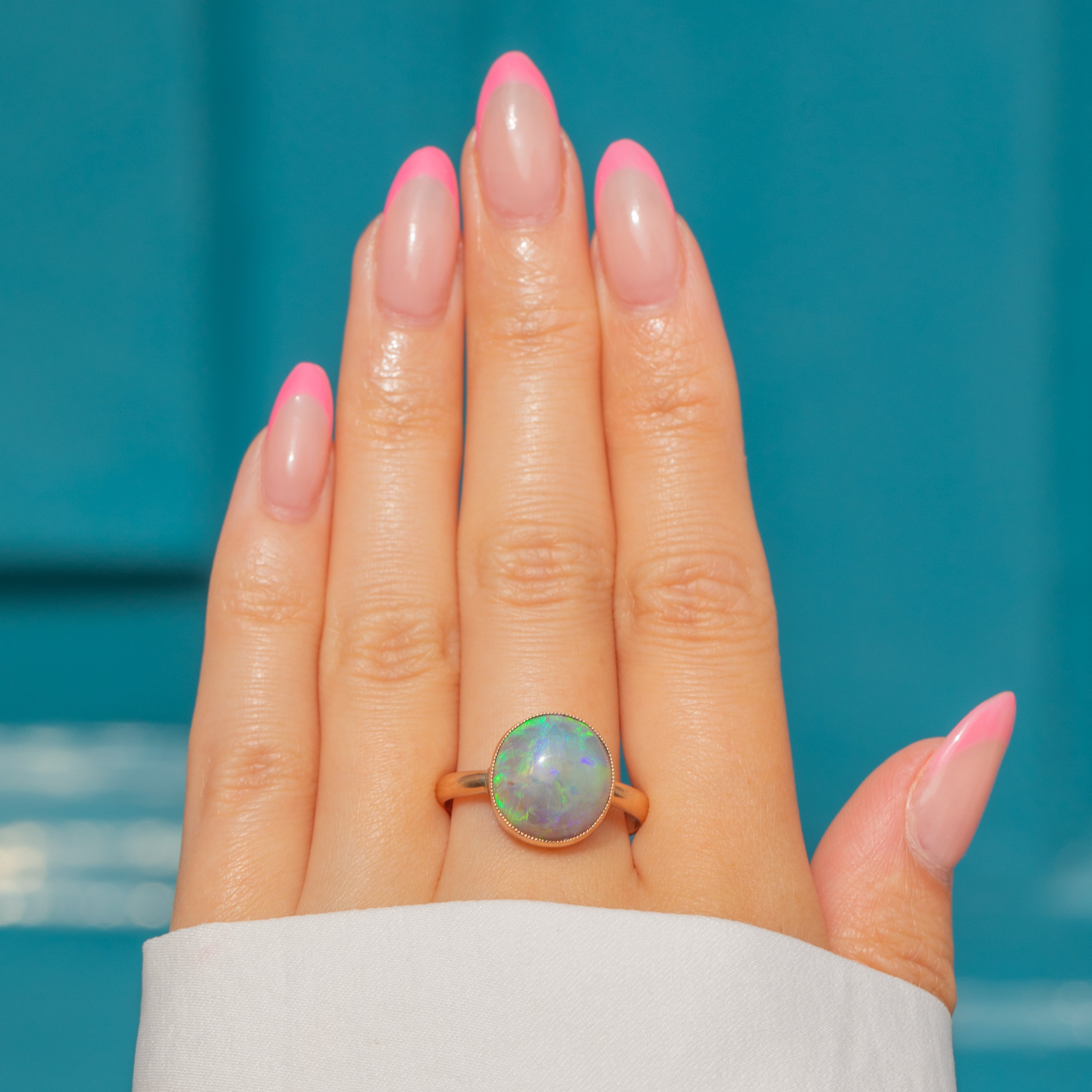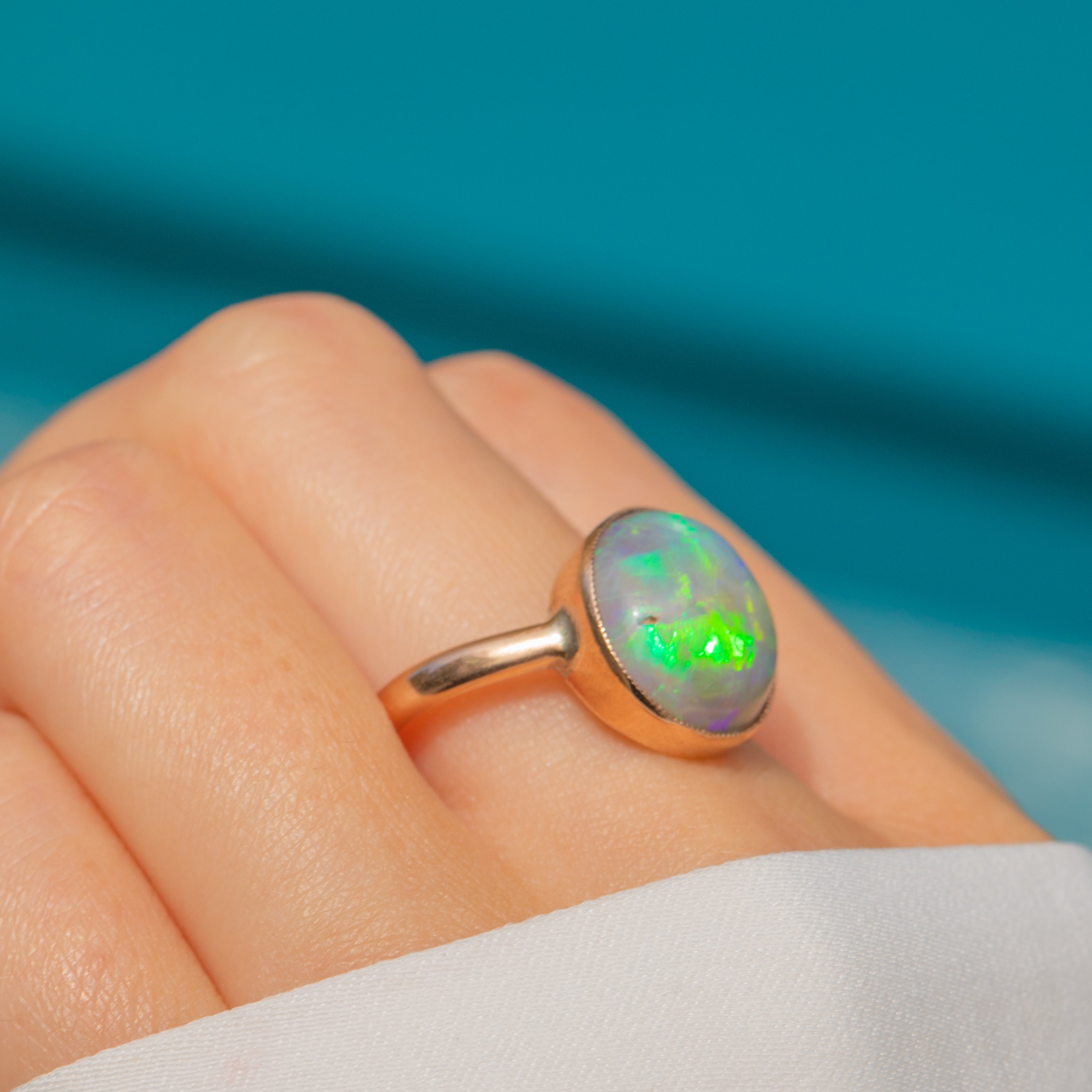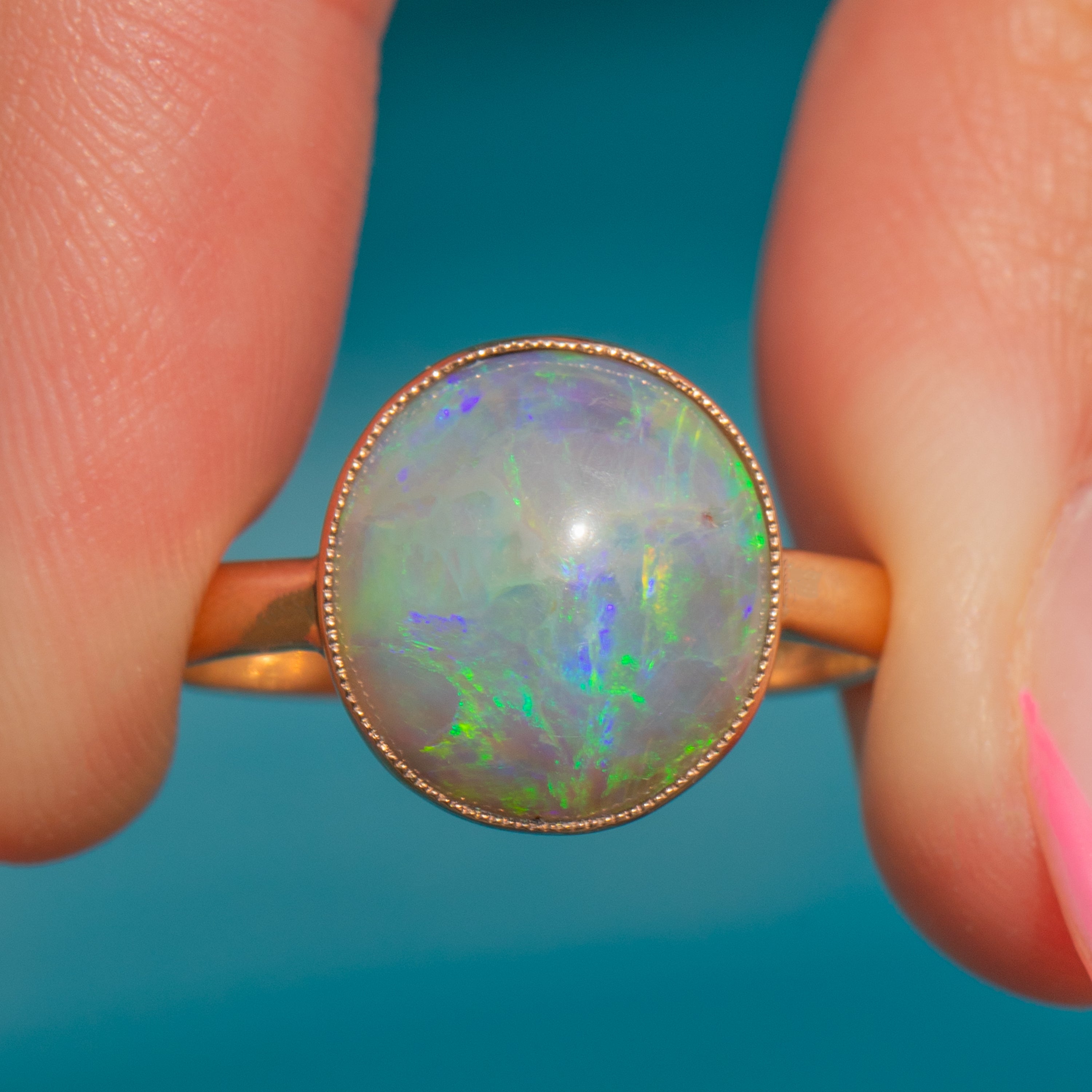 Flaunting a plump 3.10ct Black Opal cabochon, this ring radiates a kaleidoscope of sage greens and lilac hues. She is set within a rosy 9ct Gold bezel, the buttery 9ct Gold effortlessly complementing the cool tones of her stunning natural Black Opal.