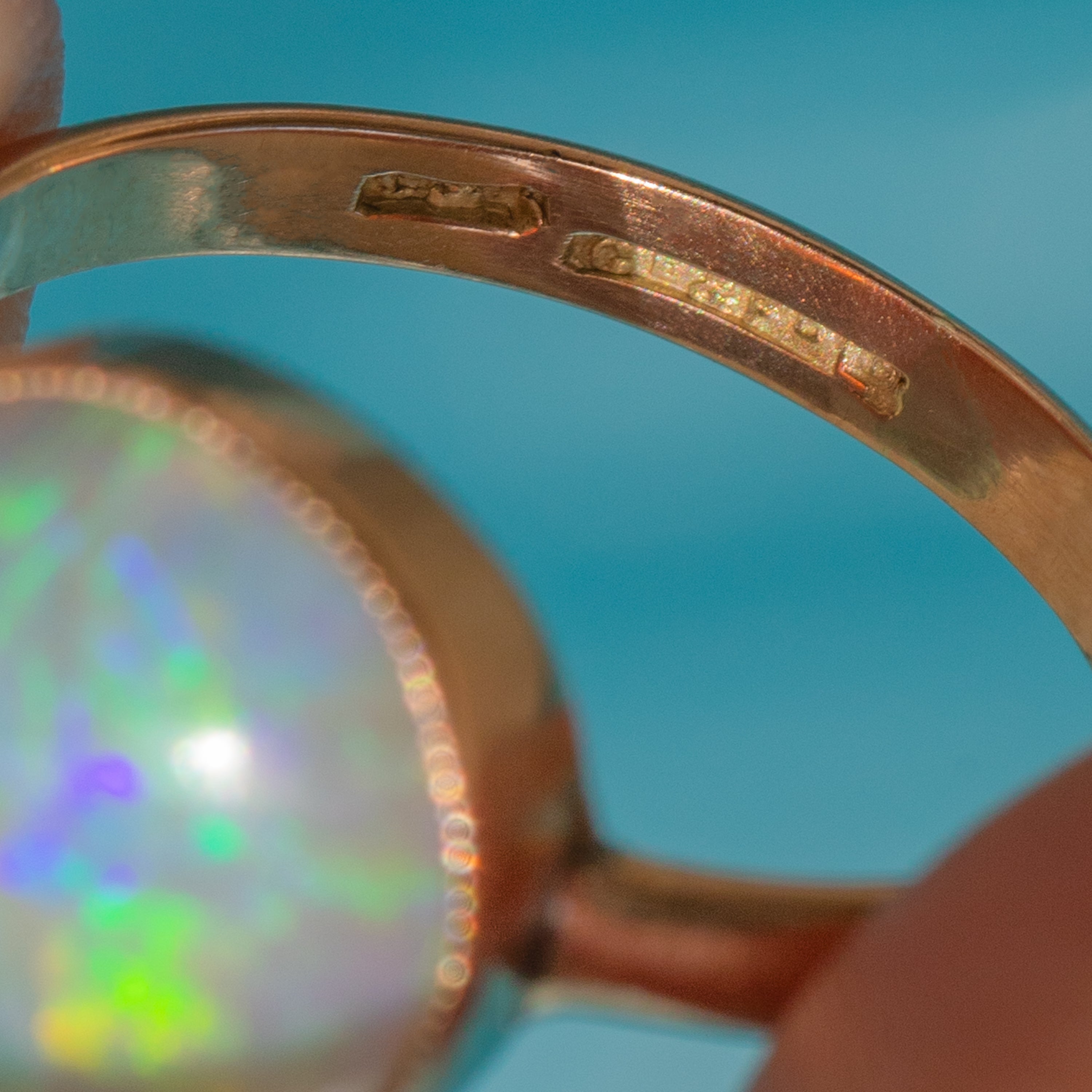 VERY GOOD-EXCELLENT: This antique 9ct Gold Black Opal cabochon ring is in lovely condition. The Opal is vibrant and has a satisfying, domed surface. There is a darker spot within the Black Opal, which is part of the natural Opal matrix. She is secure within her Gold bezel, which is warm and glossy, with only minor signs of surface wear. A comfortable fit, you can wear this antique Opal ring with utmost confidence!