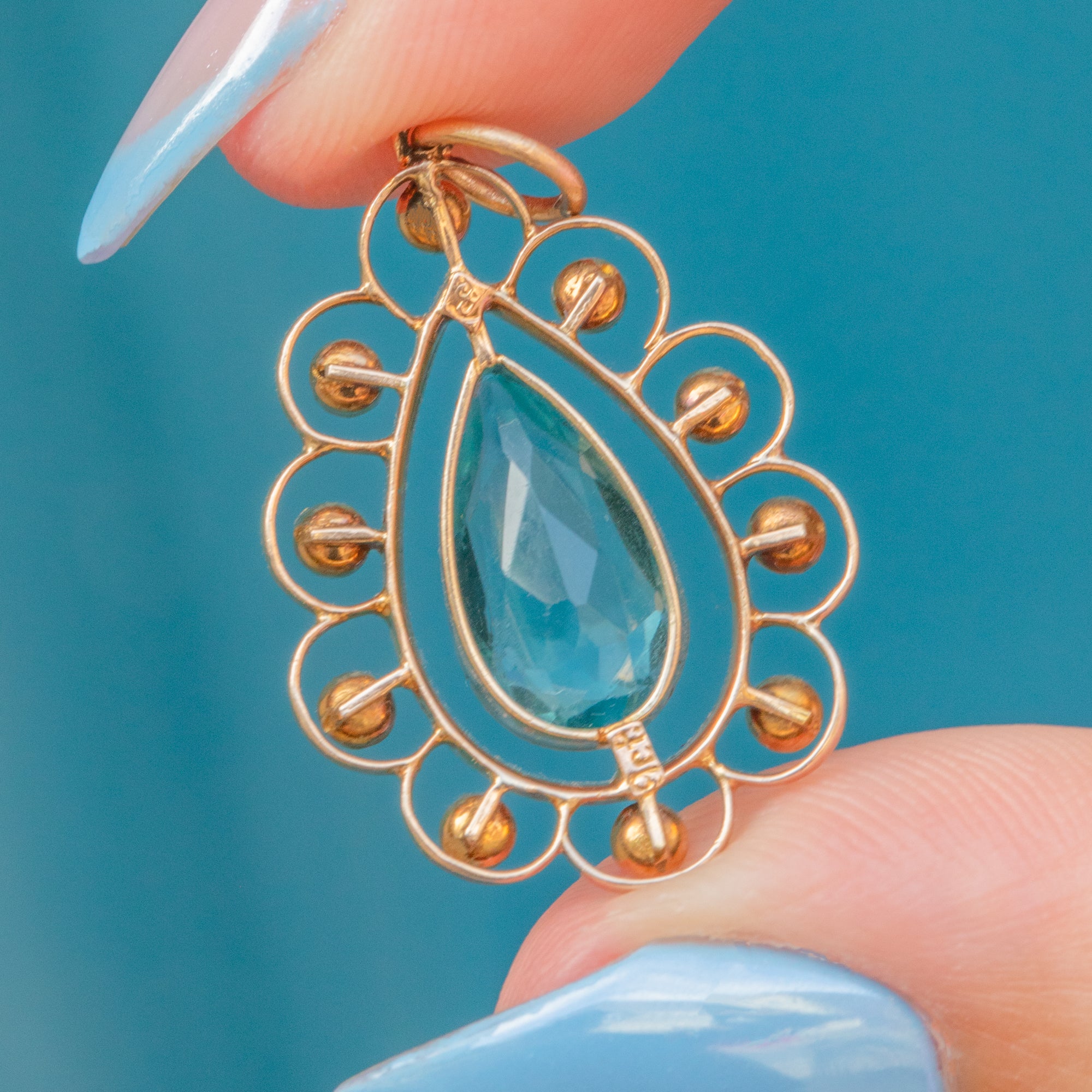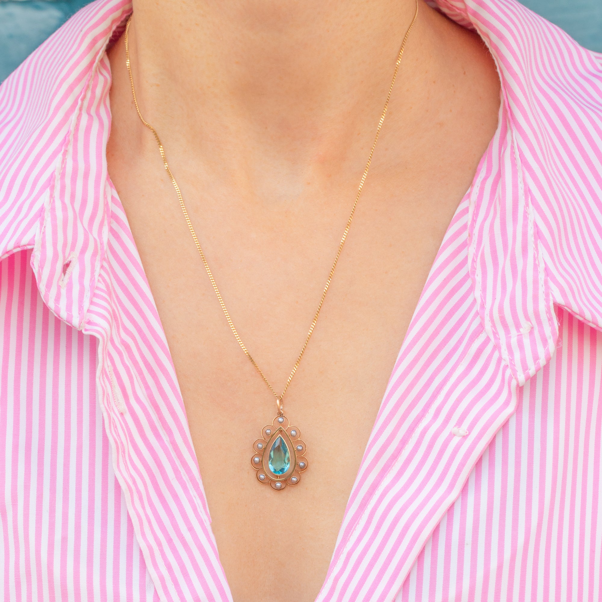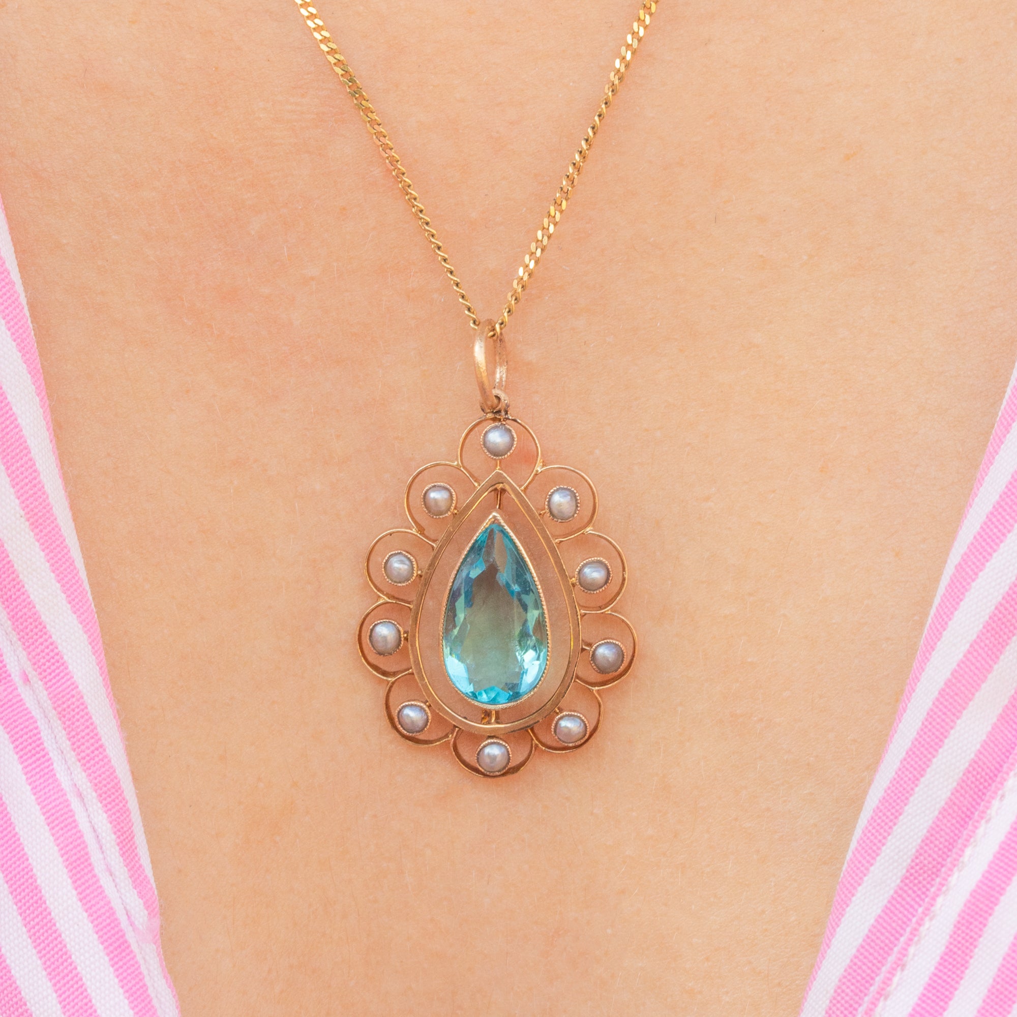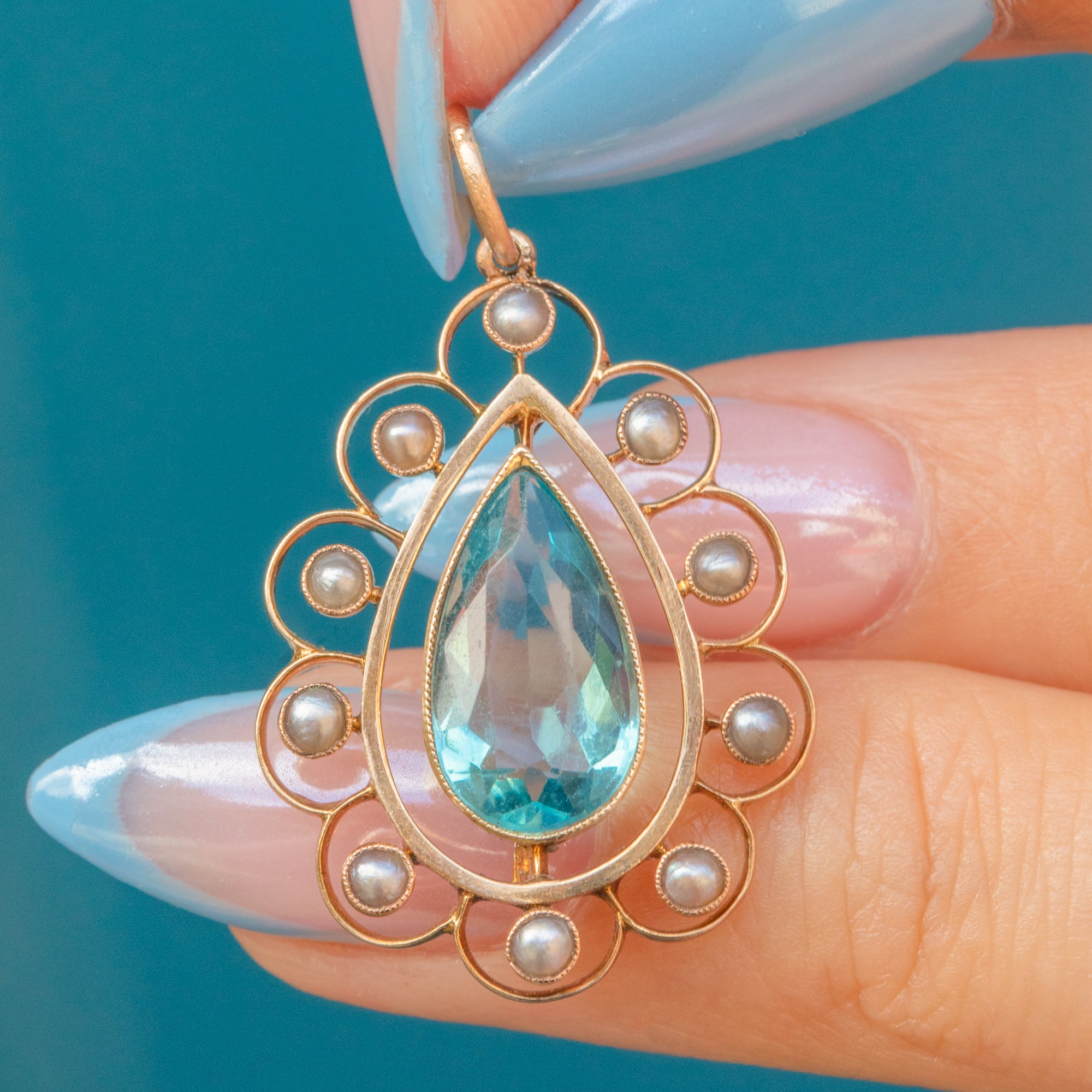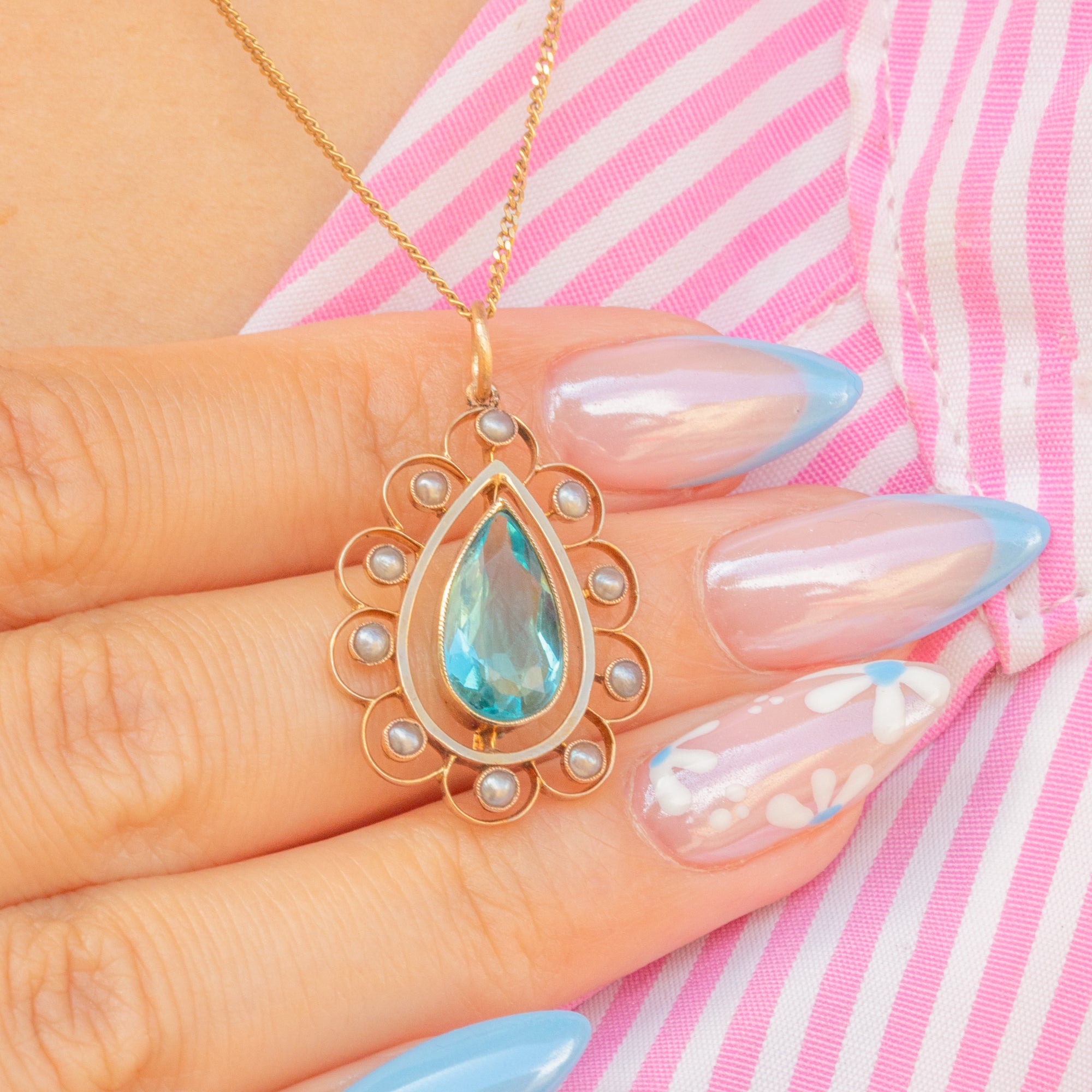 This pear-shaped Edwardian drop pendant is centred by a plump blue Paste, adorned by a halo of iridescent Pearls. Each gemstone is set within bright and glossy 9ct Gold openwork settings, adding a striking finish.