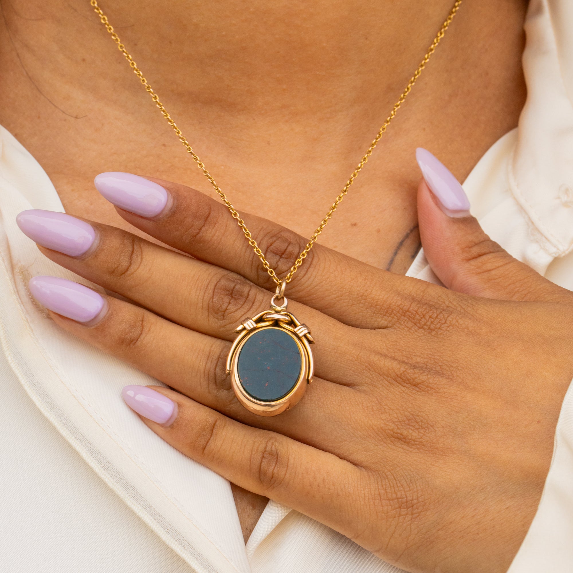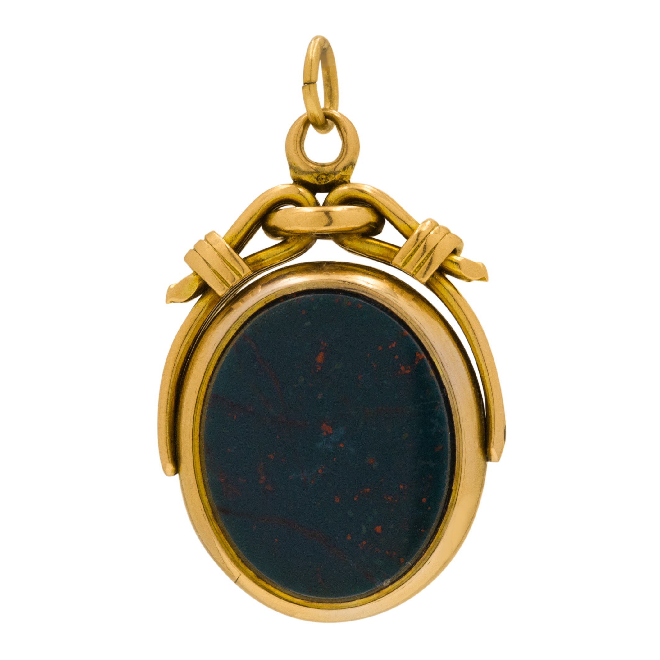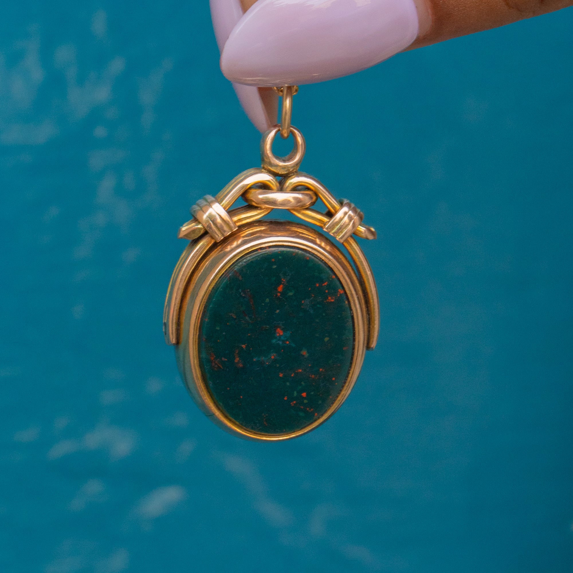 EXCELLENT. This antique 9ct Gold Carnelian Bloodstone swivel fob pendant is in excellent condition. Given the age of the piece, this pendant has lasted very well. The 9ct Gold is sleek and buttery, and while the hallmarks have faded slightly, they are still legible allowing us to accurately date the piece to 1884. Both the Bloodstone and Carnelian have remained secure and smooth!