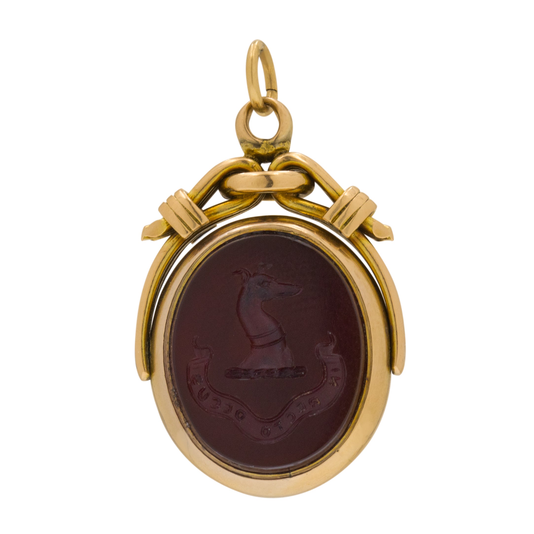 Antique 9ct Gold Carnelian Bloodstone Swivel Fob Pendant, 'In Recto Dues' - There is Honour in the Right Path