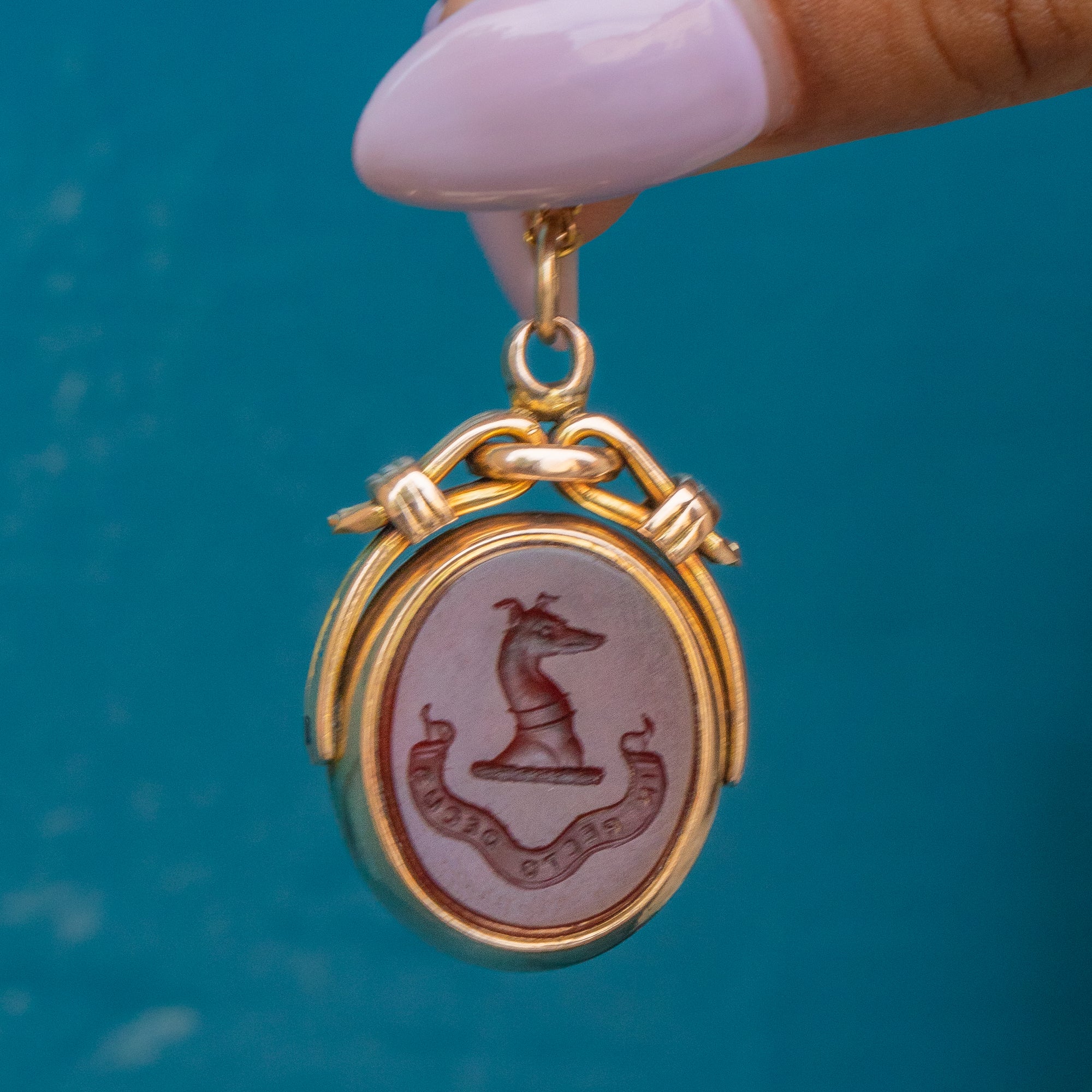 This is an impeccable antique 9ct Gold Carnelian Bloodstone swivel fob pendant. Set with a smooth oval cut of Bloodstone and Carnelian, this Victorian fob comes complete with an intaglio that reads 'In Recto Dues' which translates to 'there is honour in the right path', inscribed into the Carnelian.