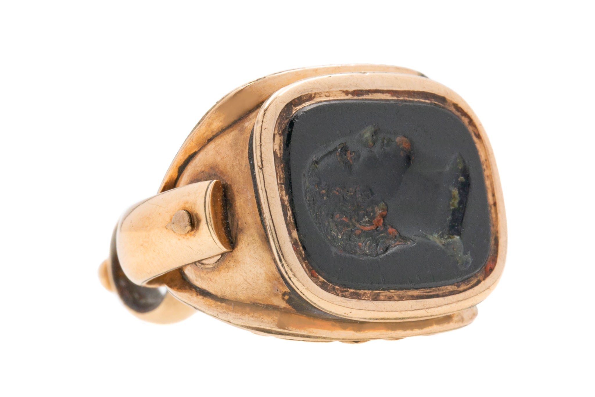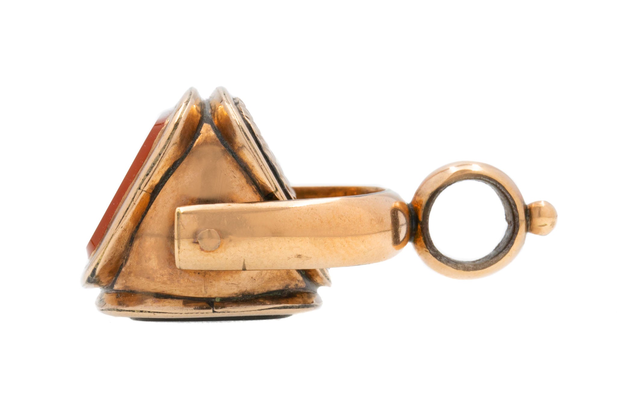 What a wonderful antique 9ct Gold cased triple sided spinner fob pendant! This authentic Victorian piece has a smooth and warm toned Carnelian, a fully textured side and Bloodstone intaglio of what looks to be Julius Caesar.