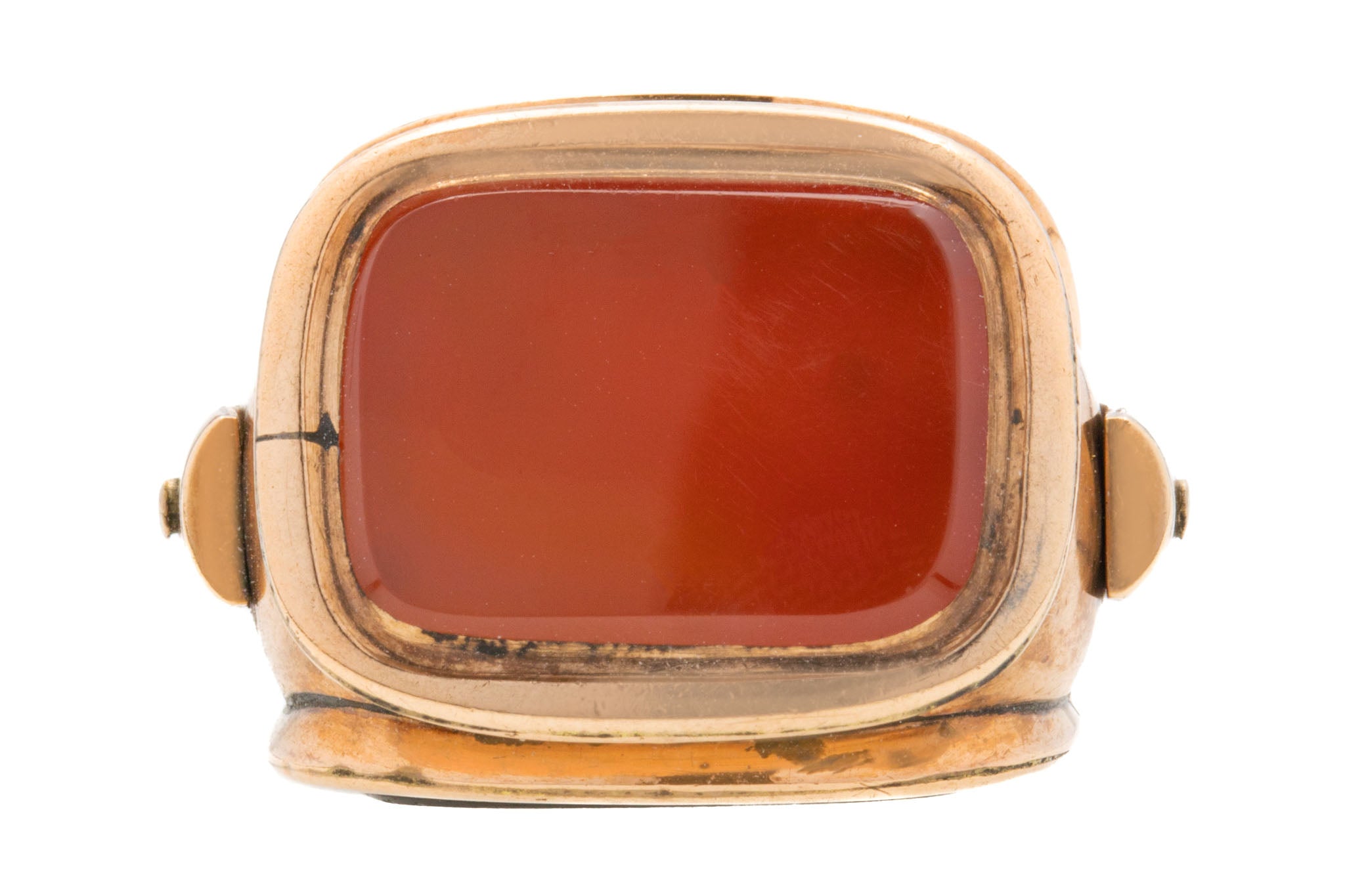 MATERIALS:  Tests as 9ct Gold cased fob, Bloodstone, Carnelian.