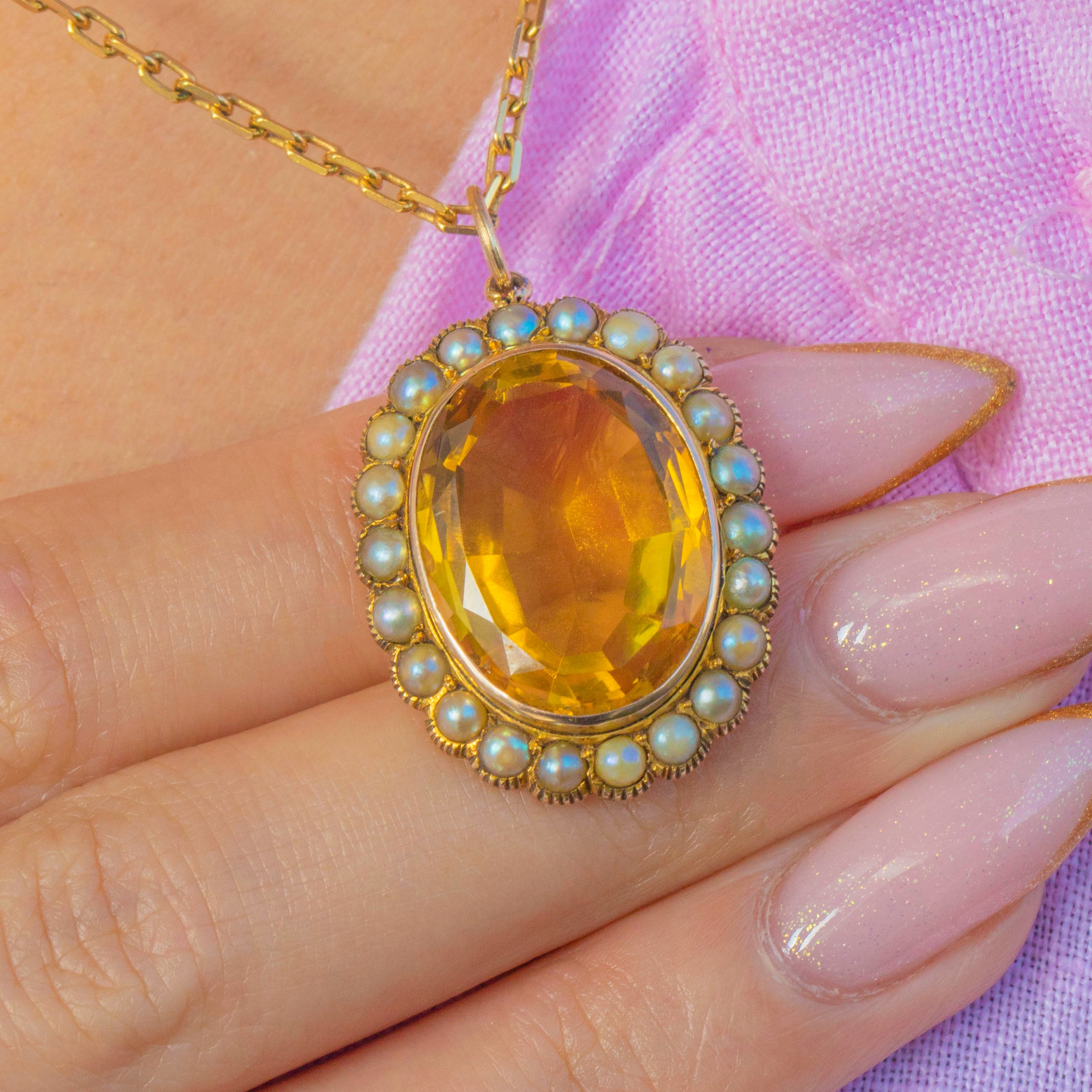 Antique 9ct Gold Citrine Pearl Cluster Pendant 10.40ct