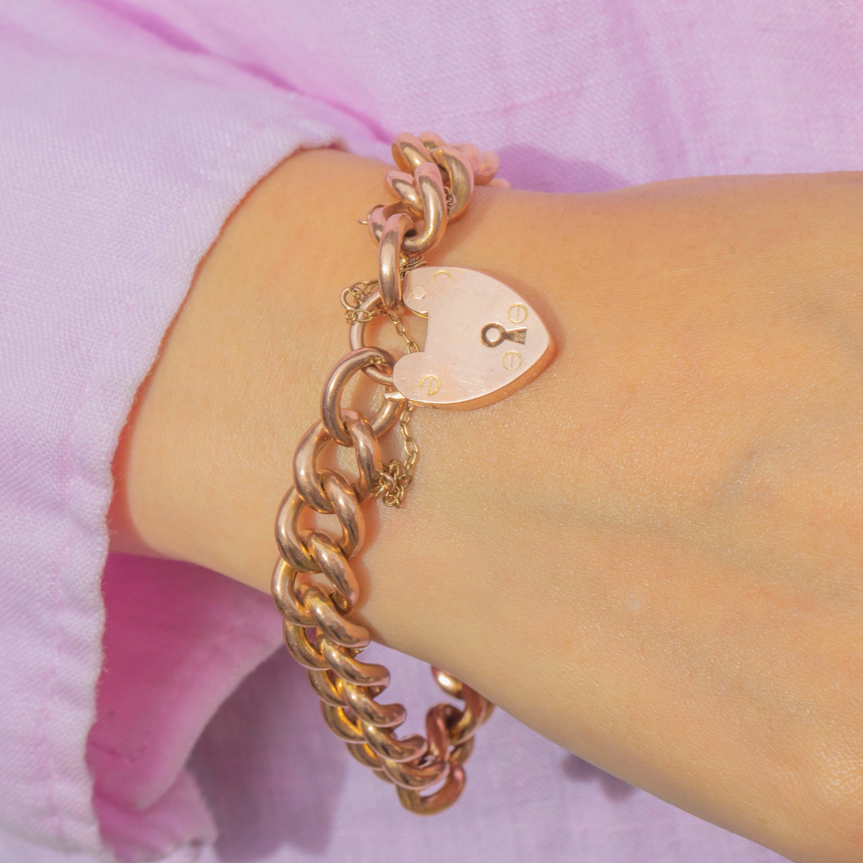 This antique Victorian bracelet is crafted in solid 9ct Gold, with classic puffy curb links and a traditional (working!) heart-shaped padlock clasp.