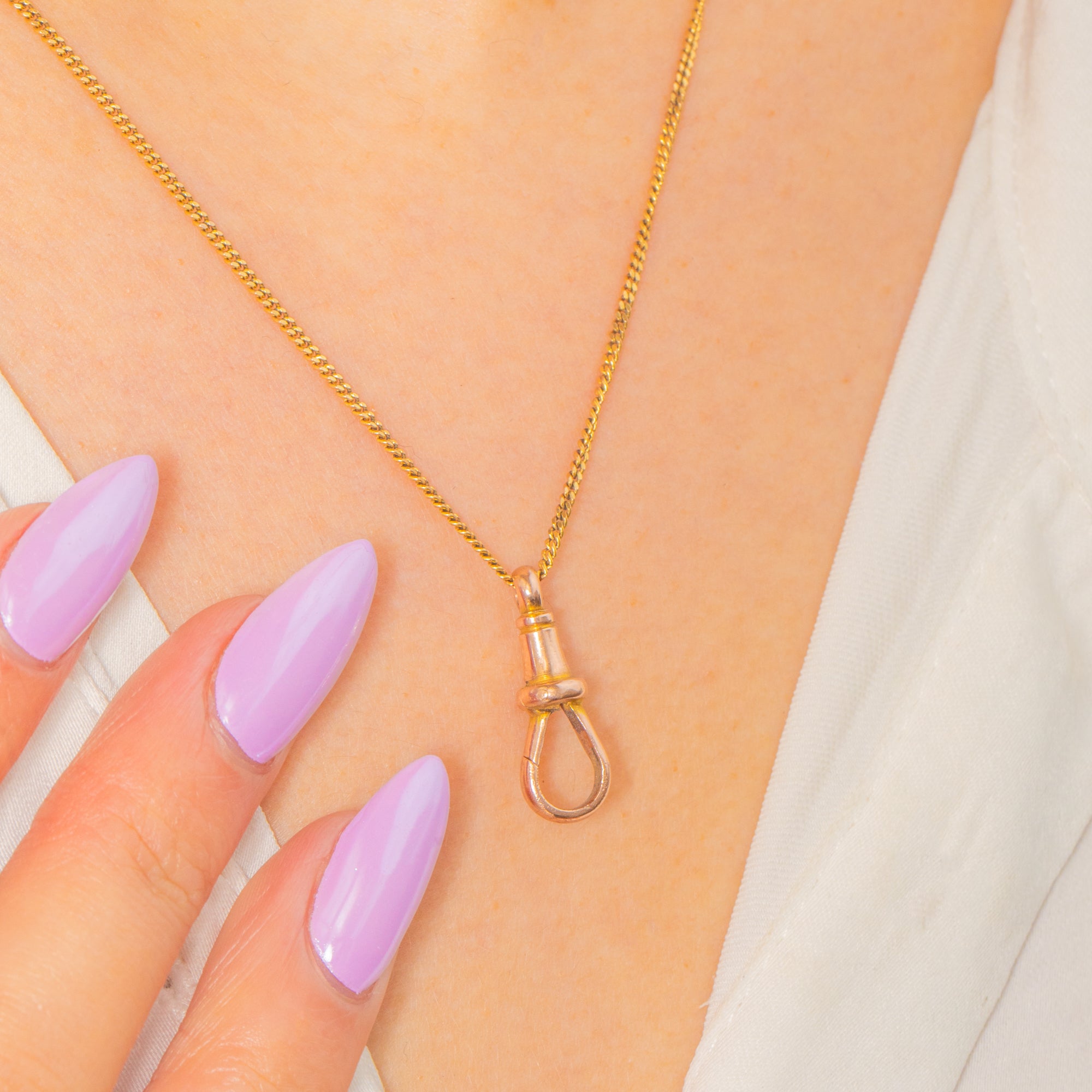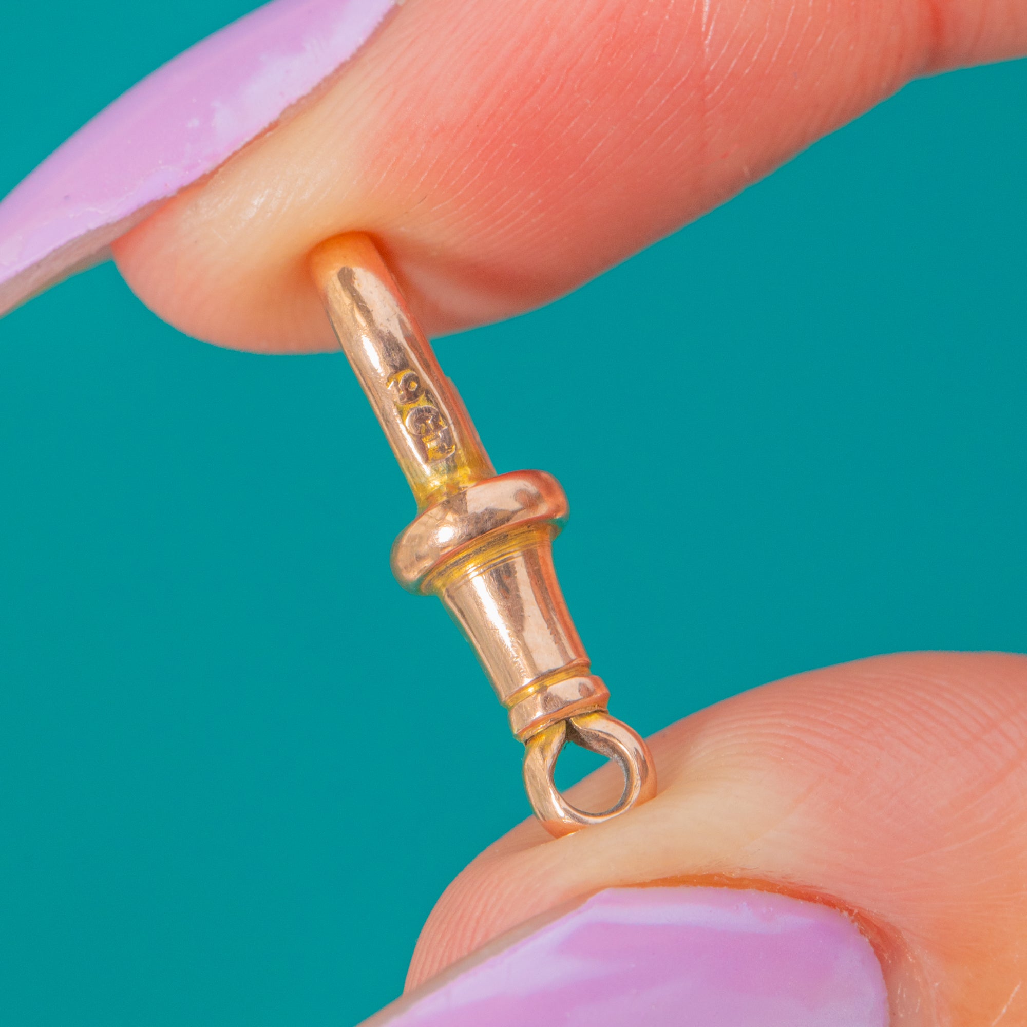 A timeless Victorian 9ct Gold dog clip, sleek and refined in its proportions with a smooth tubular collar and elegant drop loop. Understated and beautifully practical, it’s the perfect finishing touch for styling charms, pendants or fobs with effortless ease.
