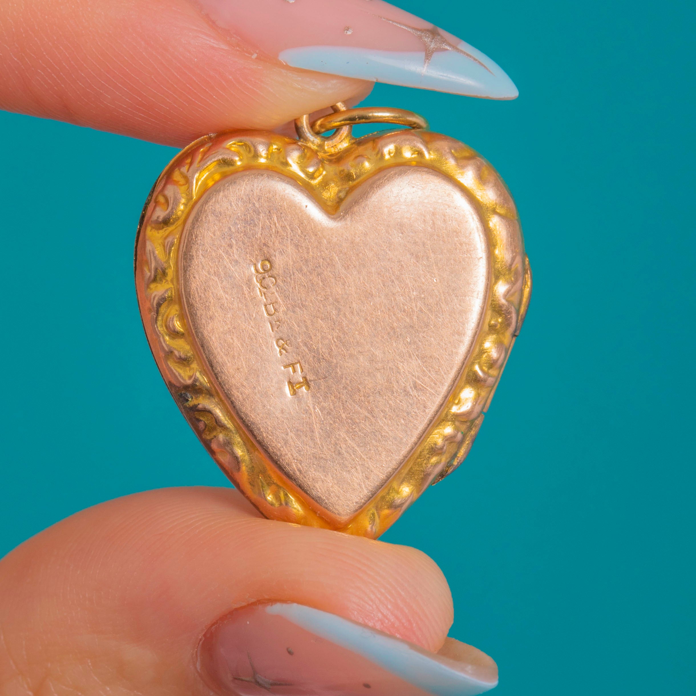 Petite, romantic and beautifully preserved, this Edwardian heart locket is crafted in 9ct Gold back & front with a traditional embossed and engraved design. The raised scrolling border catches the light with a soft glow, while the central heart offers a timeless canvas for personalisation—perfect for adding an initial or two.
