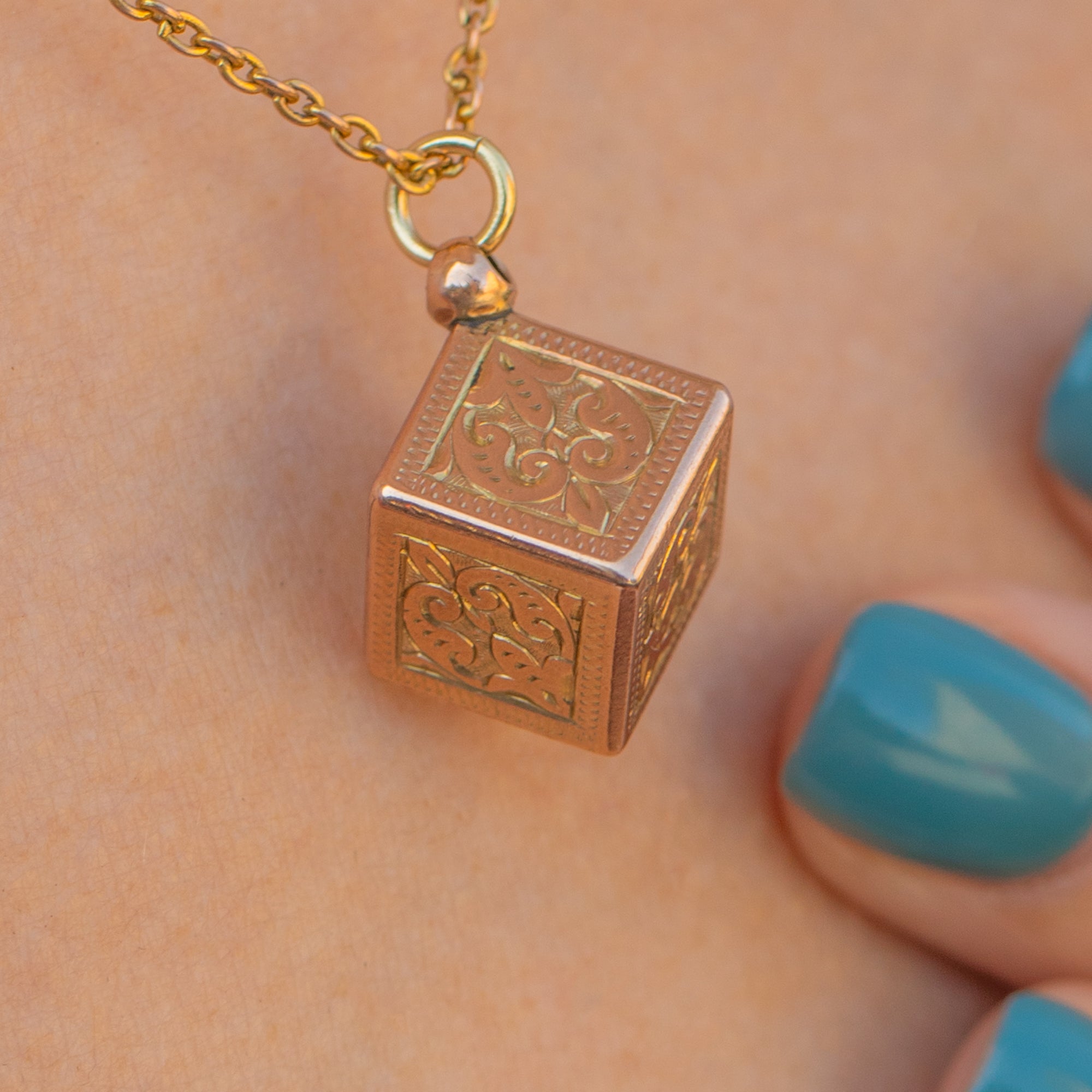 VERY GOOD. This antique 9ct Gold engraved cube charm is in very good condition. Her engraved patterns are crisp and clear and the Gold has retained its wonderful buttery hue. There is one small hole at the very base of the piece which you can't see when you wear it. Her jump ring is in fabulous condition so affix her to a pendant chain or charm bracelet and show her off straightaway!