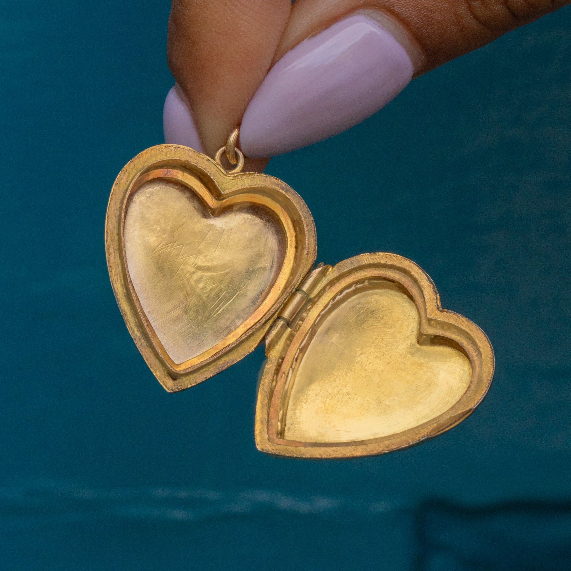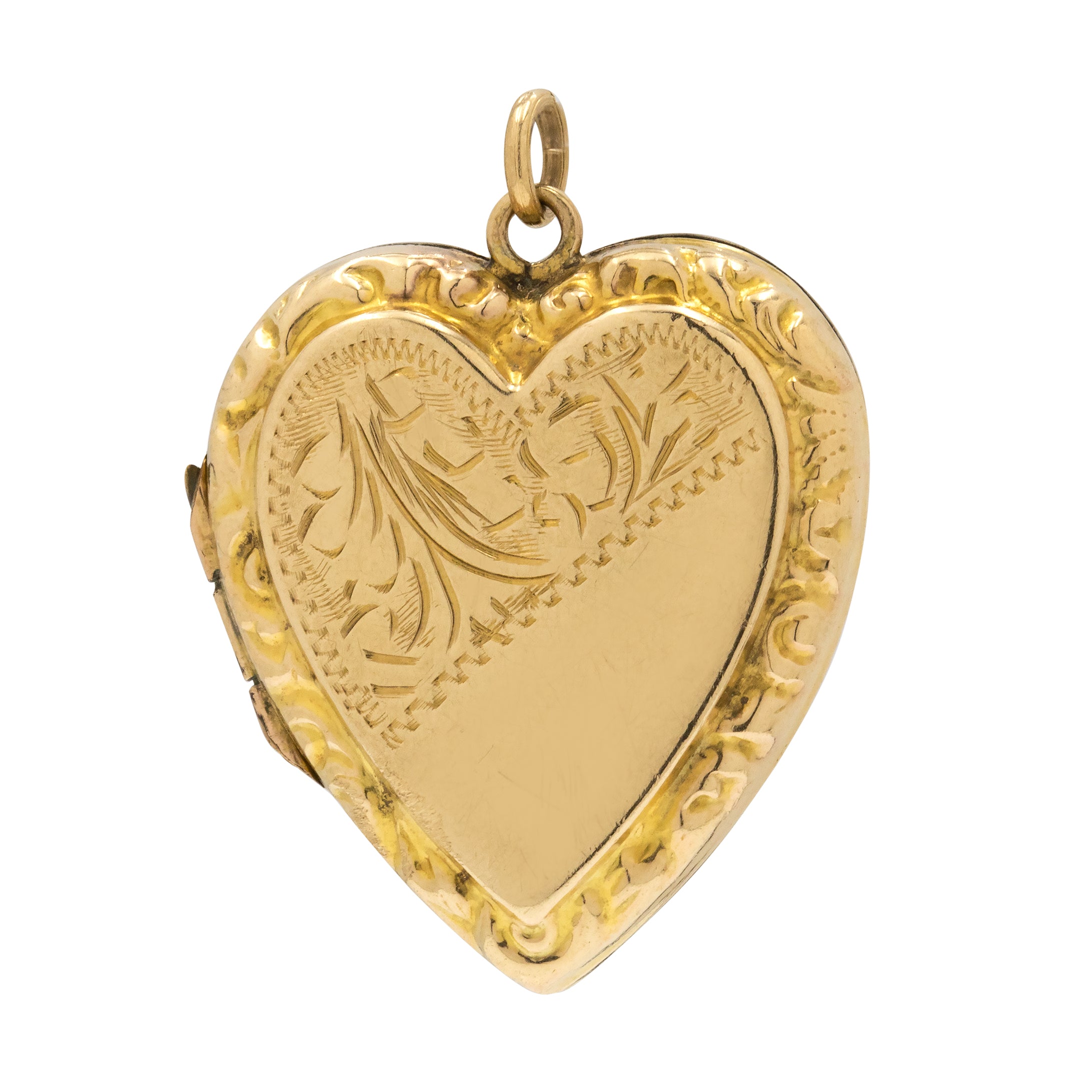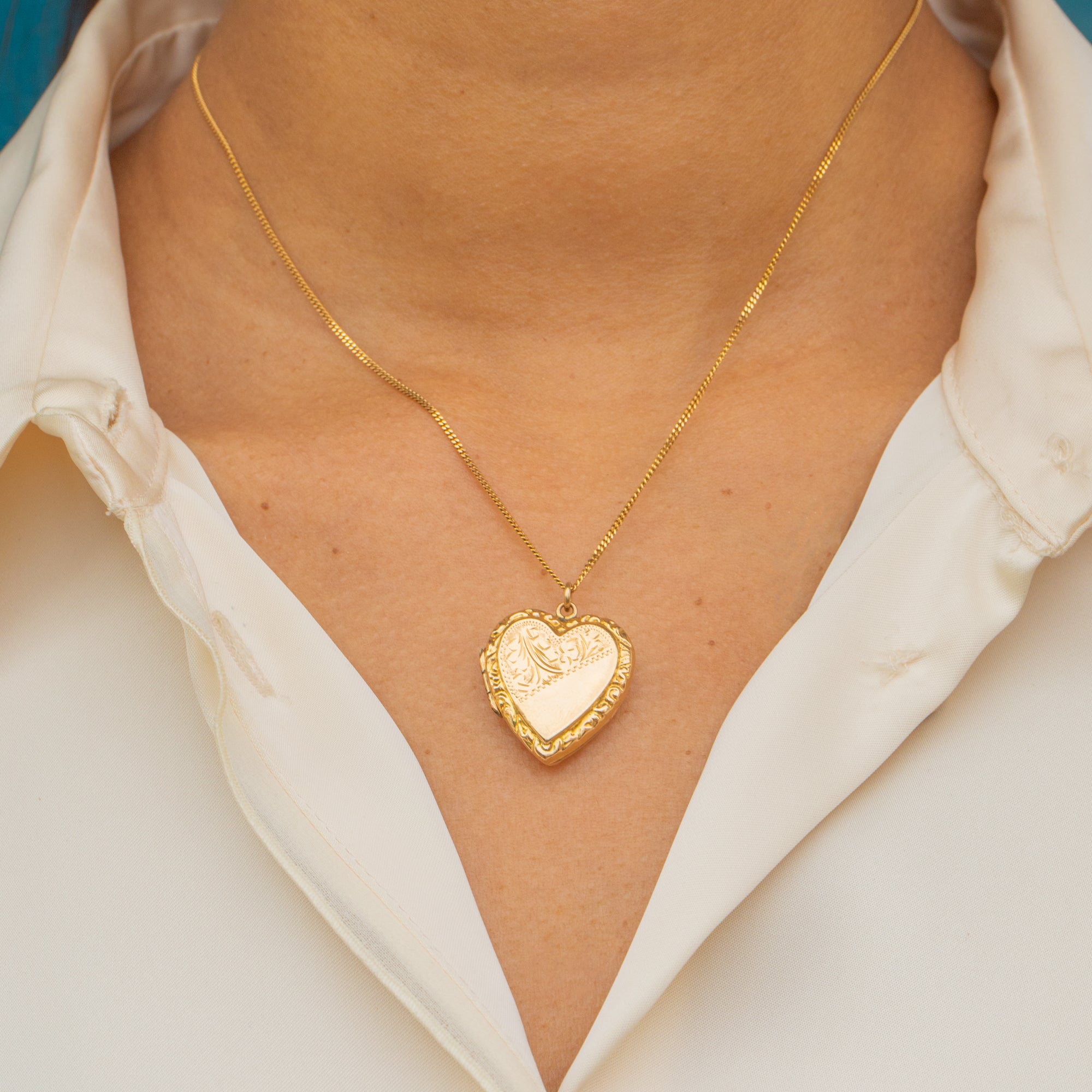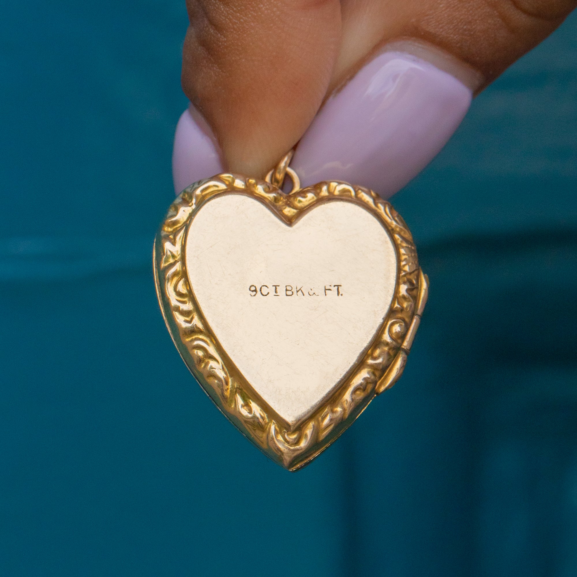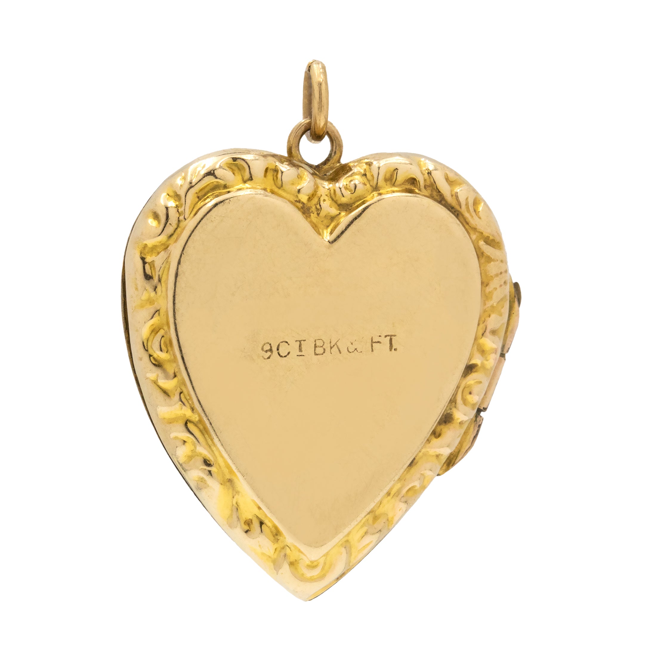 GOOD-VERY GOOD. This antique 9ct Gold engraved heart locket is in great condition! The engravings and repoussé detailing on either side are crisp and add a flare of femininity. On the front, there is a scratch mark on the edge of the heart and a small ding on the back, but this can only be seen under close inspection. Although her doors don't shut with a click, the hinges are slightly stiff meaning the doors remain closed. With two frames inside she is ready to hold two of your chosen photographs.