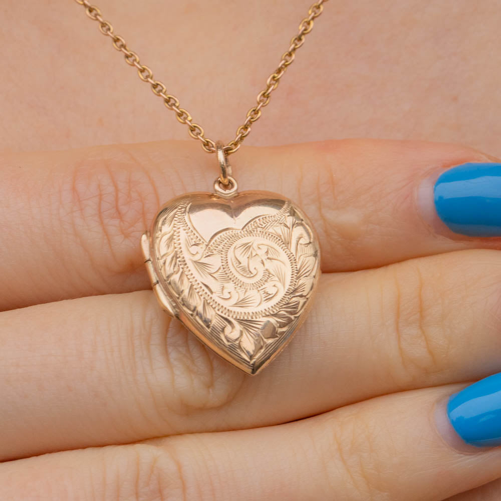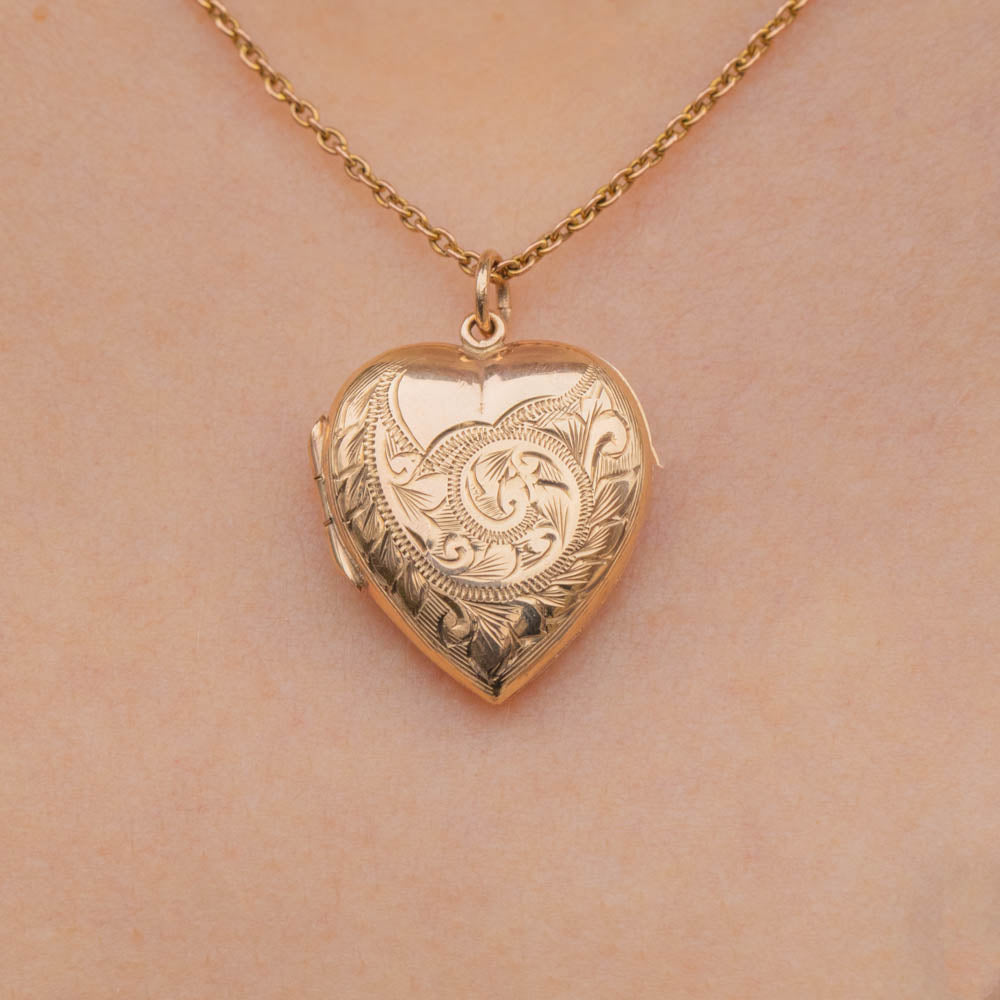 VERY GOOD-EXCELLENT. This 9ct Gold engraved heart locket is in superb condition. The engravings are crisp and the Gold is buttery with only very minor signs of wear on the back of the locket. With both frames still intact and the doors closing securely will a "click", you can be sure that your cherished photographs will be held safely inside.