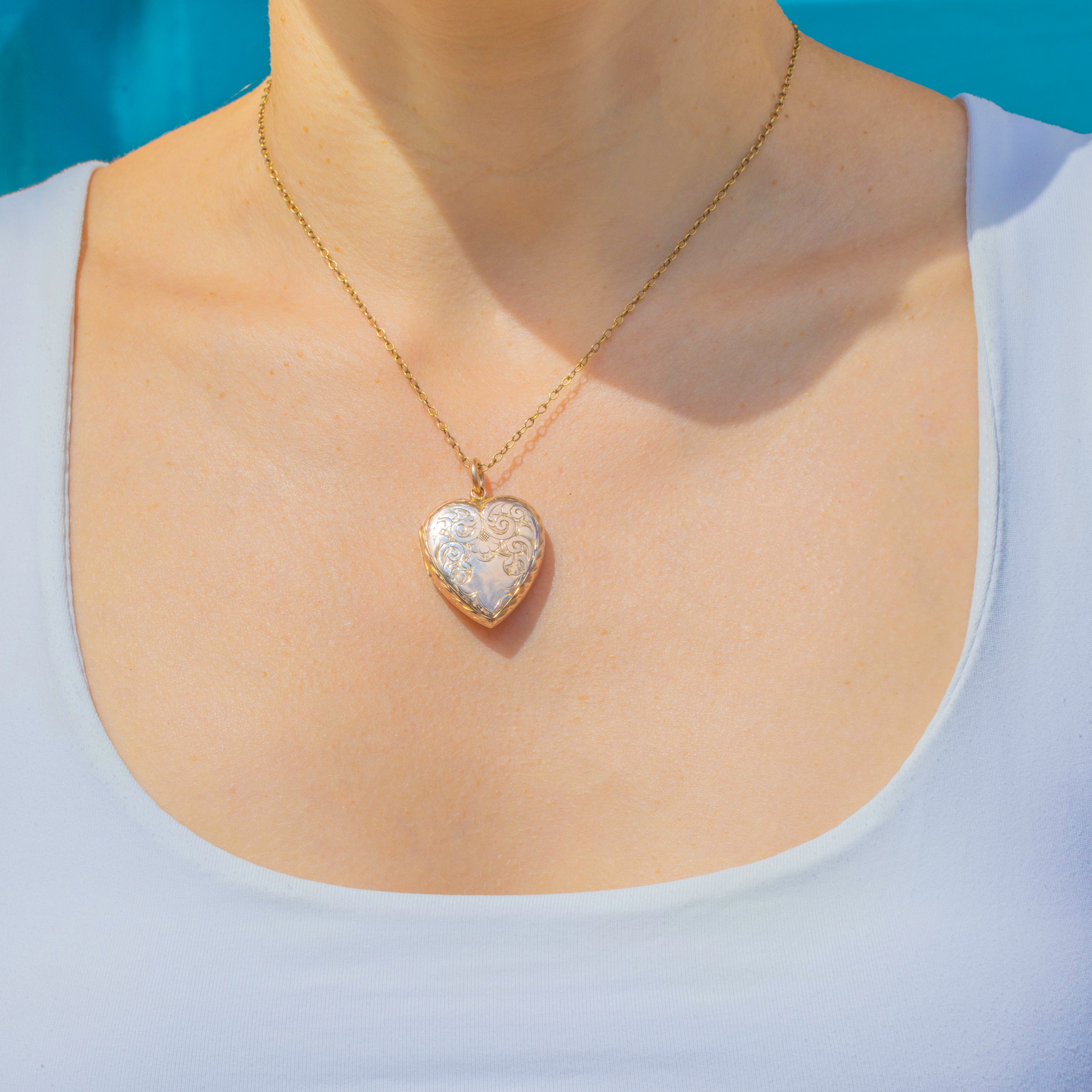 This Edwardian heart locket is crafted from bright and glossy 9ct Gold, displaying romantic floral and baroque-style swirl engravings on both sides.