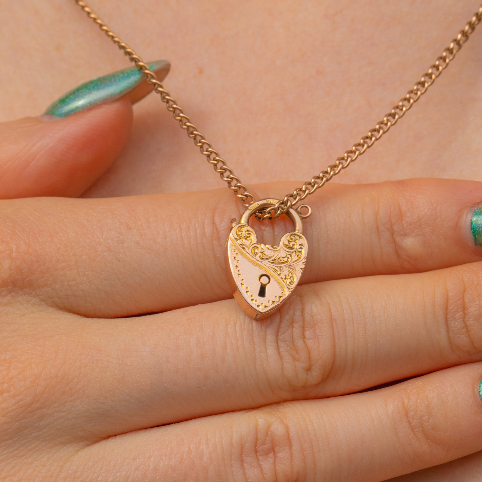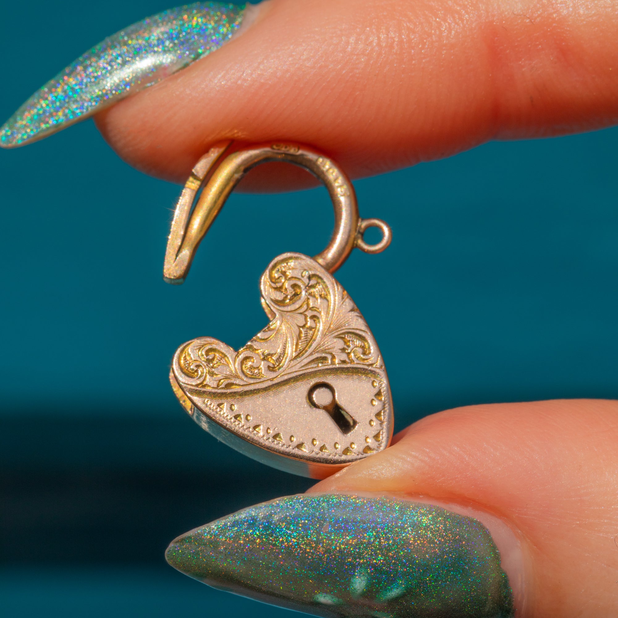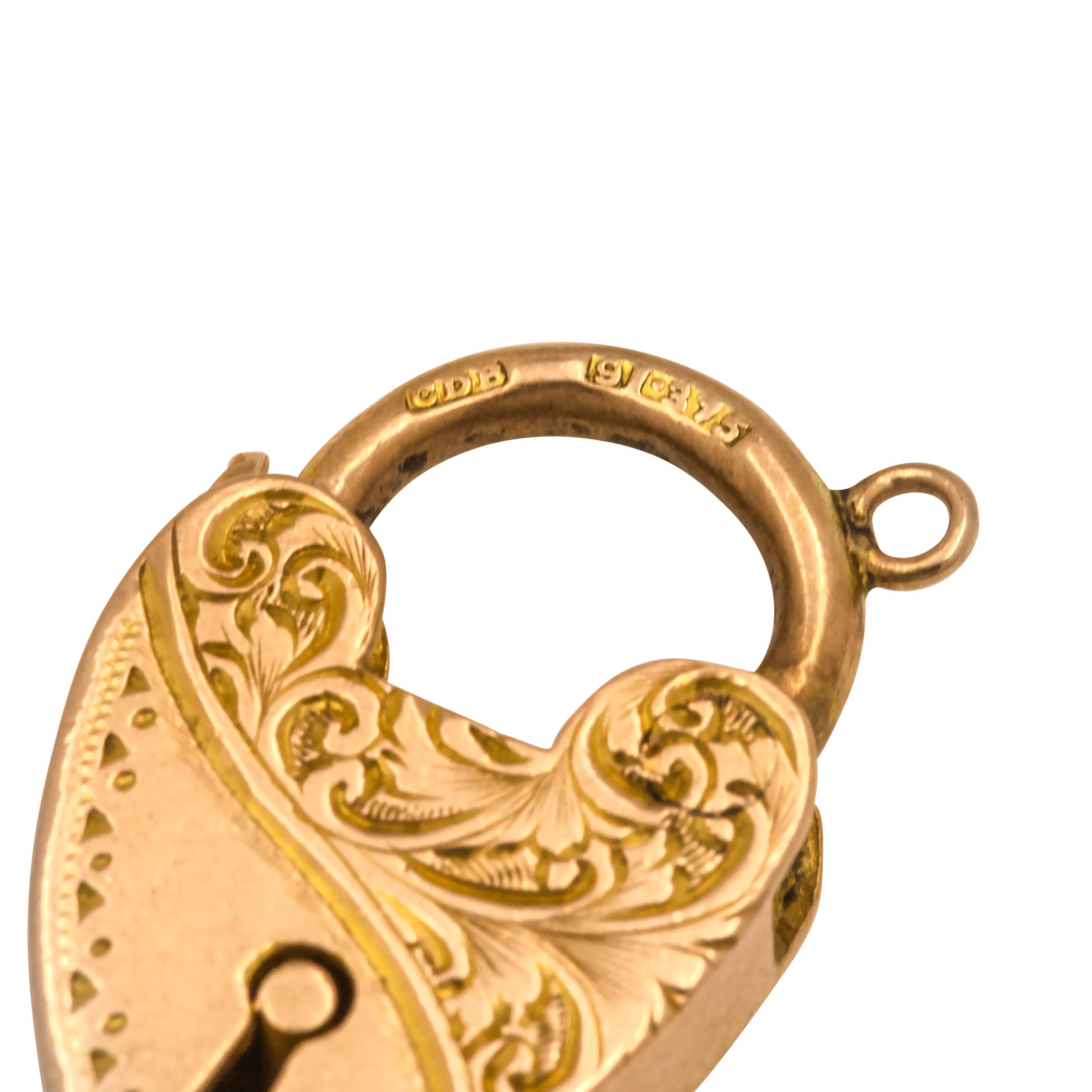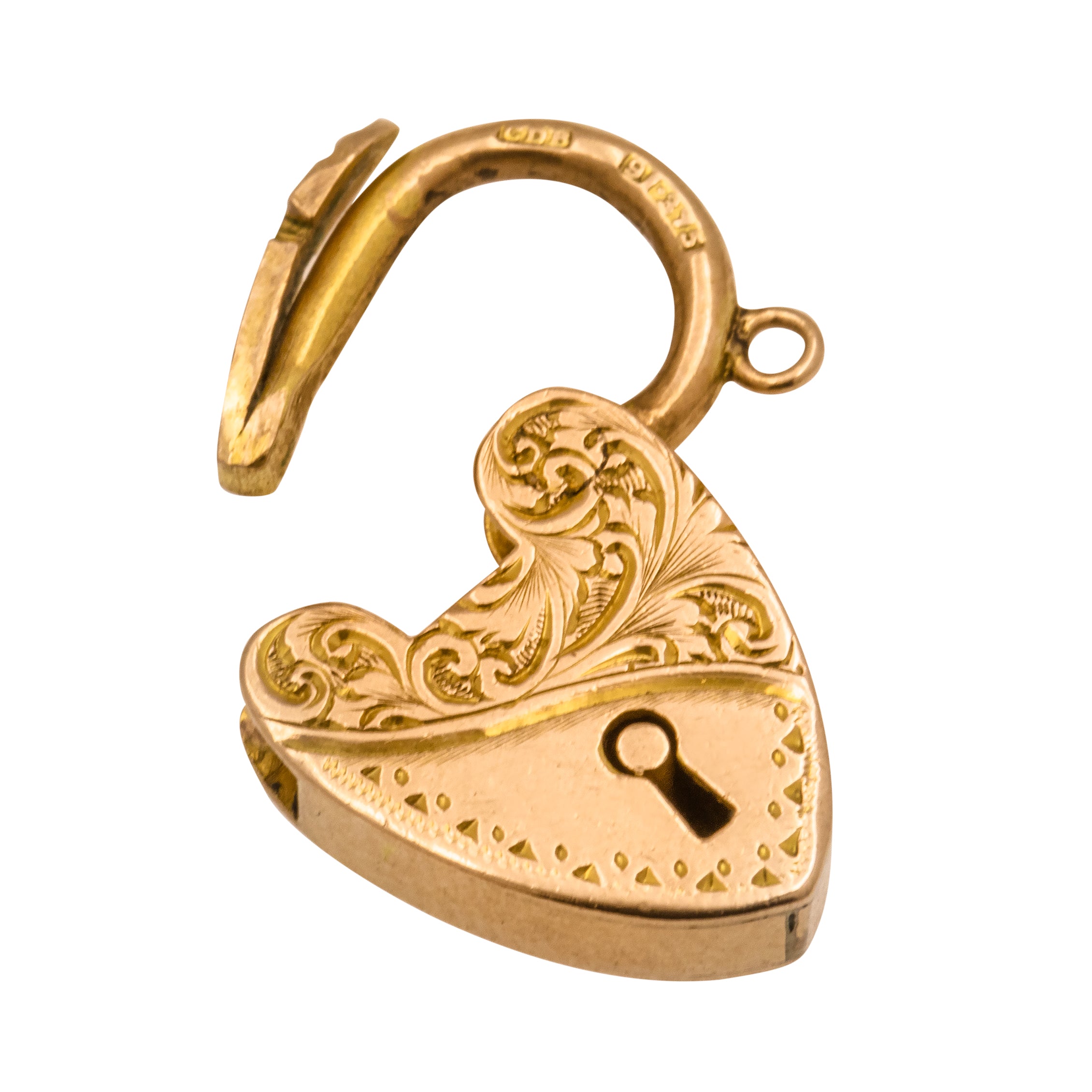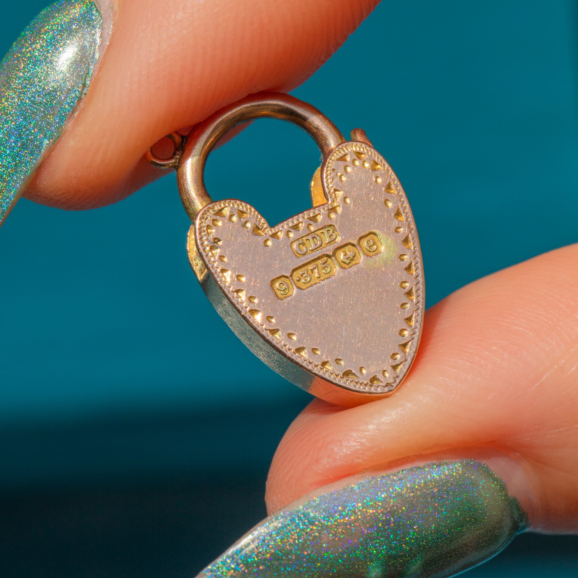 EXCELLENT. This antique 9ct Gold engraved heart padlock is in excellent condition. Her engravings are crisp and the Gold has a wonderful saturation throughout. With the padlock mechanism closing with a firm 'click', she can be worn with the utmost confidence!
