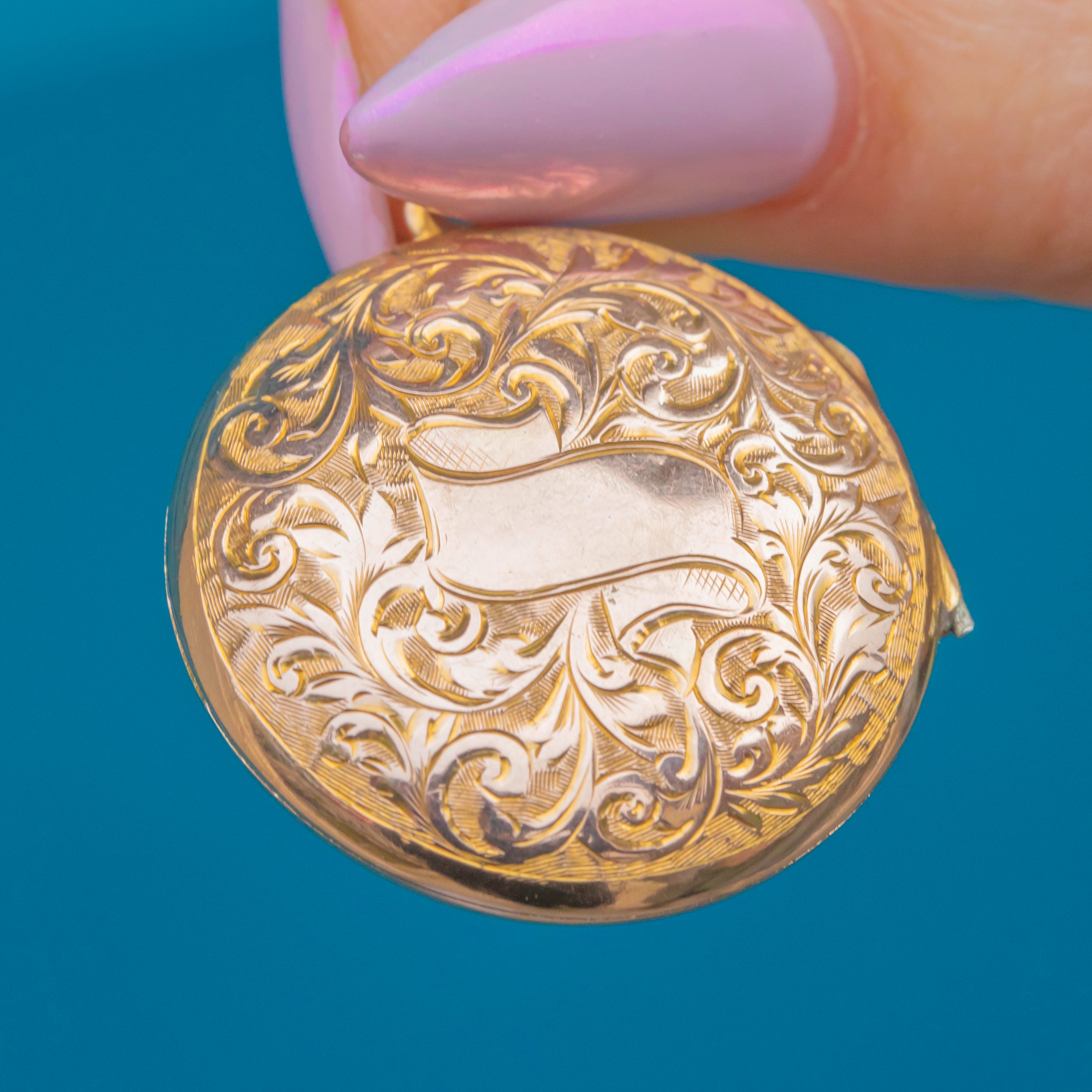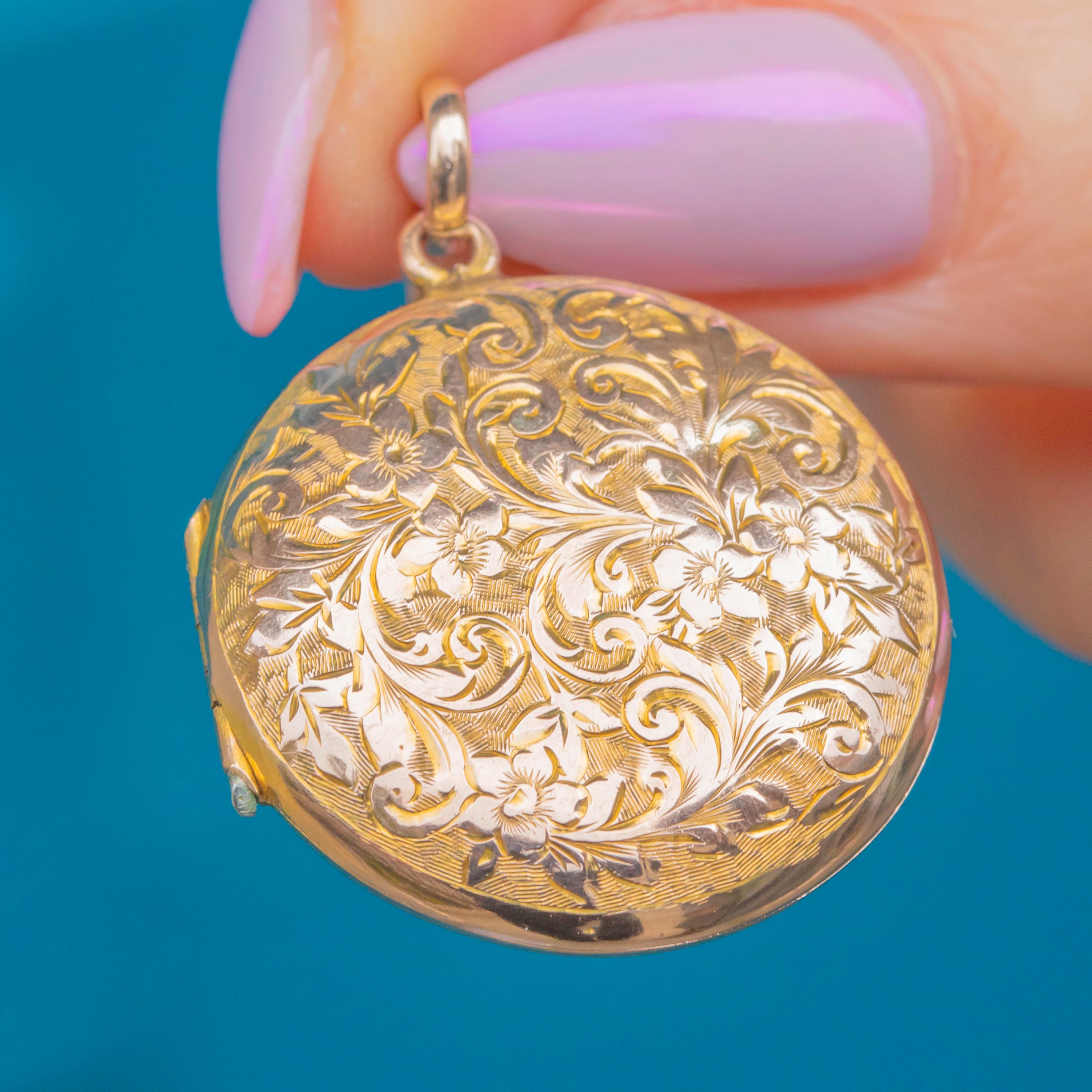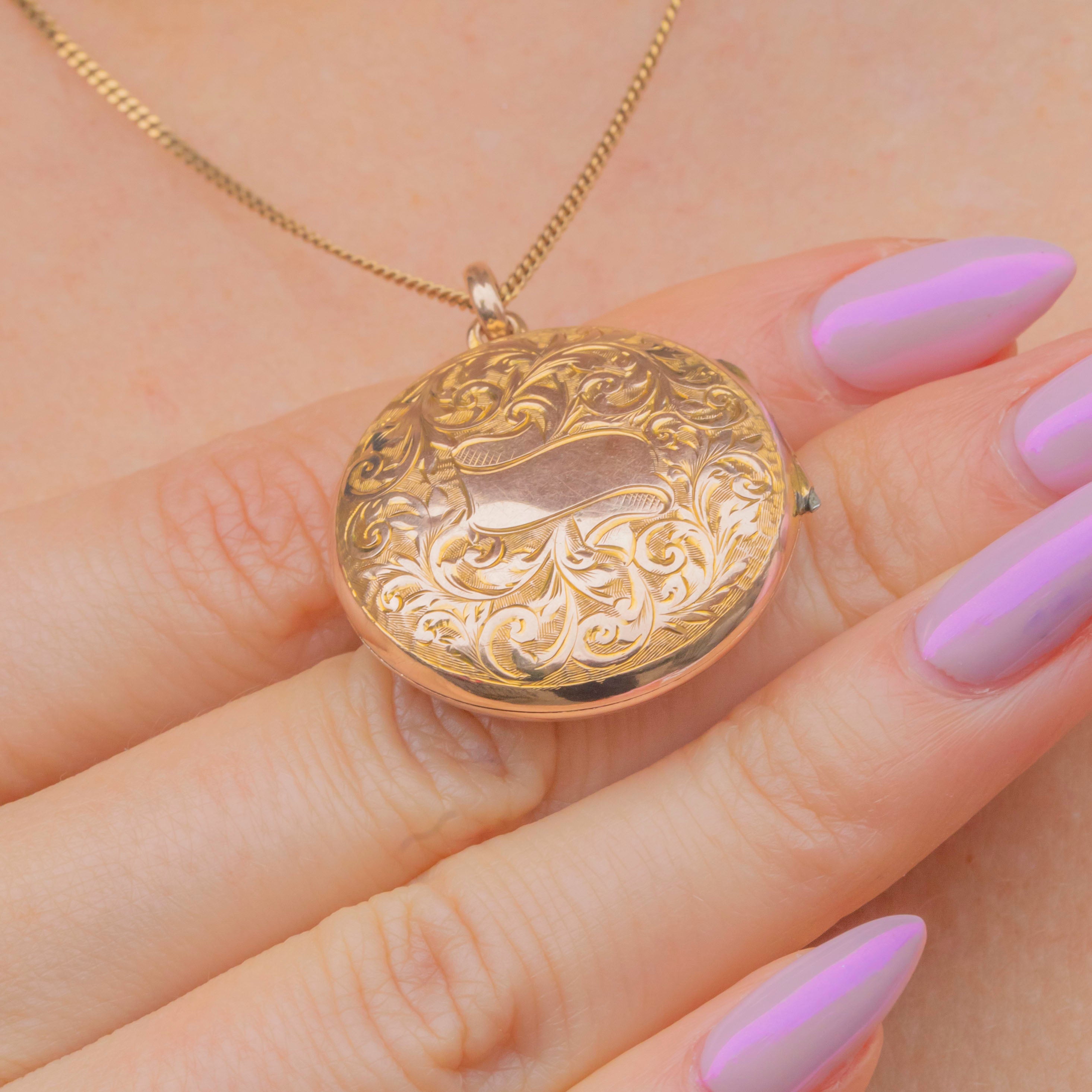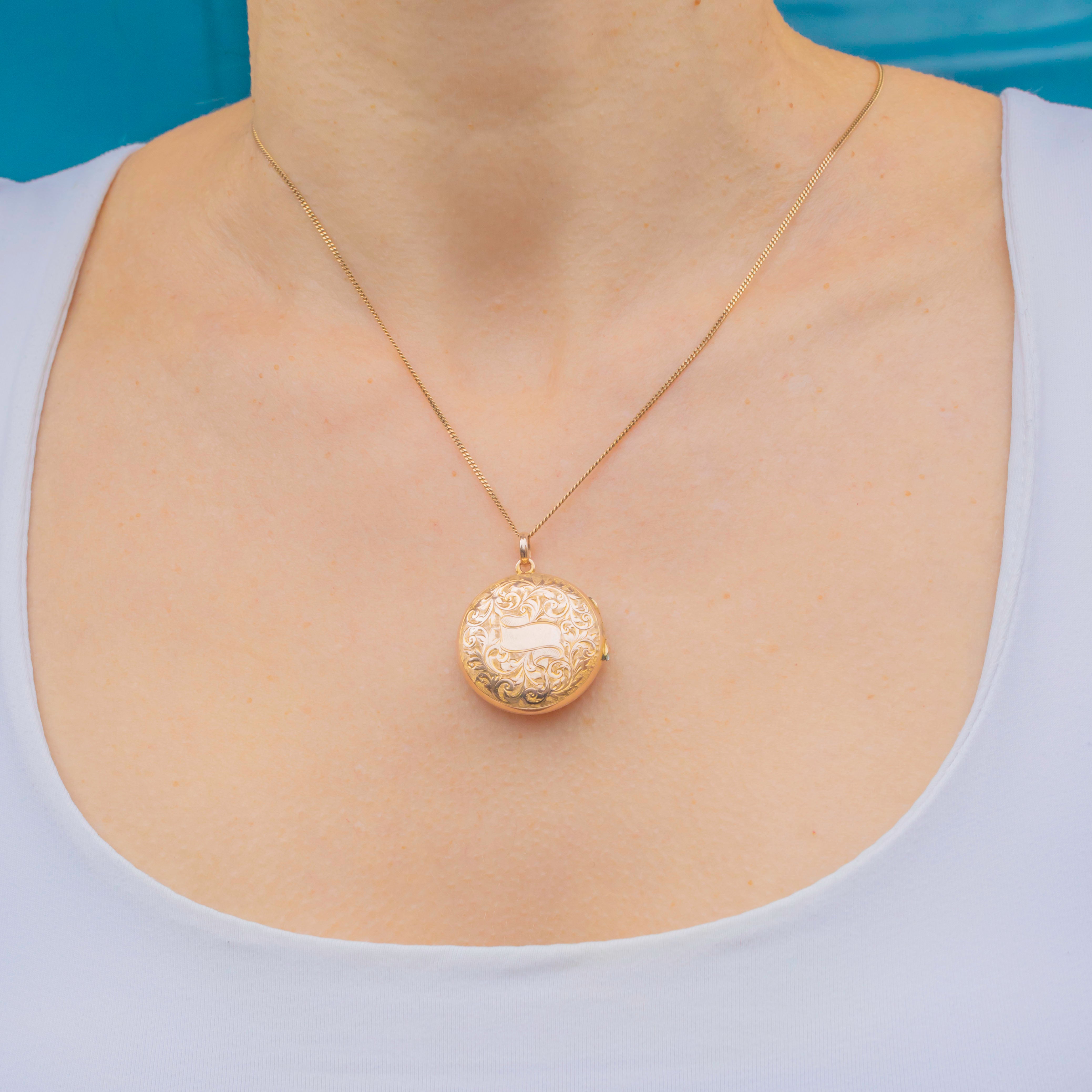 This beautiful Victorian locket is a fine example of late-19th-century craftsmanship, superbly made in solid 9ct Gold with a satisfyingly weighty feel. Both sides are intricately engraved with scrolling floral motifs, each line sharply executed and wonderfully crisp for its age.