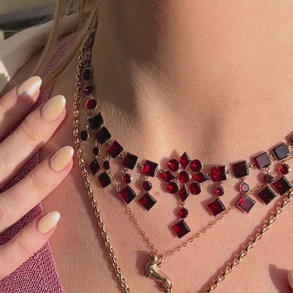 VERY GOOD-EXCELLENT. This antique 9ct Gold flat-cut Garnet fringe necklace is in lovely condition. The Garnets are all secure, and free from damage, which given the age of the piece is quite a feat± The back of the necklace sits comfortably against the skin, and the Gold only has a few little dings to note. The clasp allows for secure closure, so you can wear this necklace confidently!