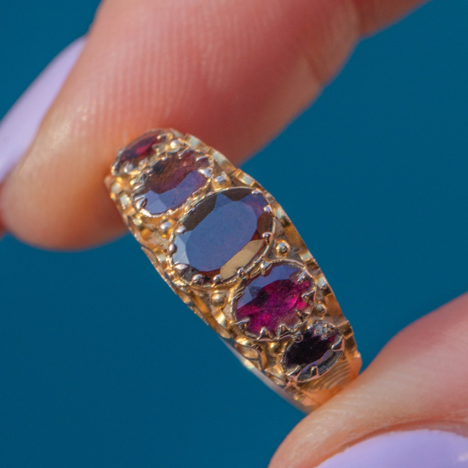 This antique 9ct Gold Garnet five stone ring will inject some early Victorian charm into your collection! The decorative 9ct Gold band is bursting with ornate details and is fully hallmarked to 1851, making it a highly collectible piece.