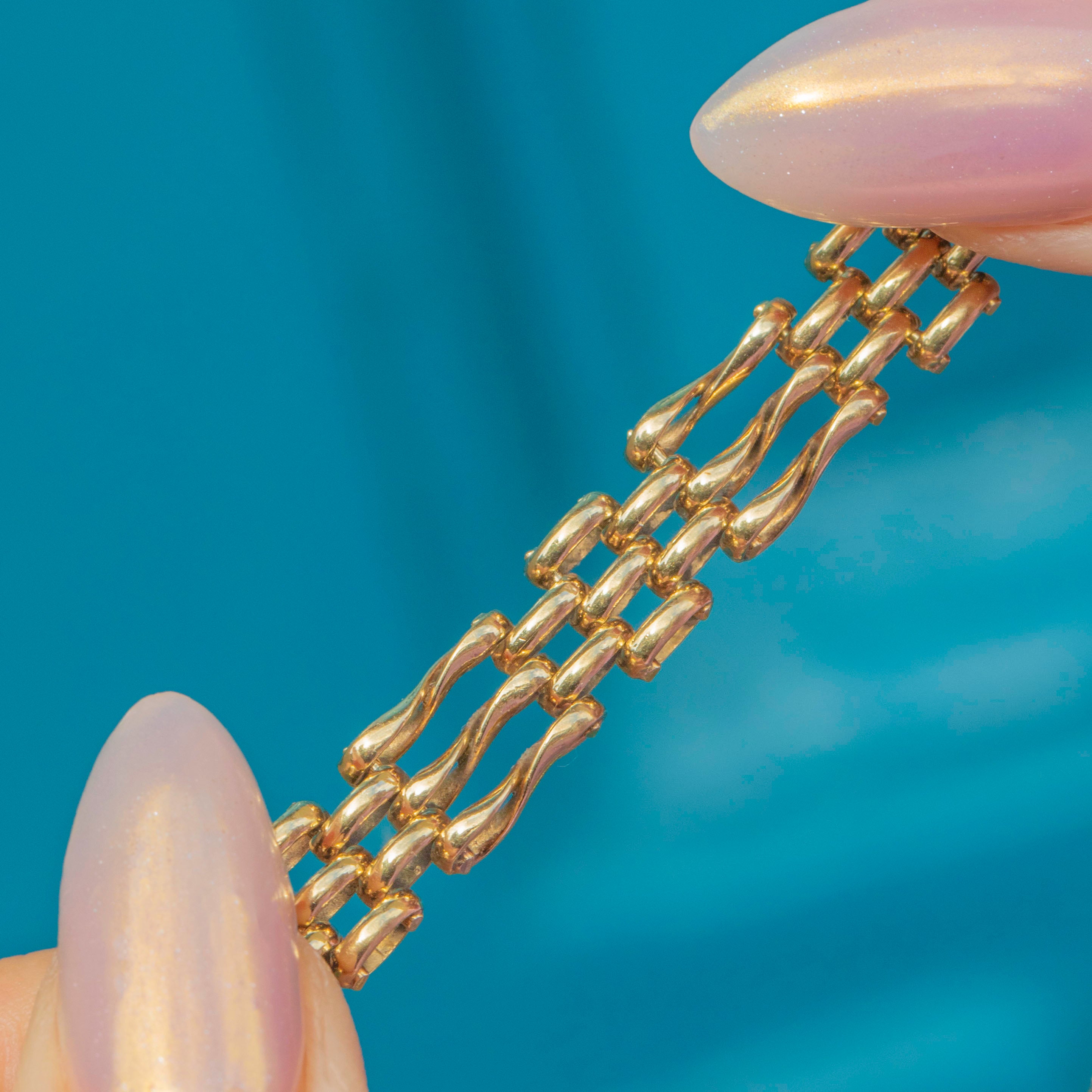 A classic Antique 9ct Gold gate bracelet with heart padlock clasp and safety chain. The buttery Gold links are solid and substantial, offering both strength and elegance on the wrist.