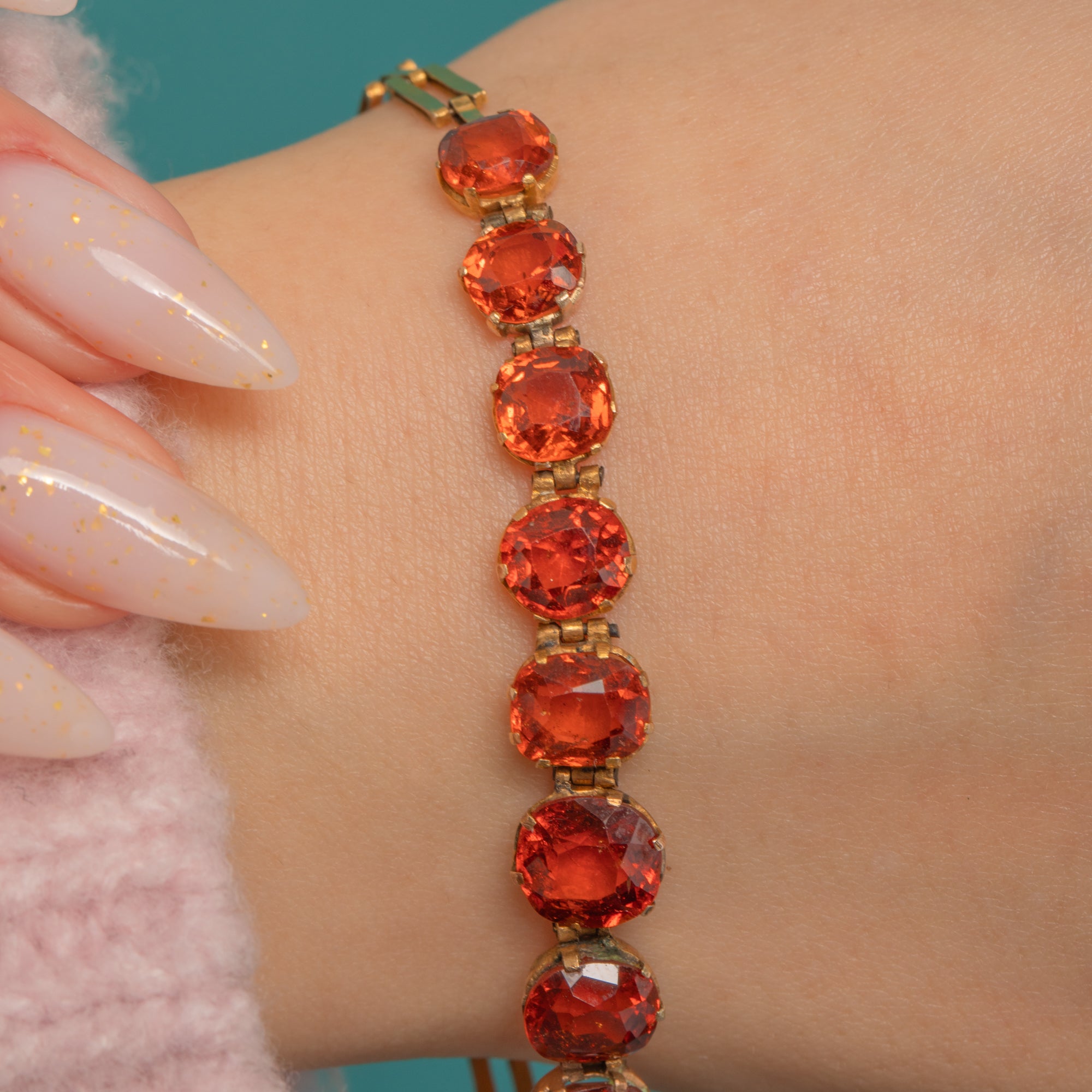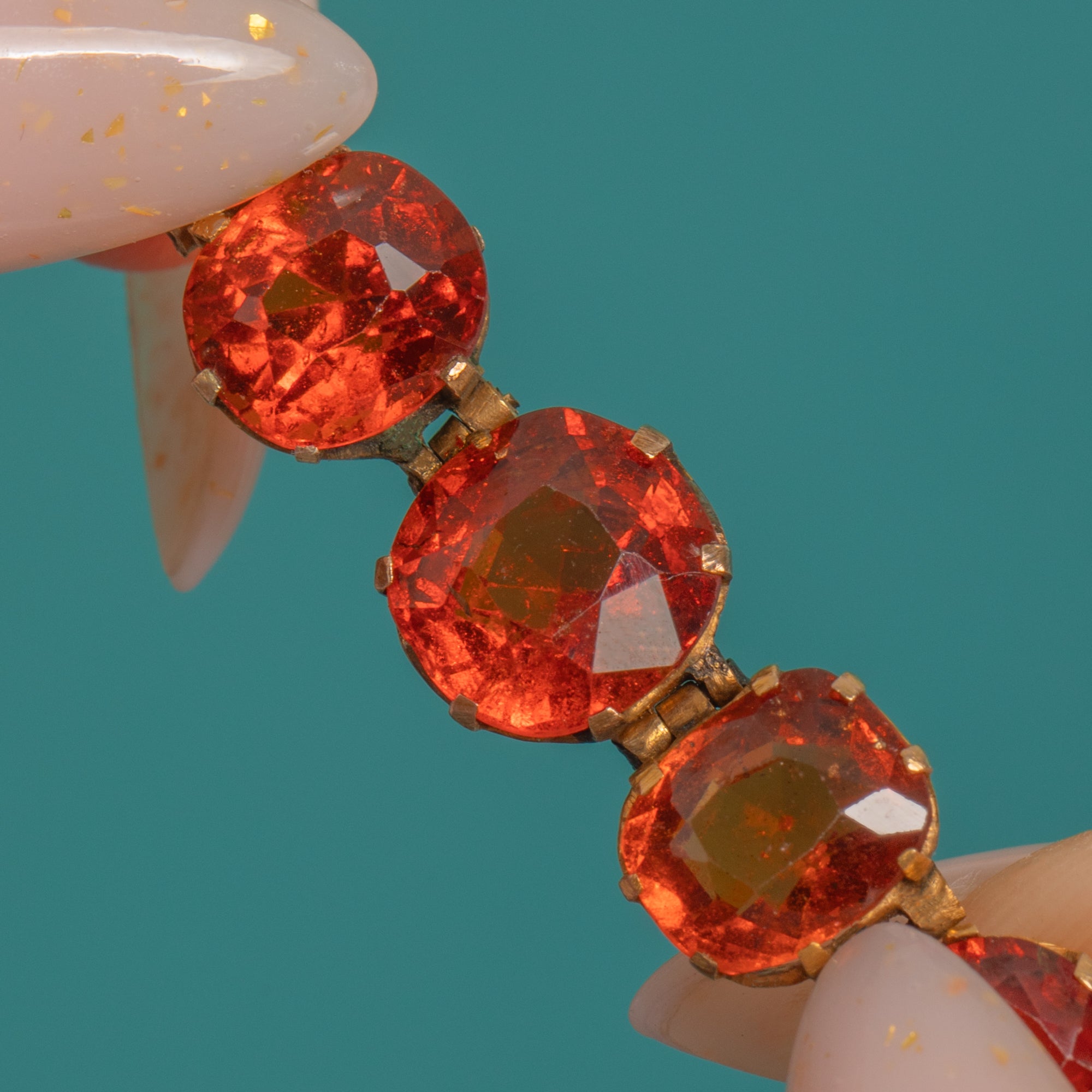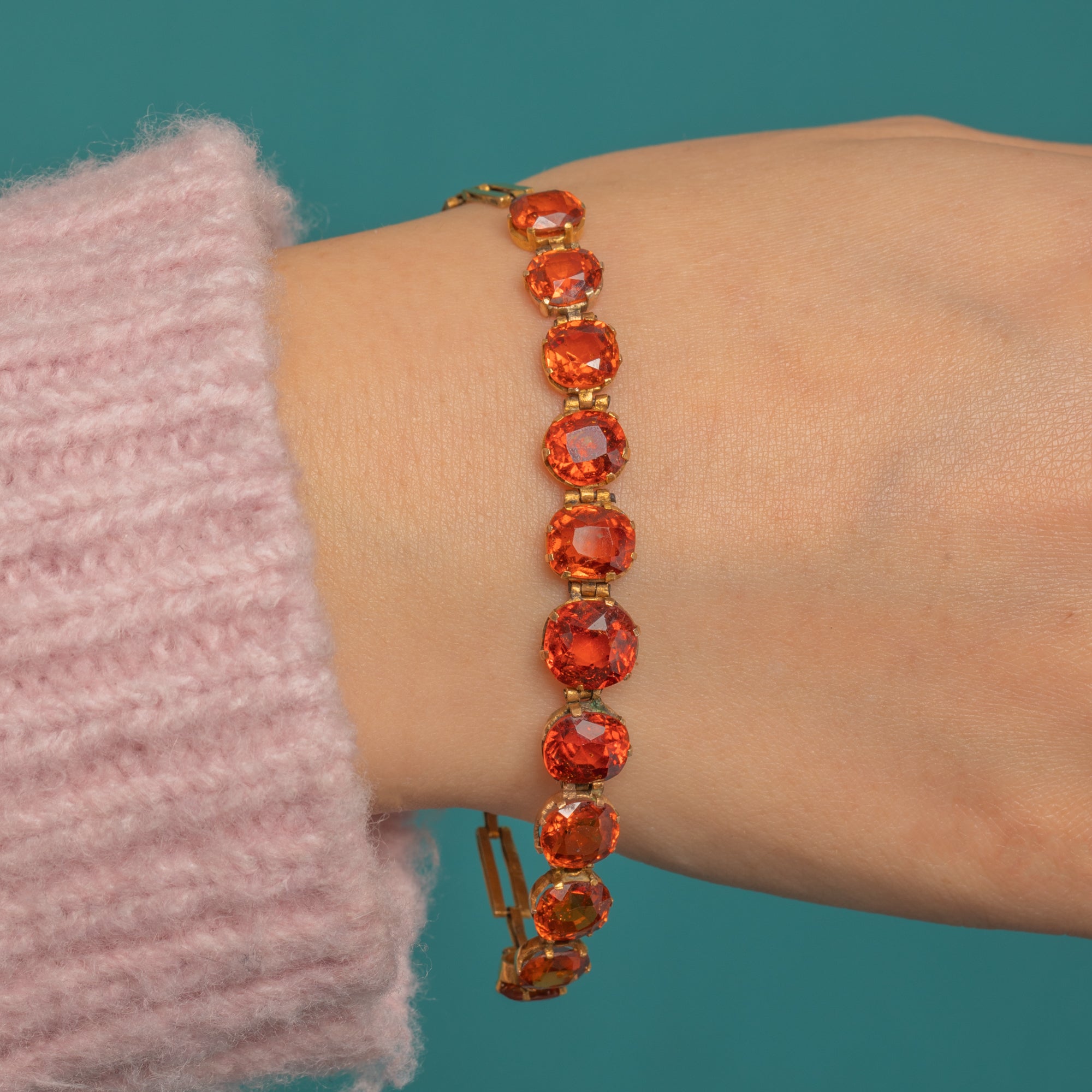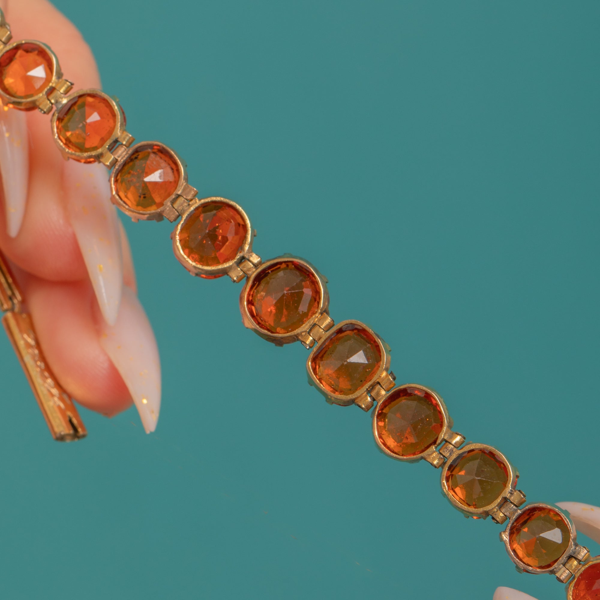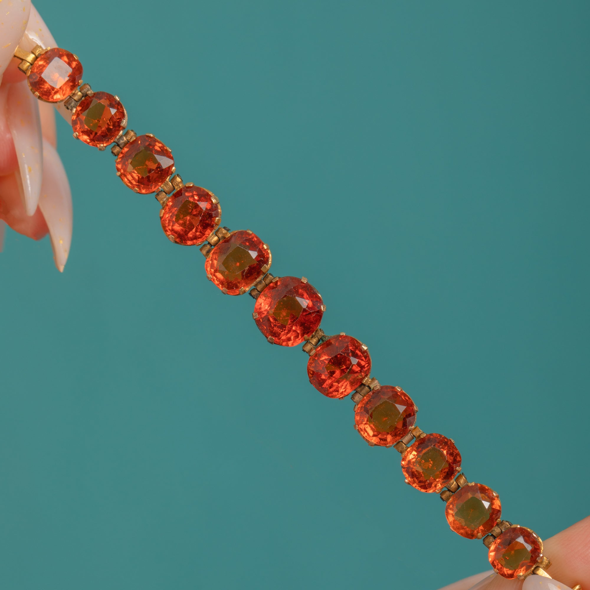 A jewel of the Jazz Age, this Art Deco riviere bracelet presents a sleek, continuous line of vivid Hessonite Garnets set in warm 9ct Gold. The articulated links drape fluidly around the wrist, each gem flashing lively orange to orange-red tones for saturated, elegant sparkle.