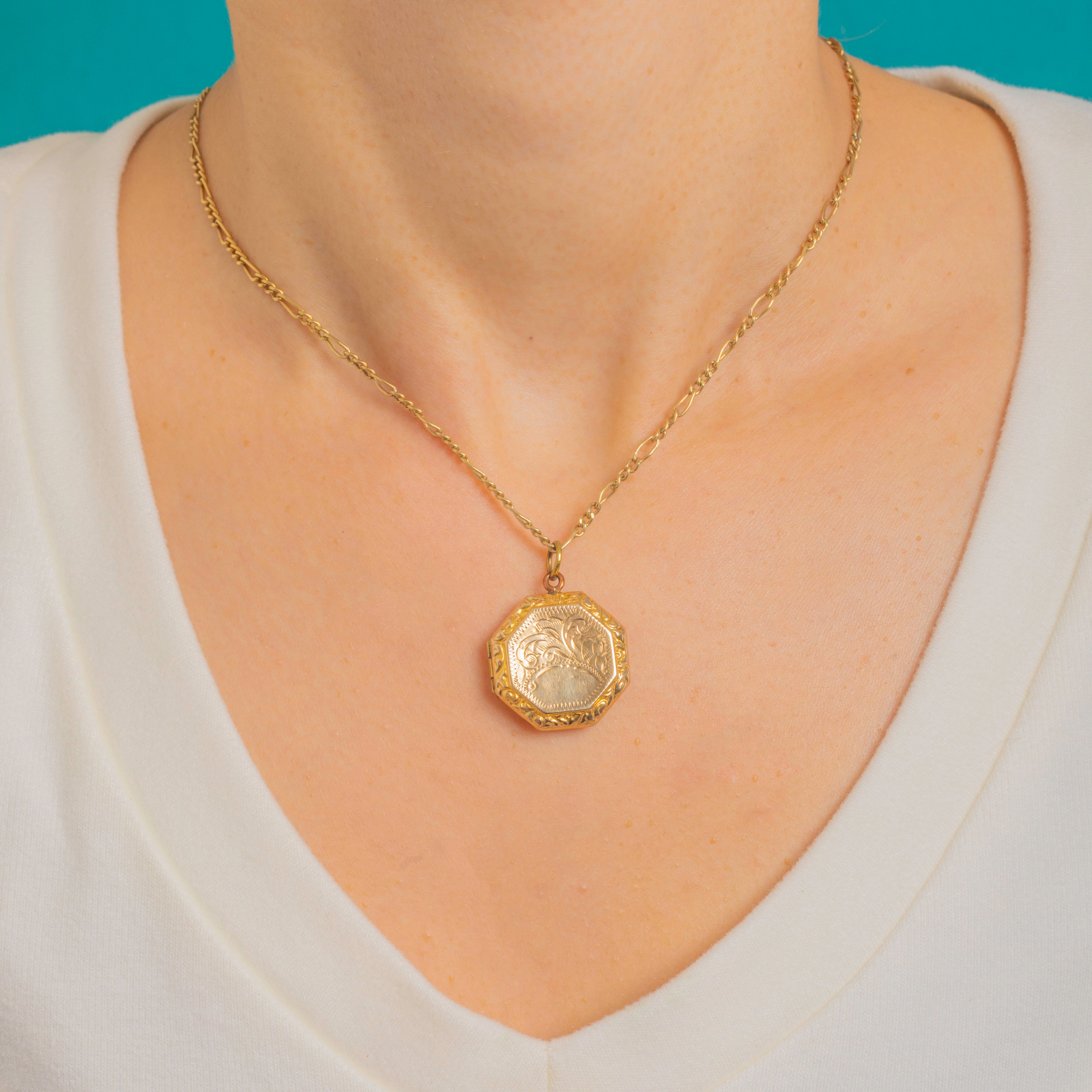 This Edwardian hexagonal engraved 9ct Gold locket is a gorgeous and timeless piece. She is an elegant antique keepsake full of sentiment. Wear her as she is, or place your own pictures inside to keep them close to your heart.