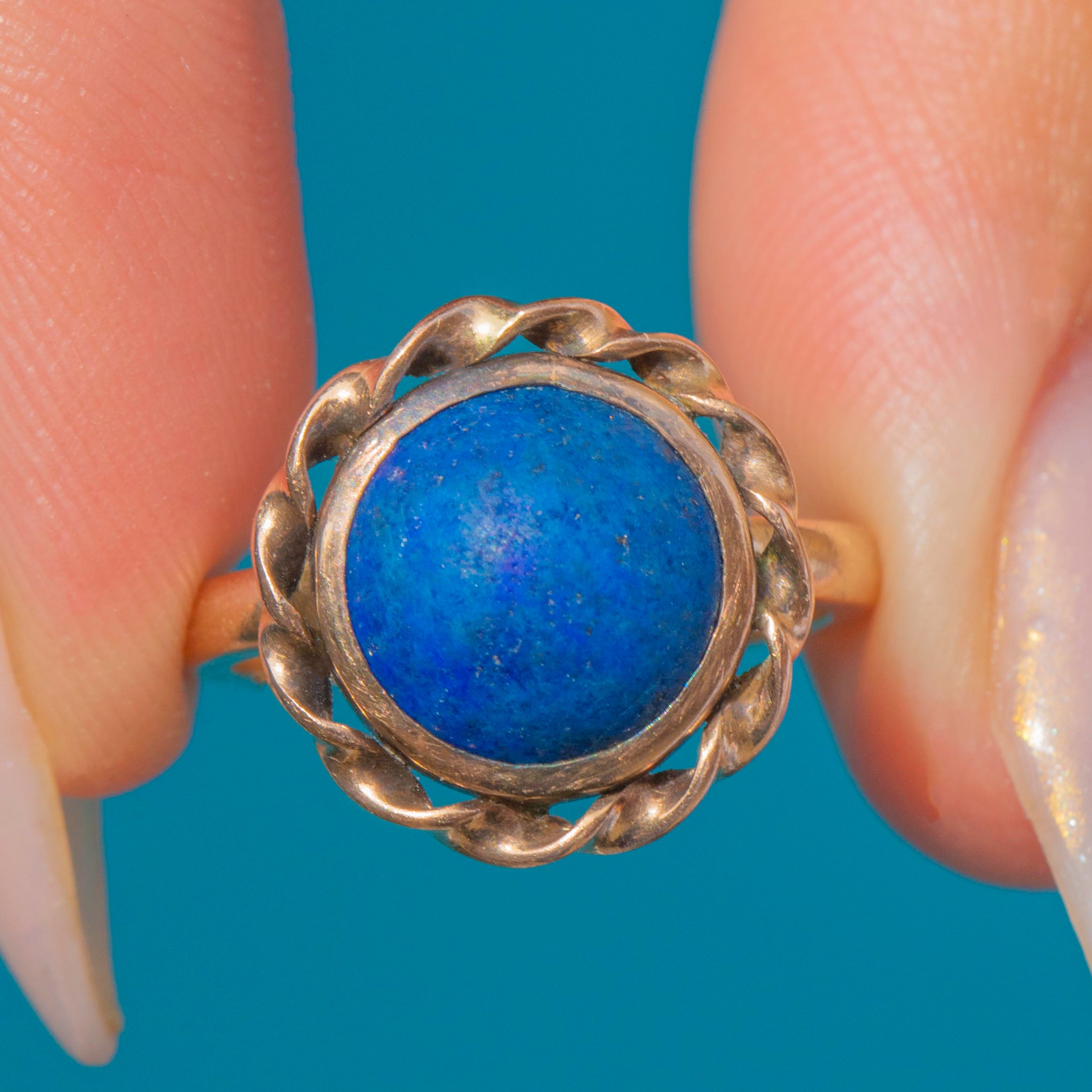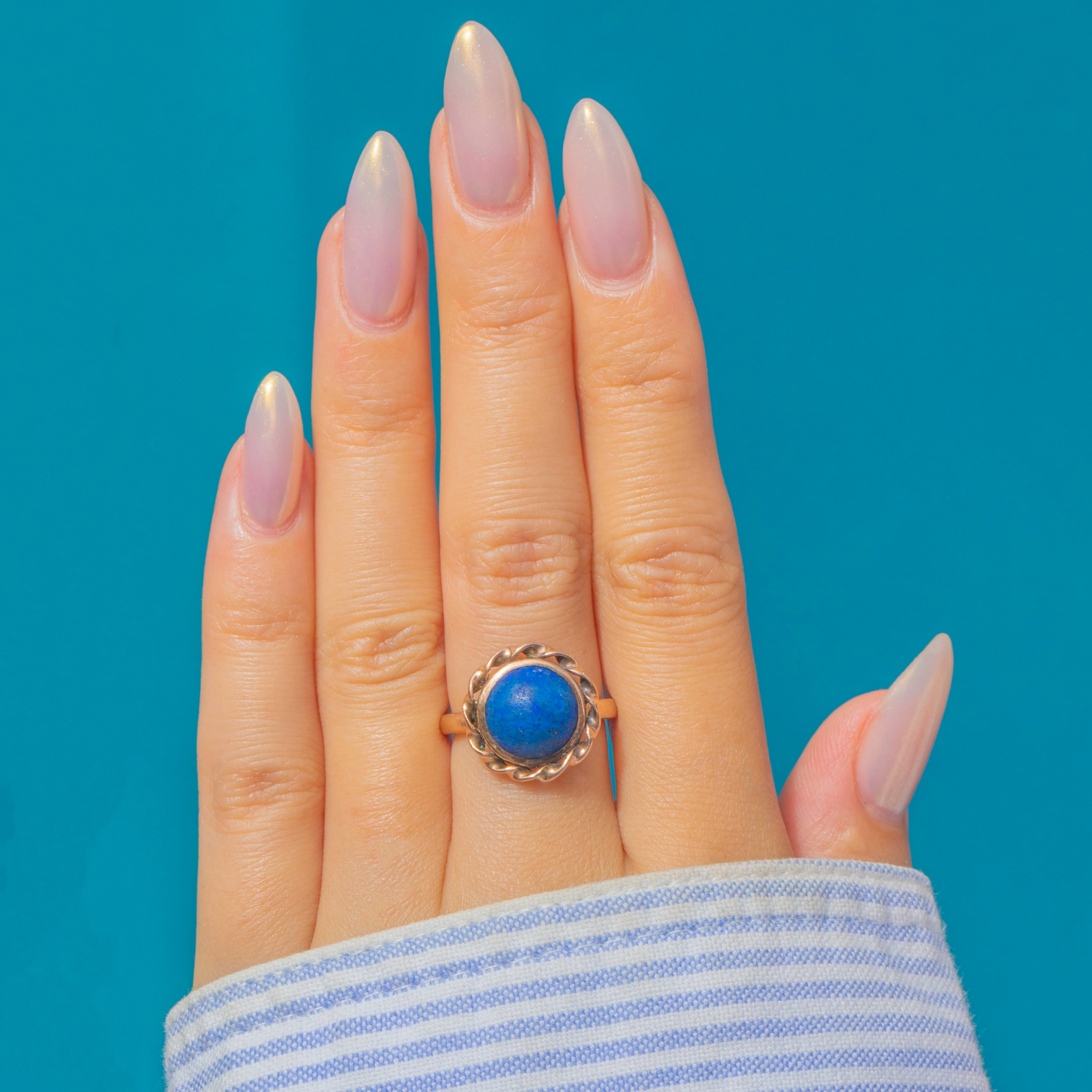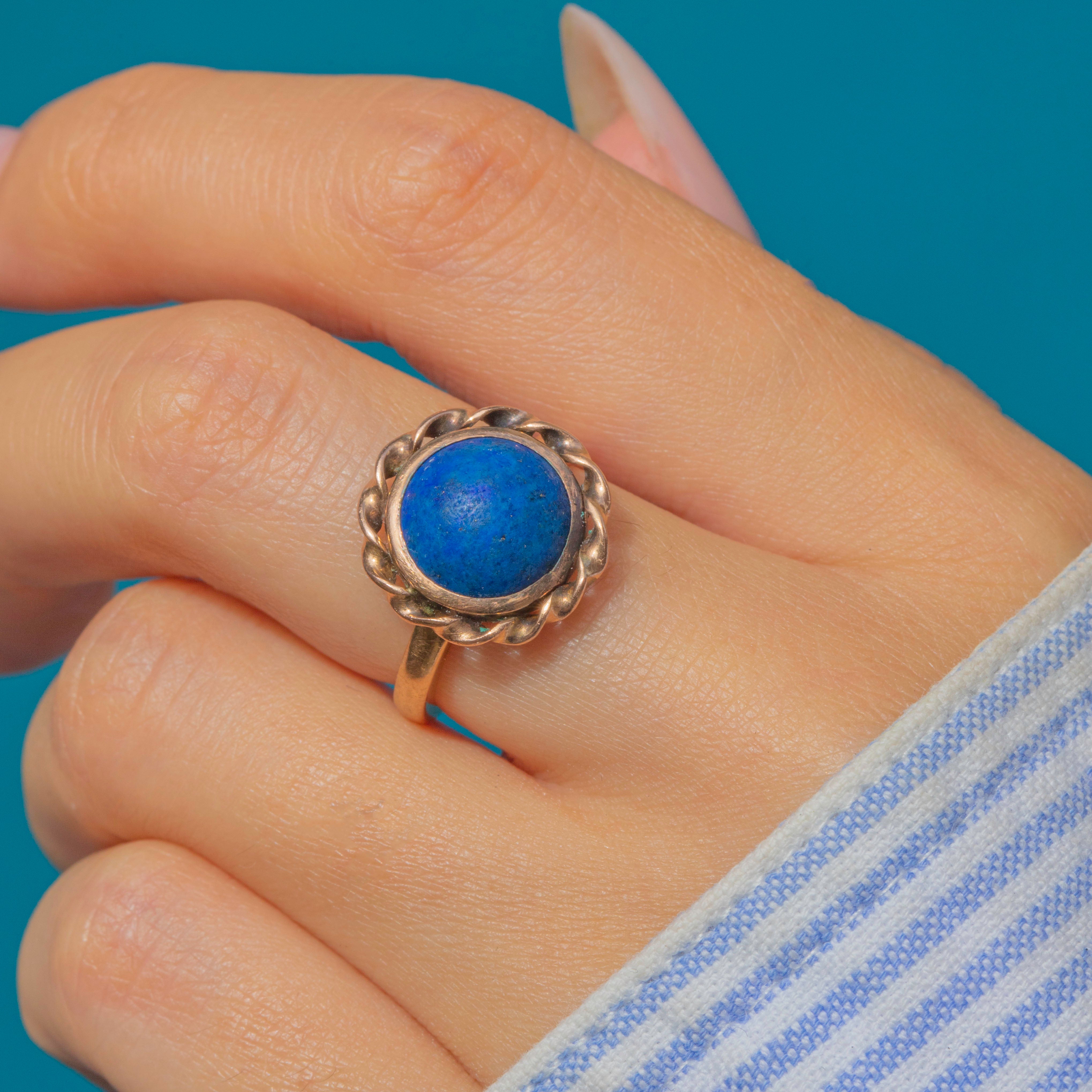 An antique 9ct Gold Lapis Lazuli cabochon ring, c.1900. The bold cabochon measures 8.4mm in diameter, its deep indigo blue enriched by natural golden flecks of pyrite. The gemstone is framed by a twisted rope border, a timeless design detail that adds texture and depth to the setting.