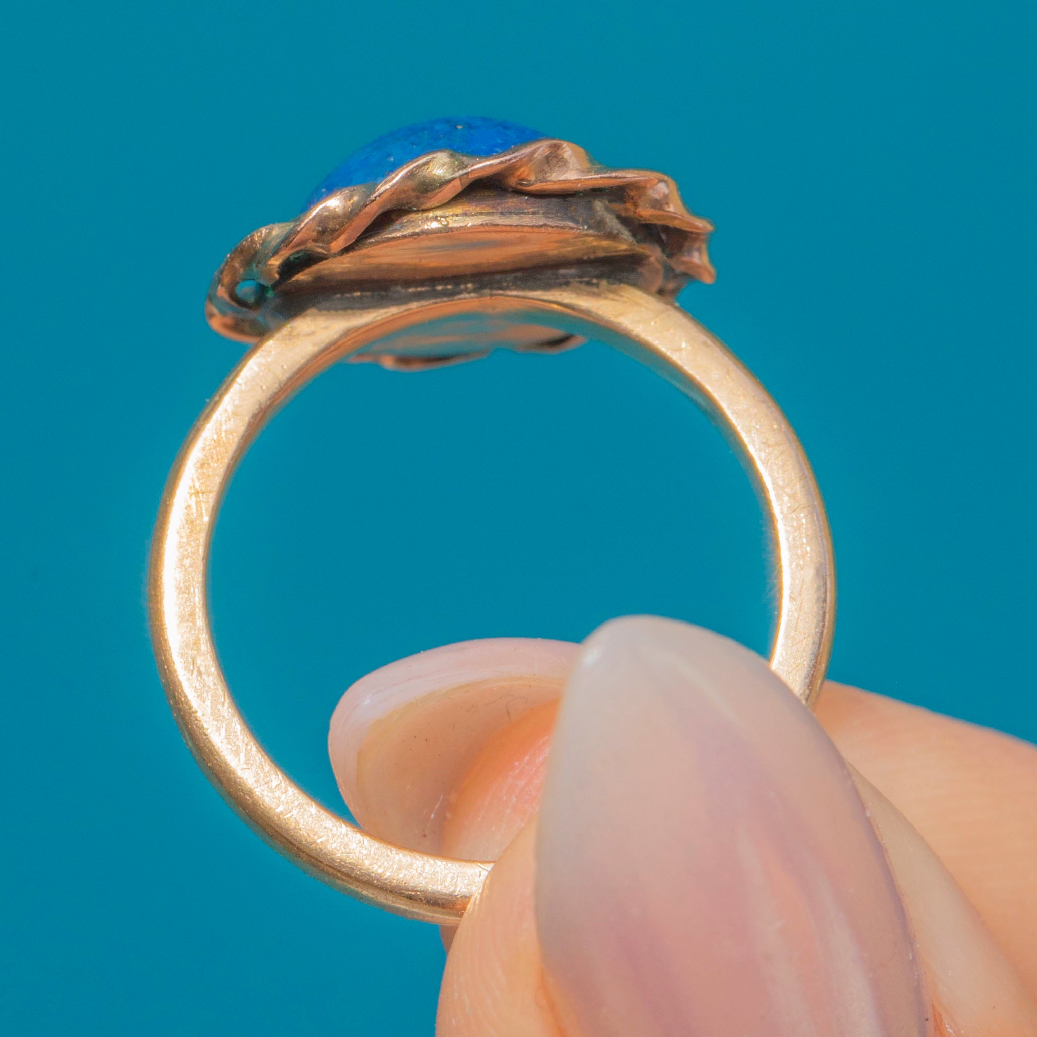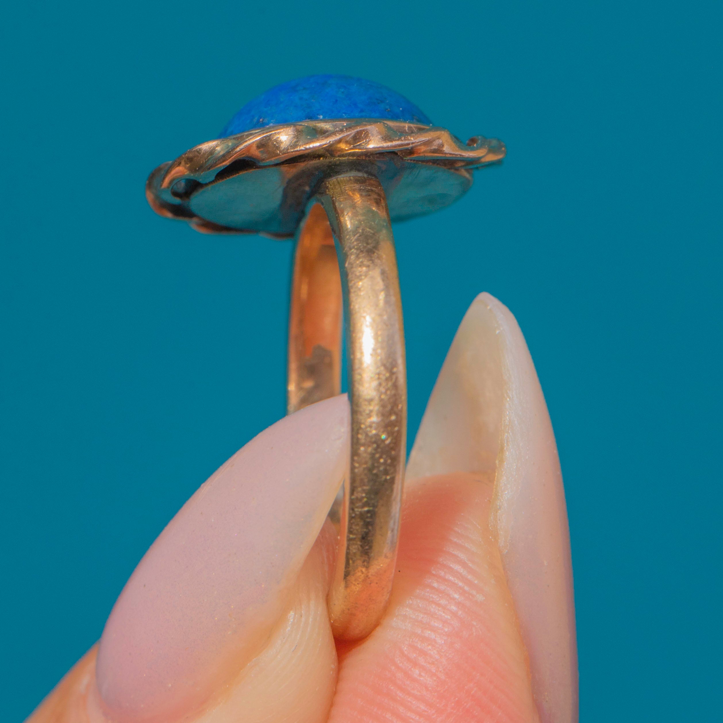 The Gold has a slightly rosy tone, which contrasts beautifully with the vivid Lapis. The head of the ring measures 13mm across, balanced on a 1.5mm wide shank that feels robust and comfortable on the hand. Smoothly polished and well-crafted, this piece has all the hallmarks of fine late 19th to early 20th-century design.