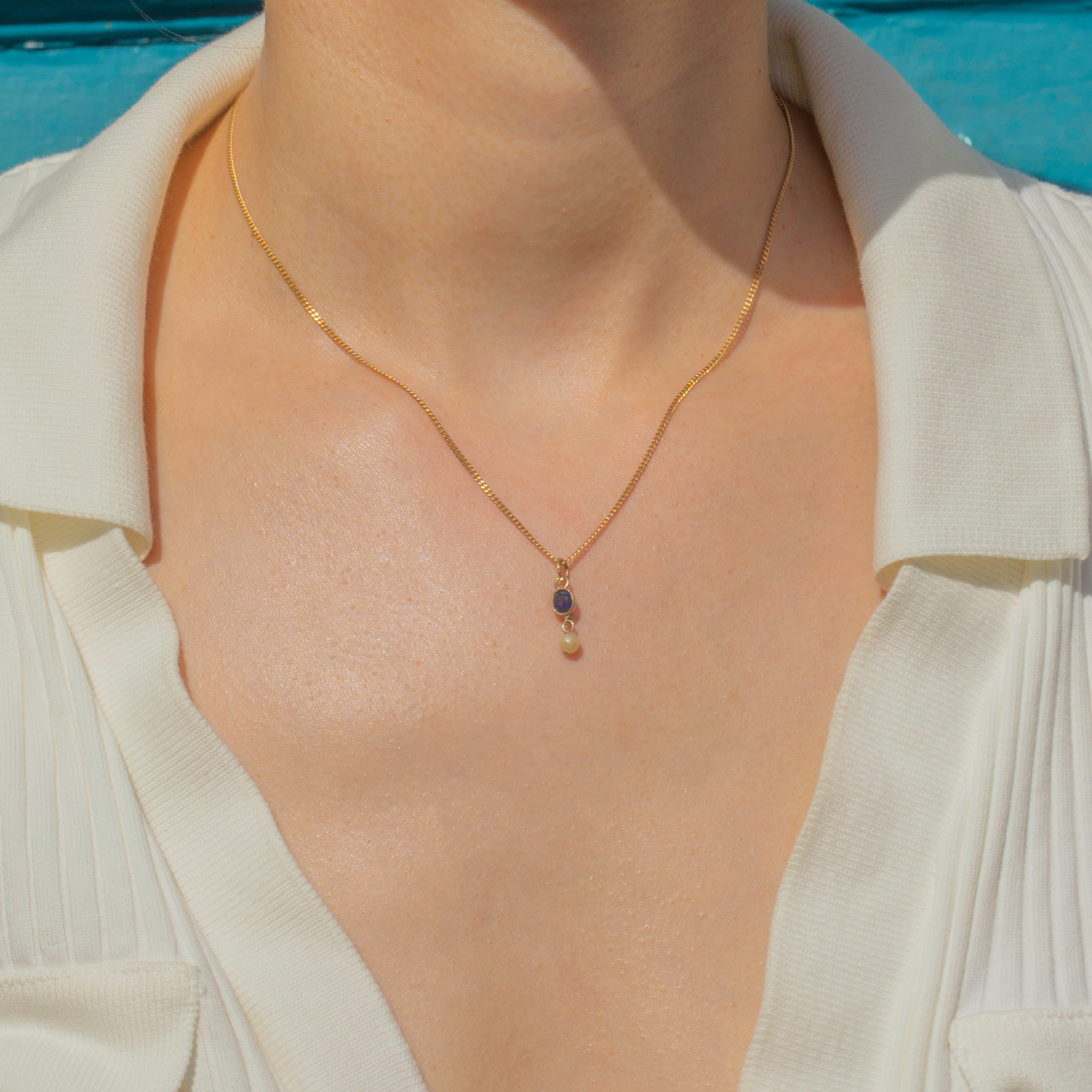 MATERIALS: Tests as 9ct Gold, Natural Sapphire (0.18ct), Pearl.