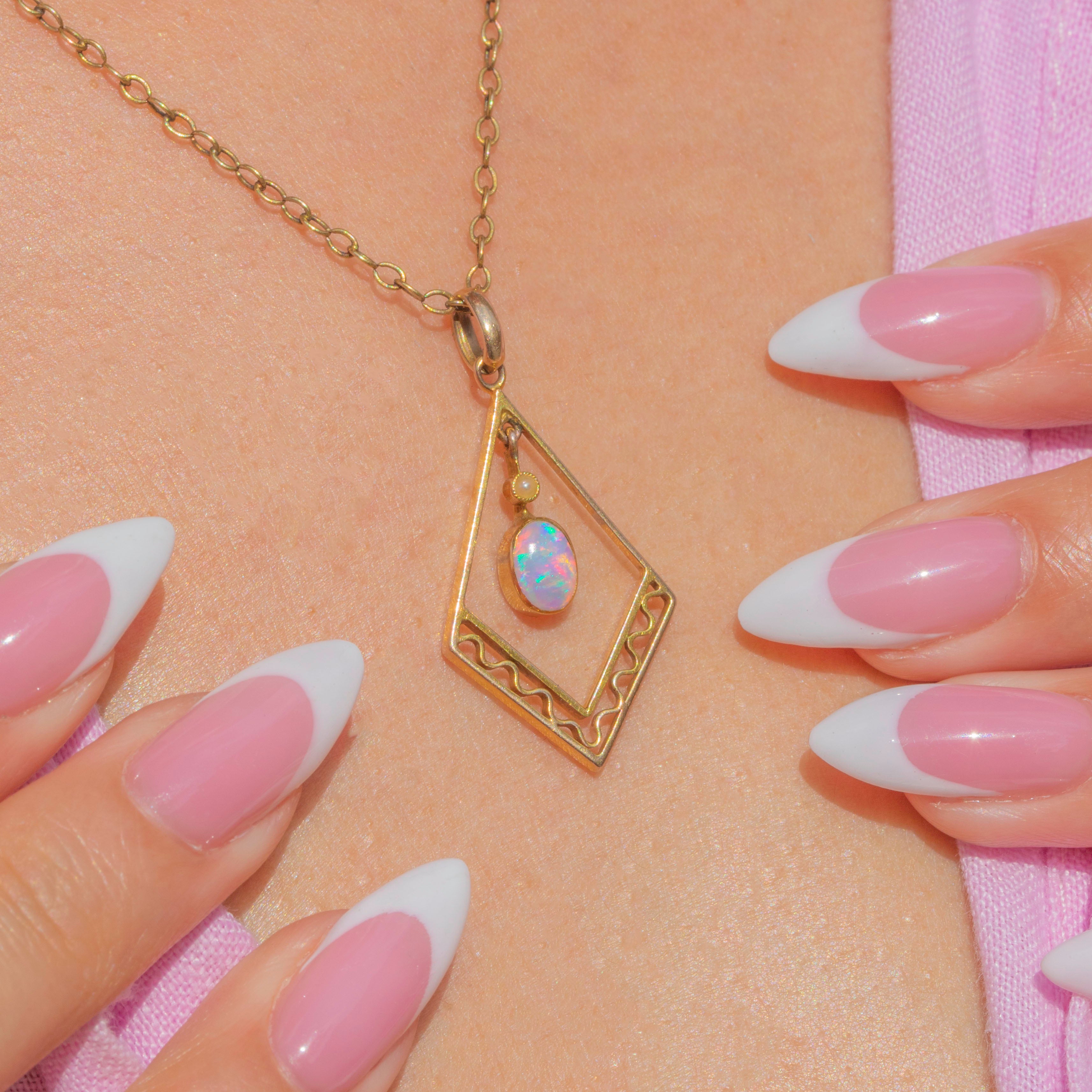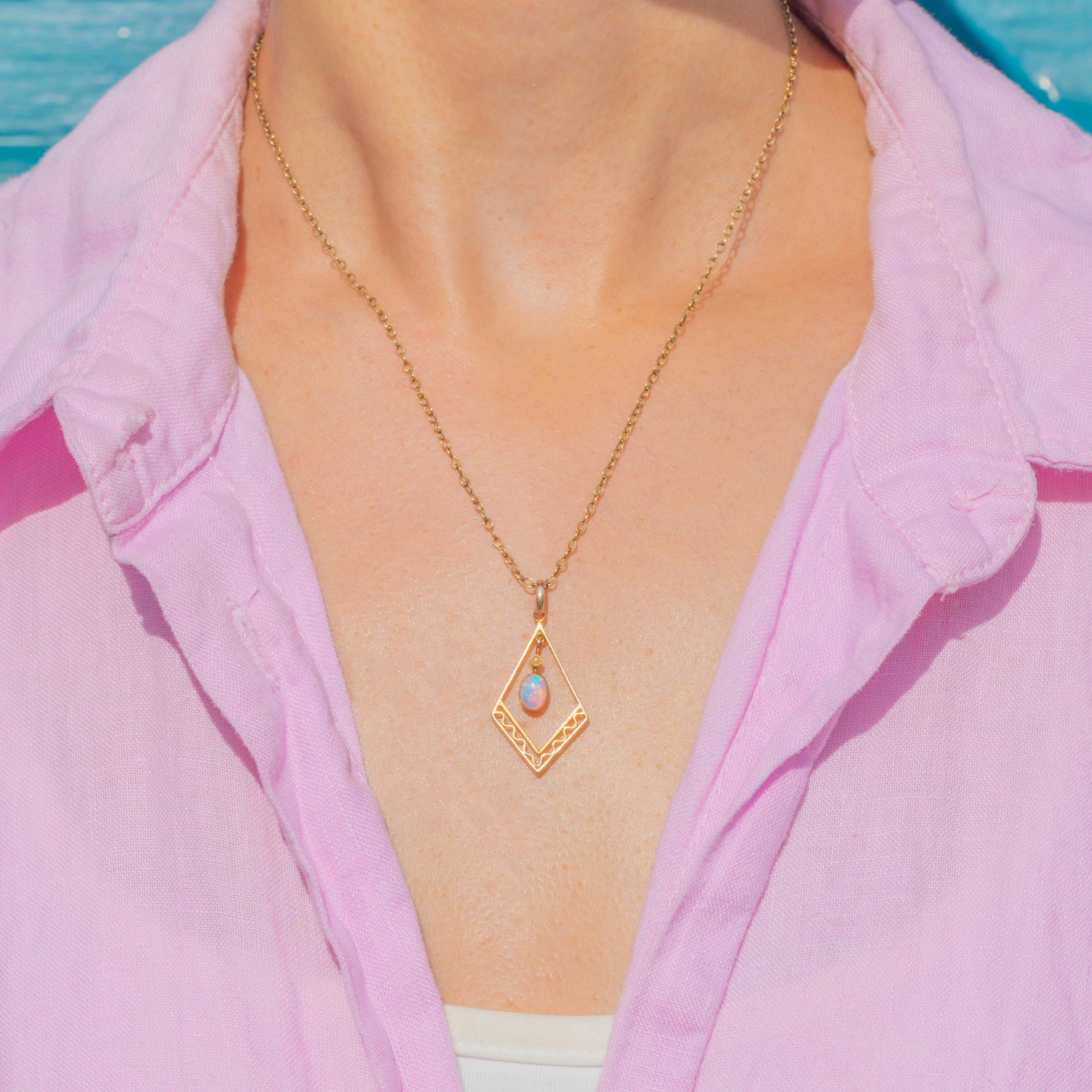 A delicate and beautifully detailed antique lozenge-shaped pendant, crafted in warm 9ct Gold with decorative openwork details and set with an Opal and Seed Pearl.