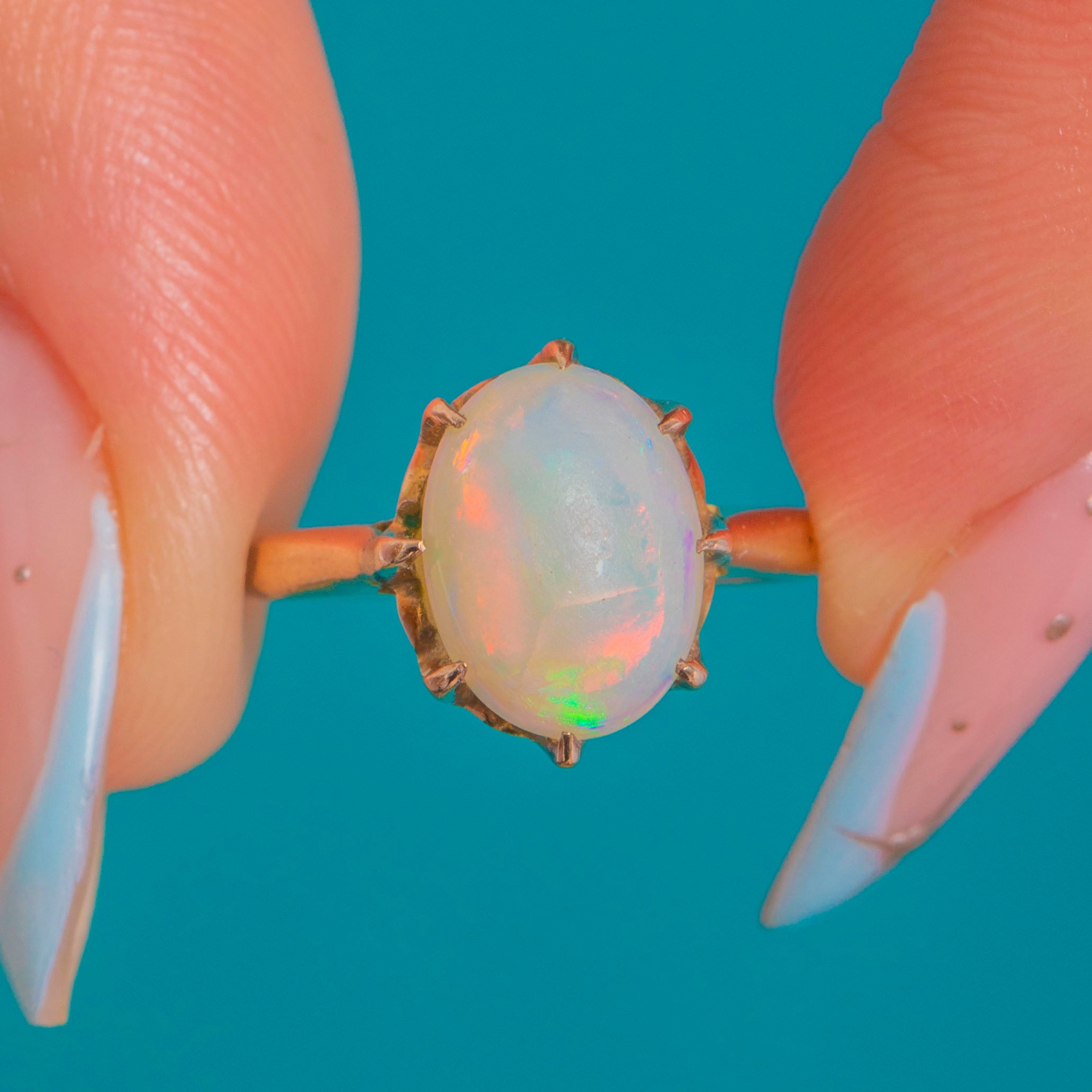 Hand-set multiple claws embrace the Opal securely, while the slim shank keeps the silhouette refined and wearable. A beautiful example of classic Victorian taste, with approximately 1.70cts of mesmerising colour at its heart.