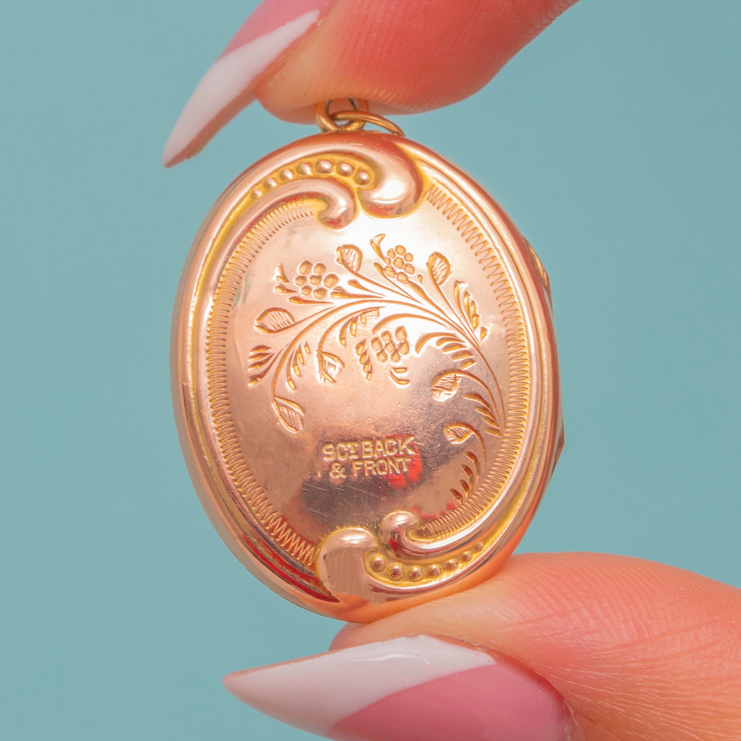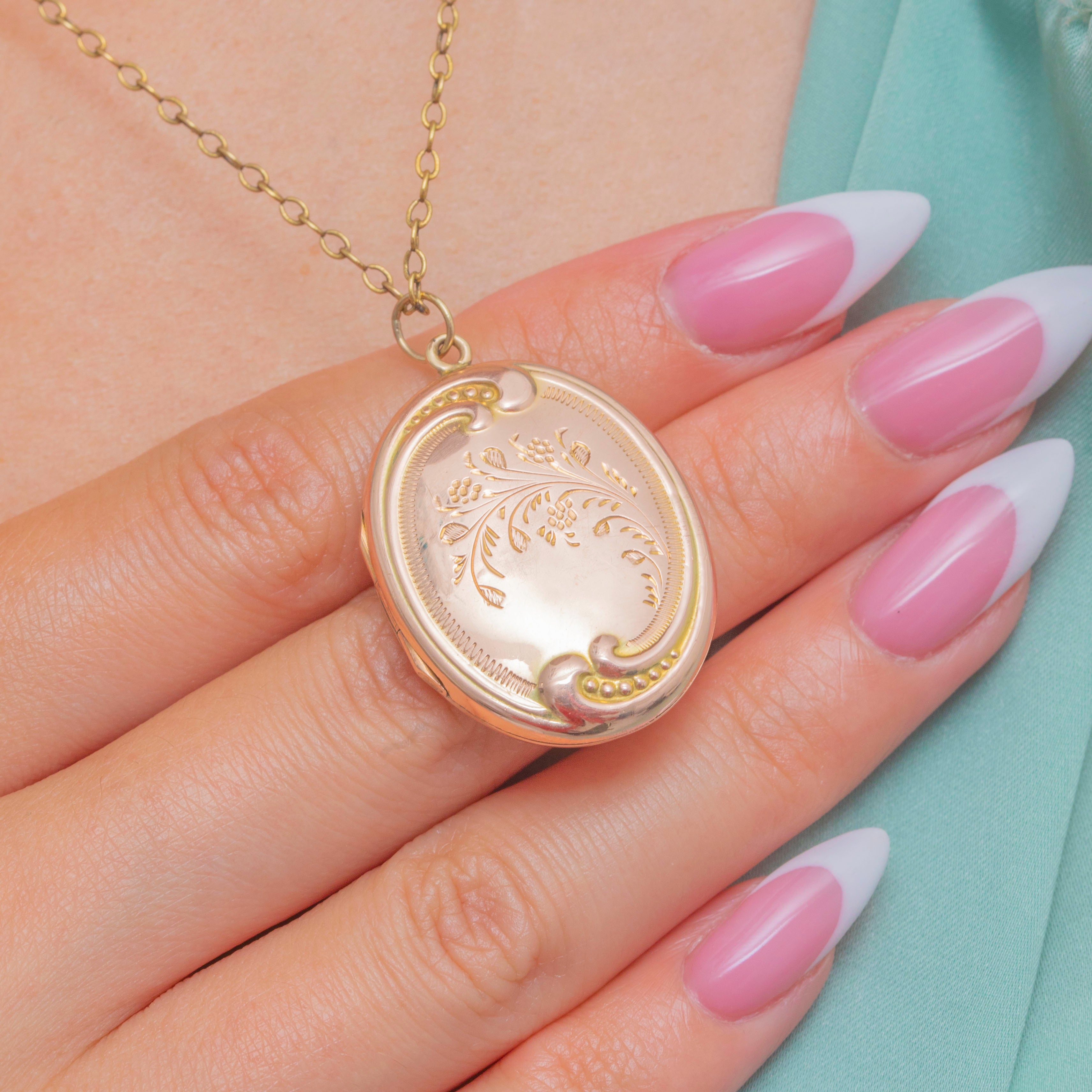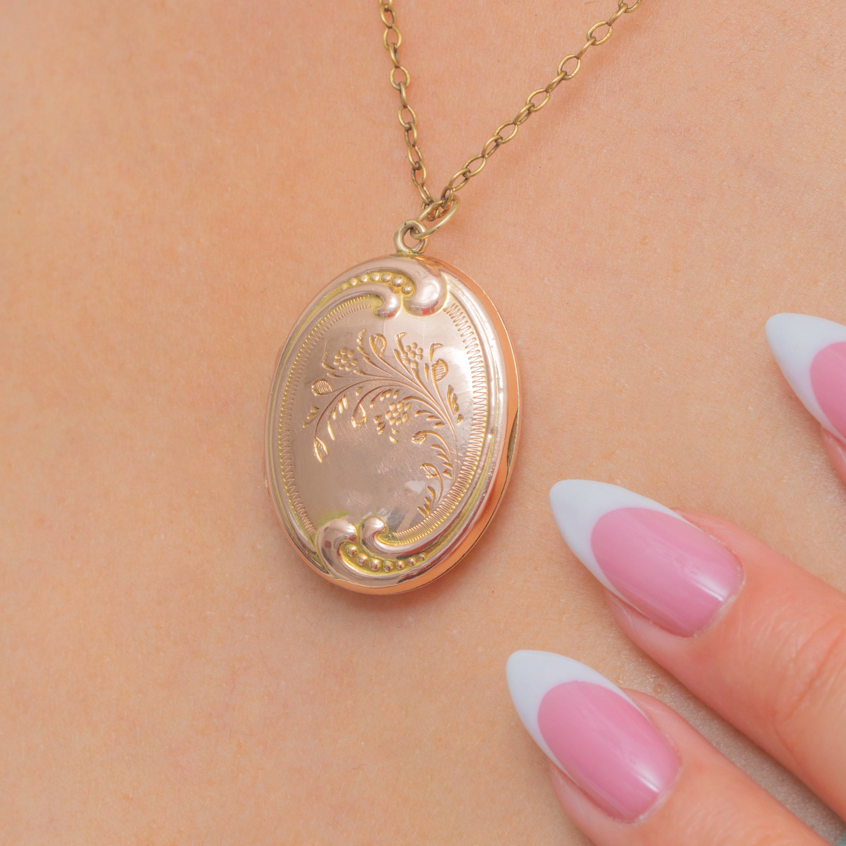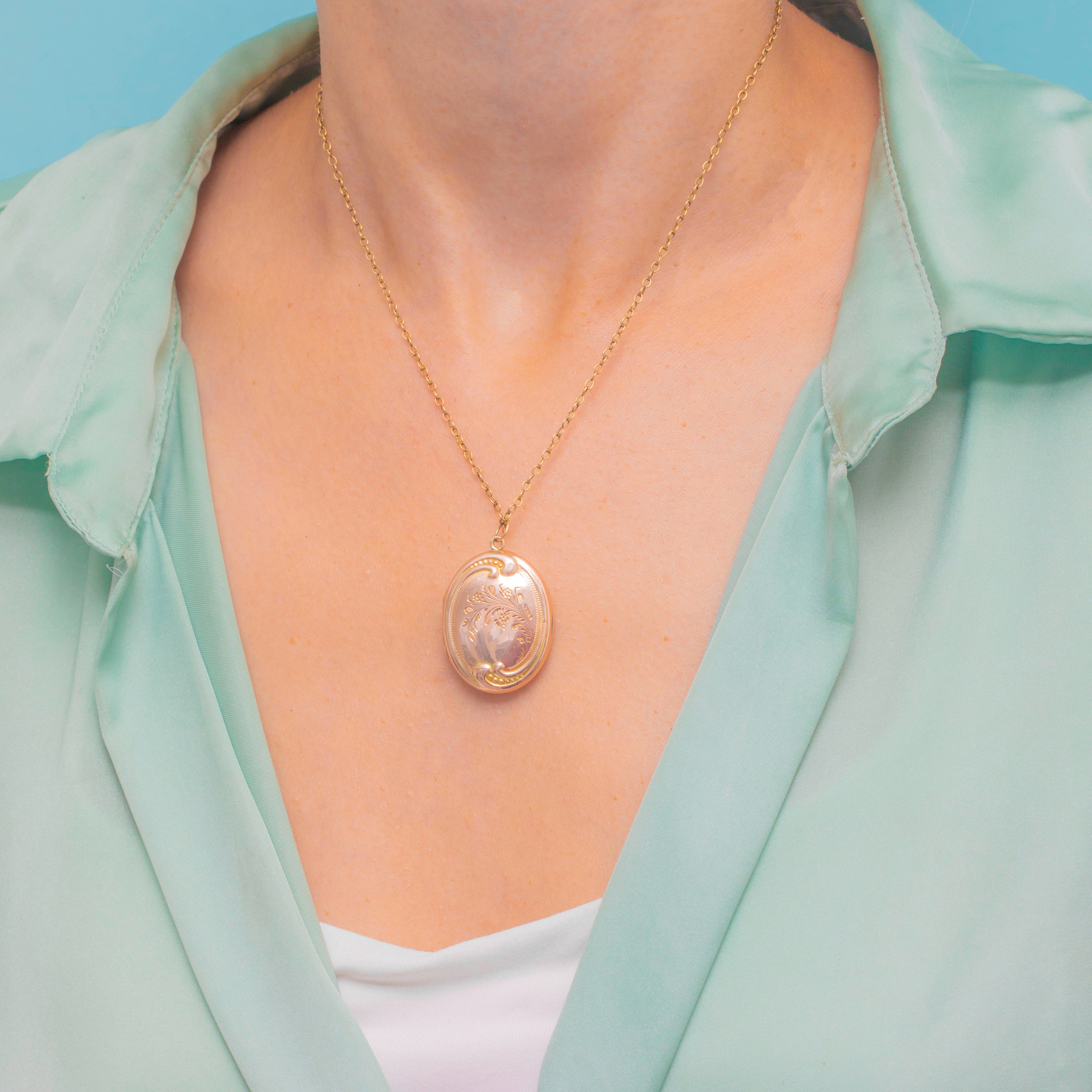 This Edwardian Gold locket is decorated with orante engravings on both sides, flaunting delicate floral motifs framed by a swirling repoussé borders.