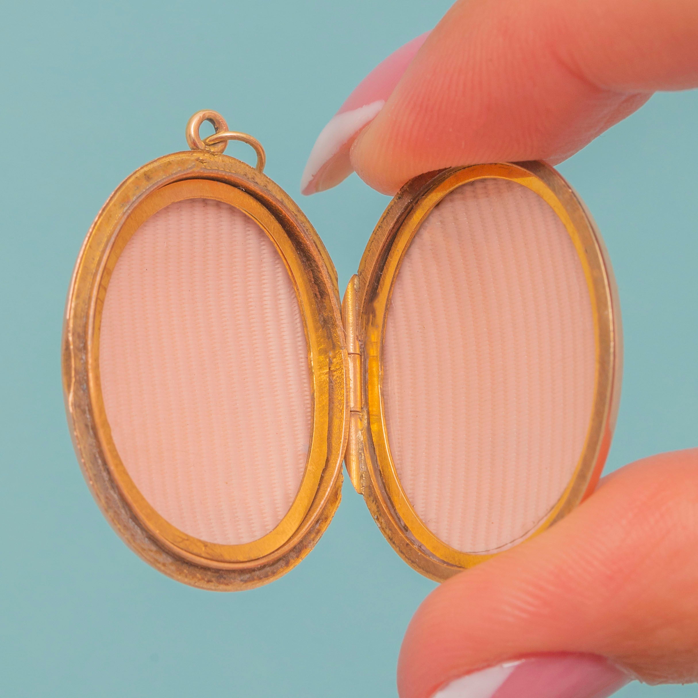 VERY GOOD-EXCELLENT: With a wonderful Golden lustre, she's been well preserved, and the Gold has accrued a gorgeous rosy tint! The doors close tightly so you can store the photos safely inside. There is some subtle wear inside the locket doors, but this is just a reminder of how many people have called this locket their own over the years. She's ready to be worn and adored for many more!