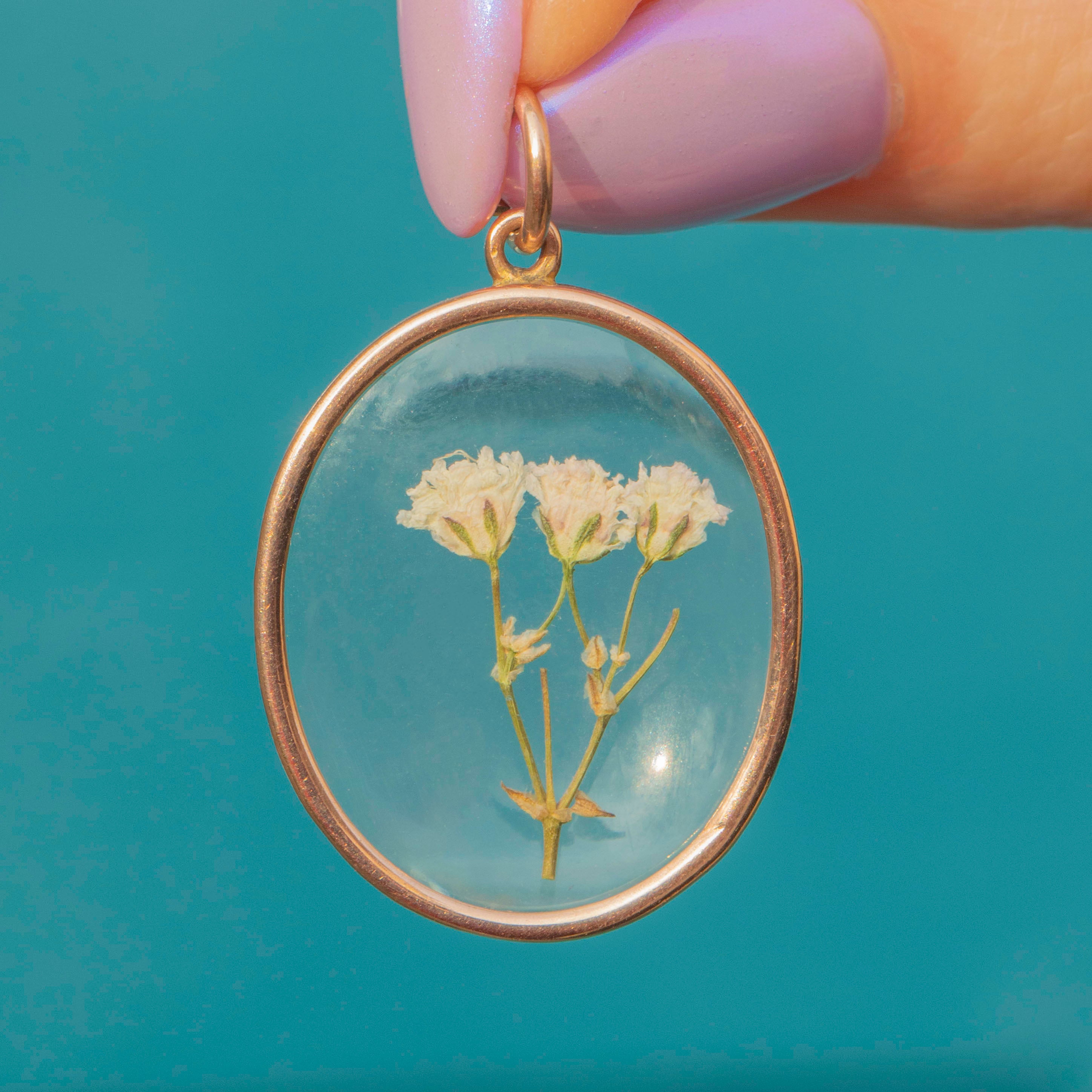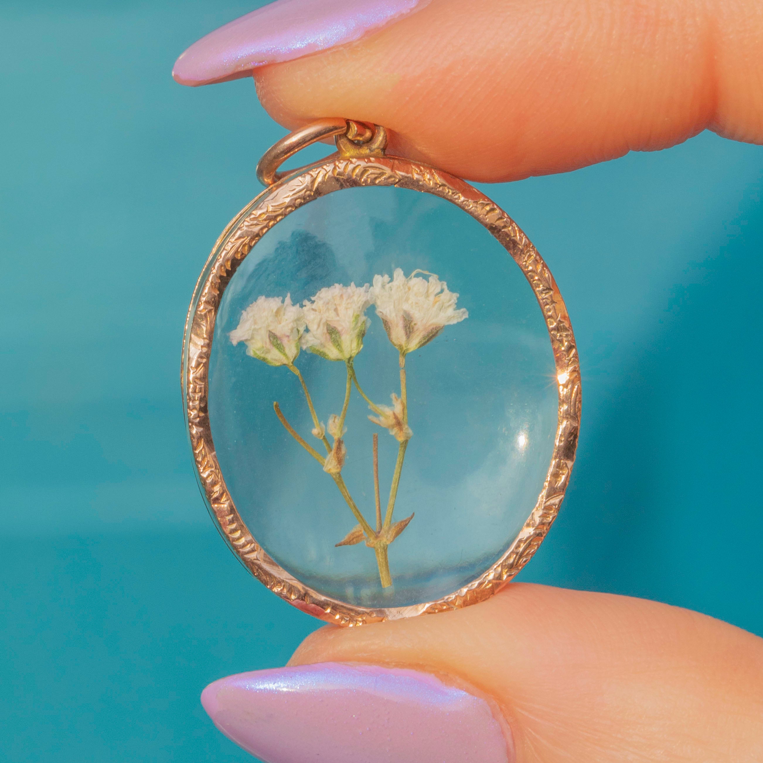 MATERIALS: 9ct Gold, Glass, Pressed Flower.