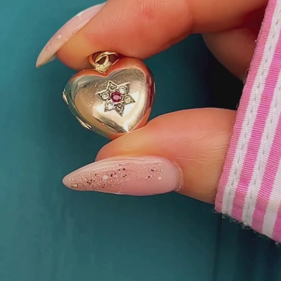 This antique 9ct Gold Paste heart locket is sure to capture your heart! Her front depicts a flower motif, with each petal comprised of a dainty white Paste encasing a fuchsia pink Paste gemstone.