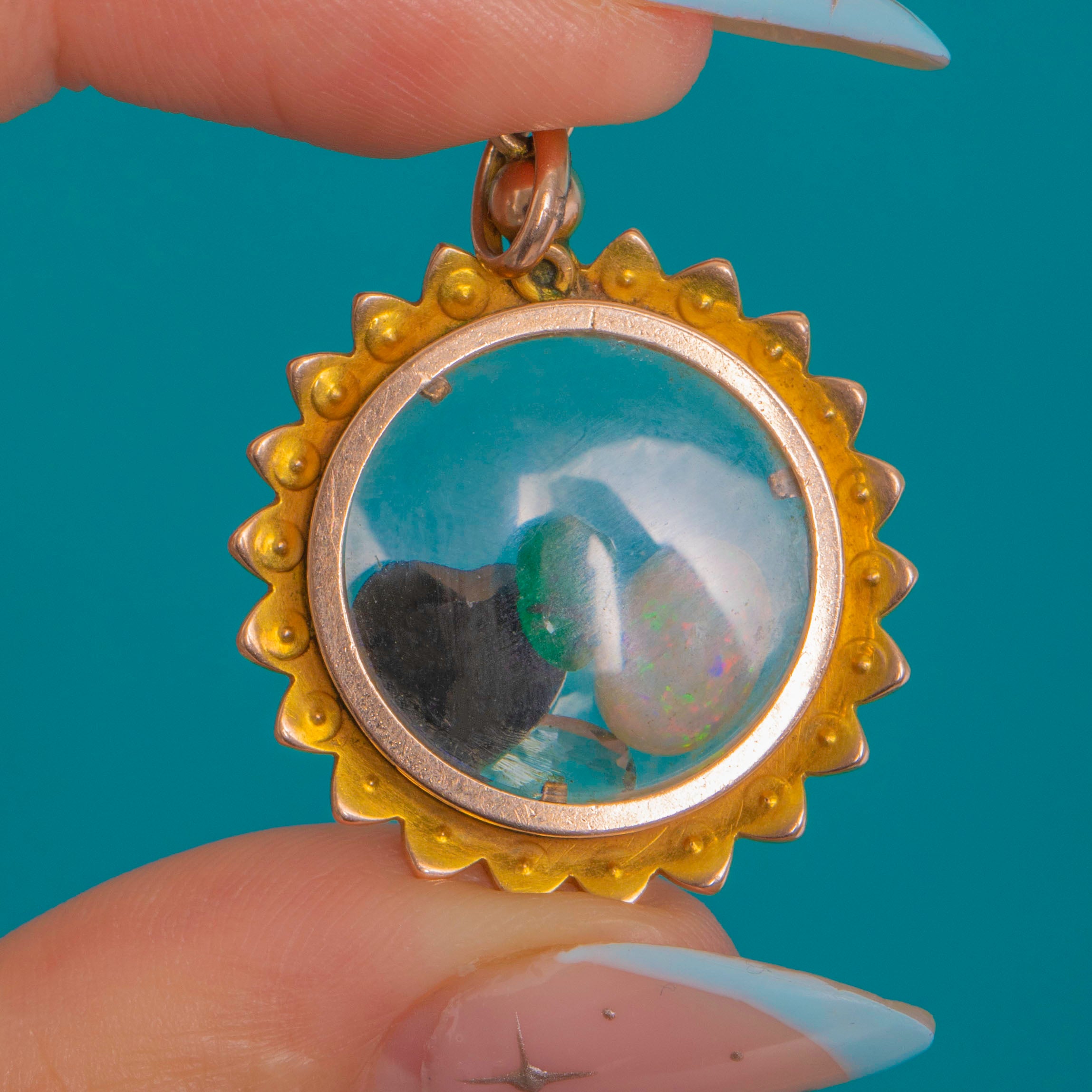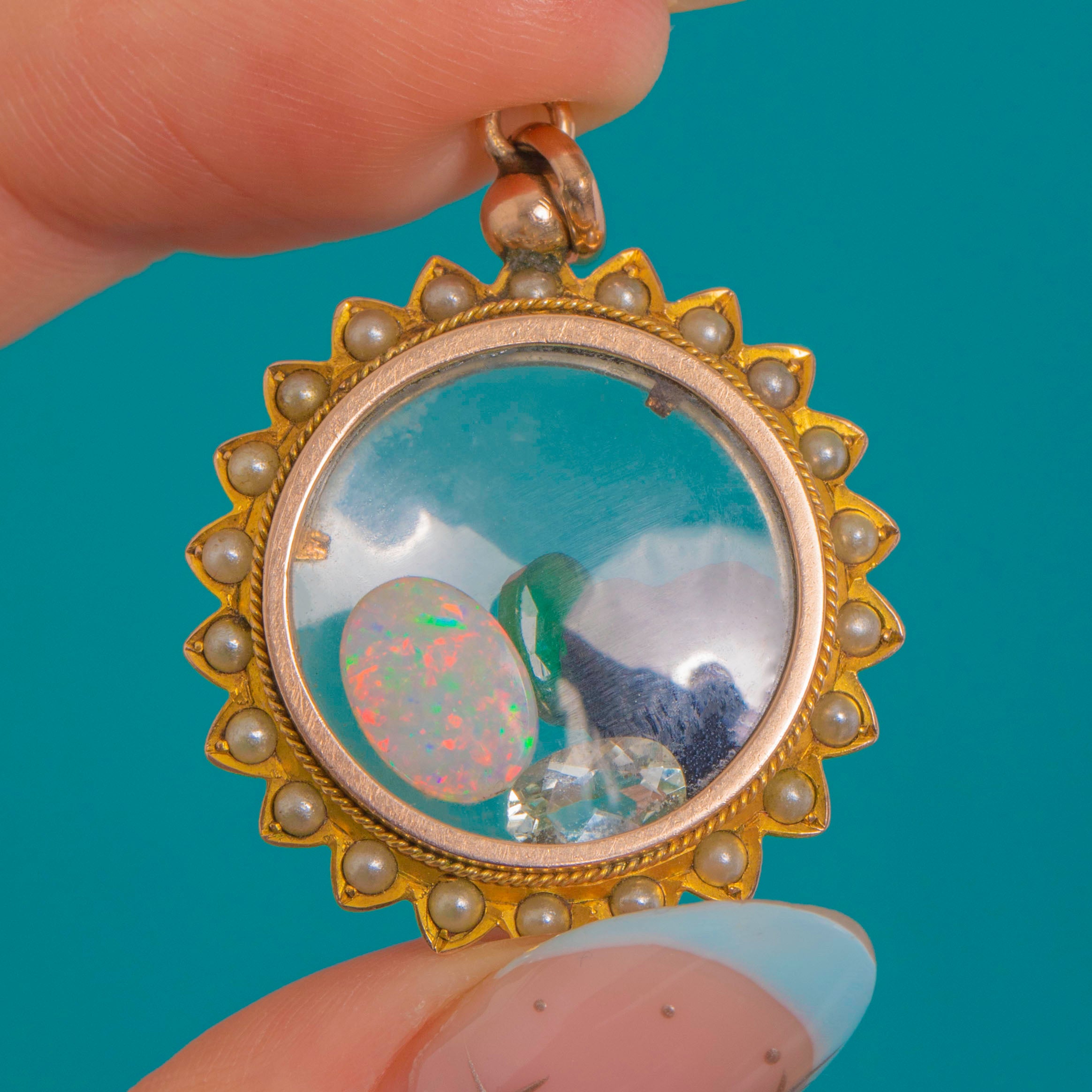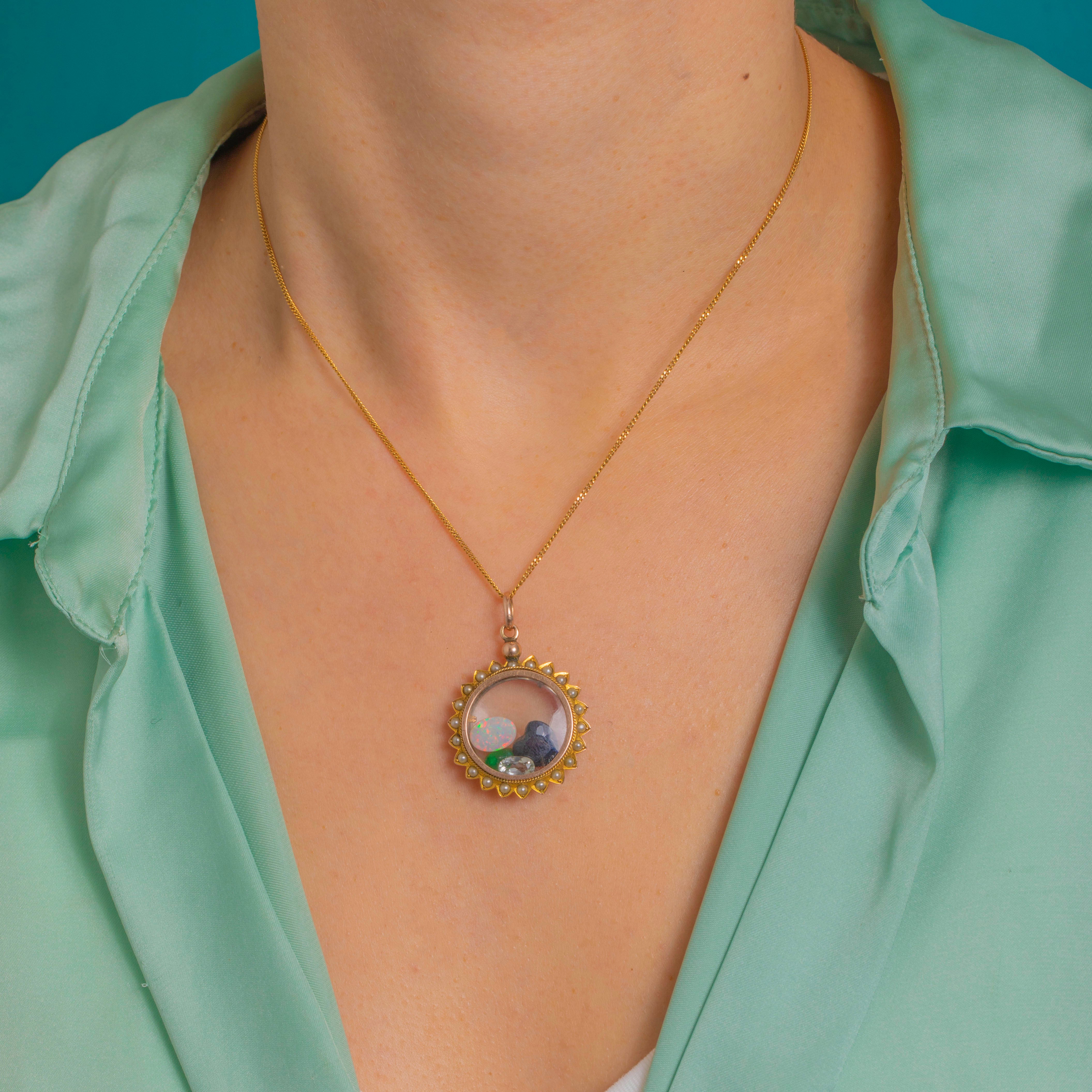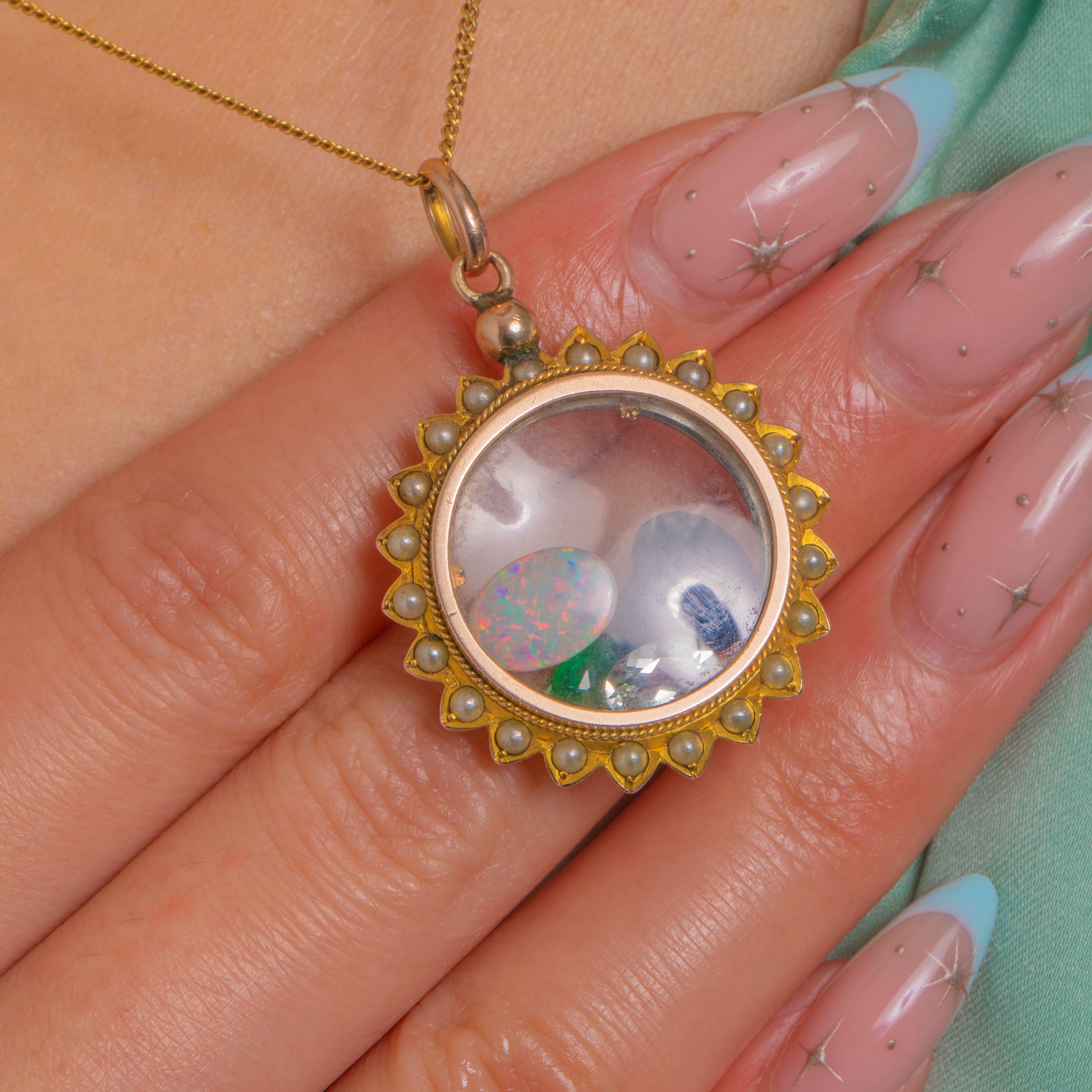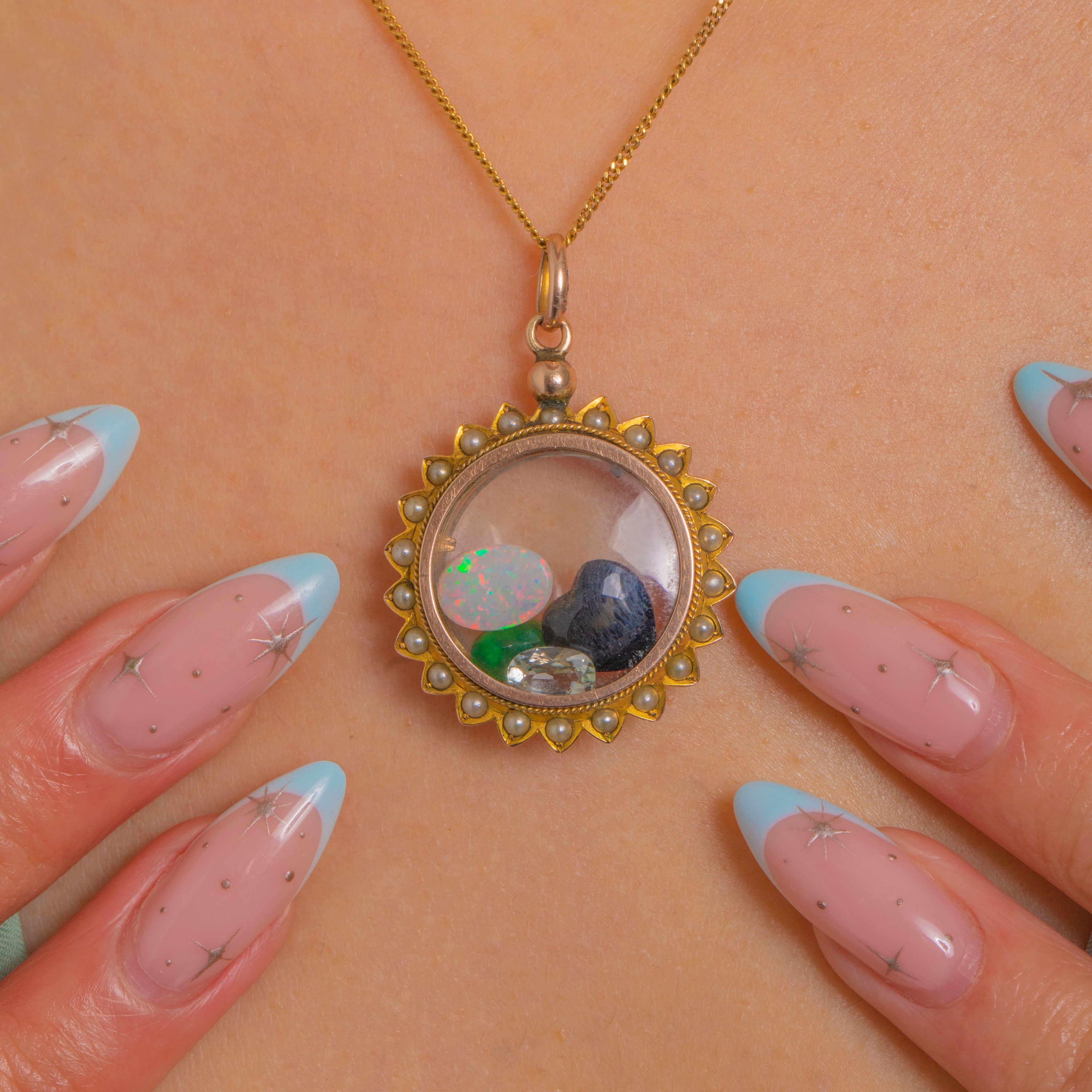 A romantic Victorian shaker locket in 9ct Gold, encircled by a scalloped sunburst edge and a halo of petite Pearls for a soft, luminous glow. Double-sided domed clear windows create a miniature theatre for a playful constellation of loose Opal, Emerald, Garnet, Aquamarine that gently dance as you move—sentimental, tactile and irresistibly charming.