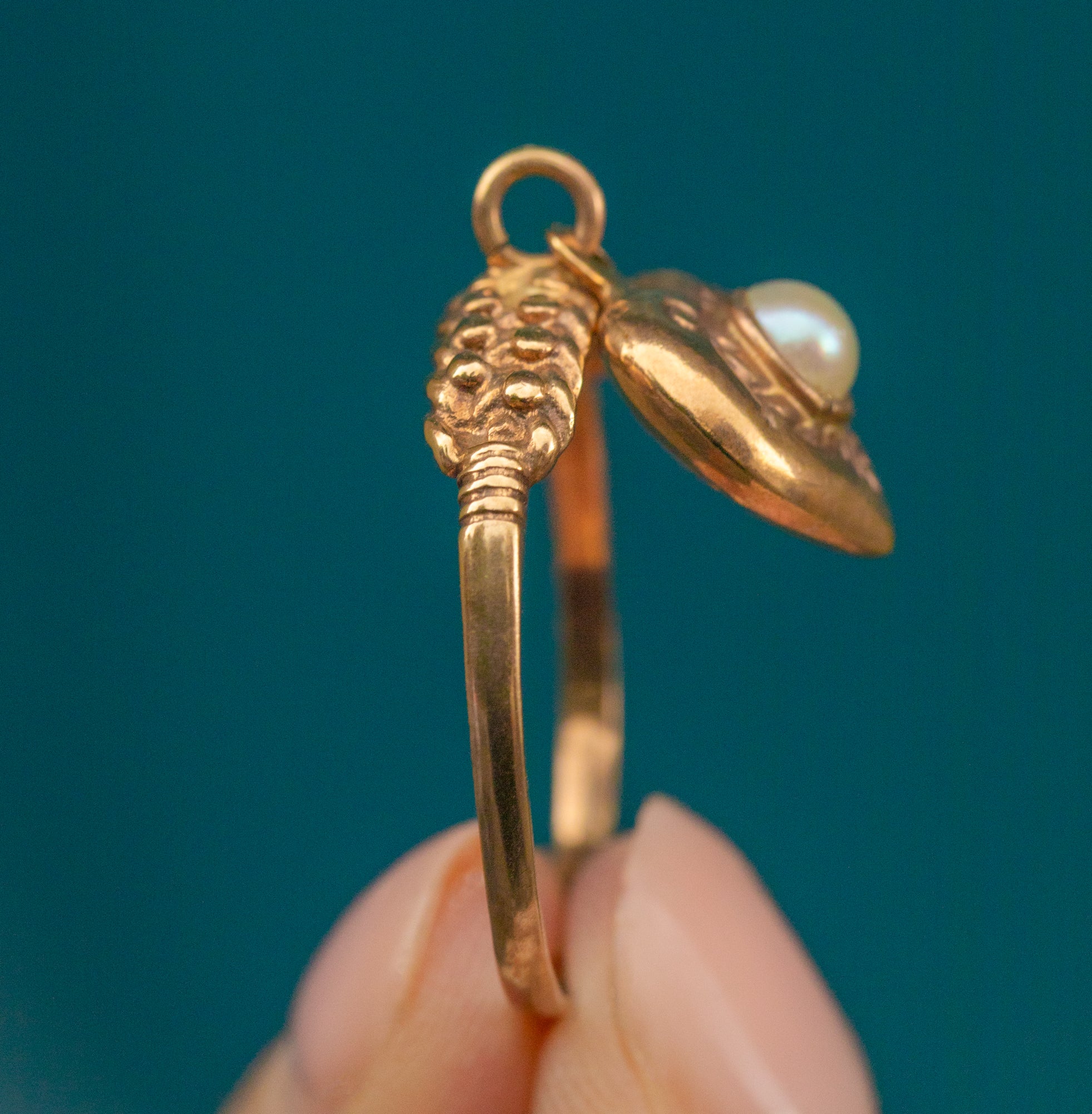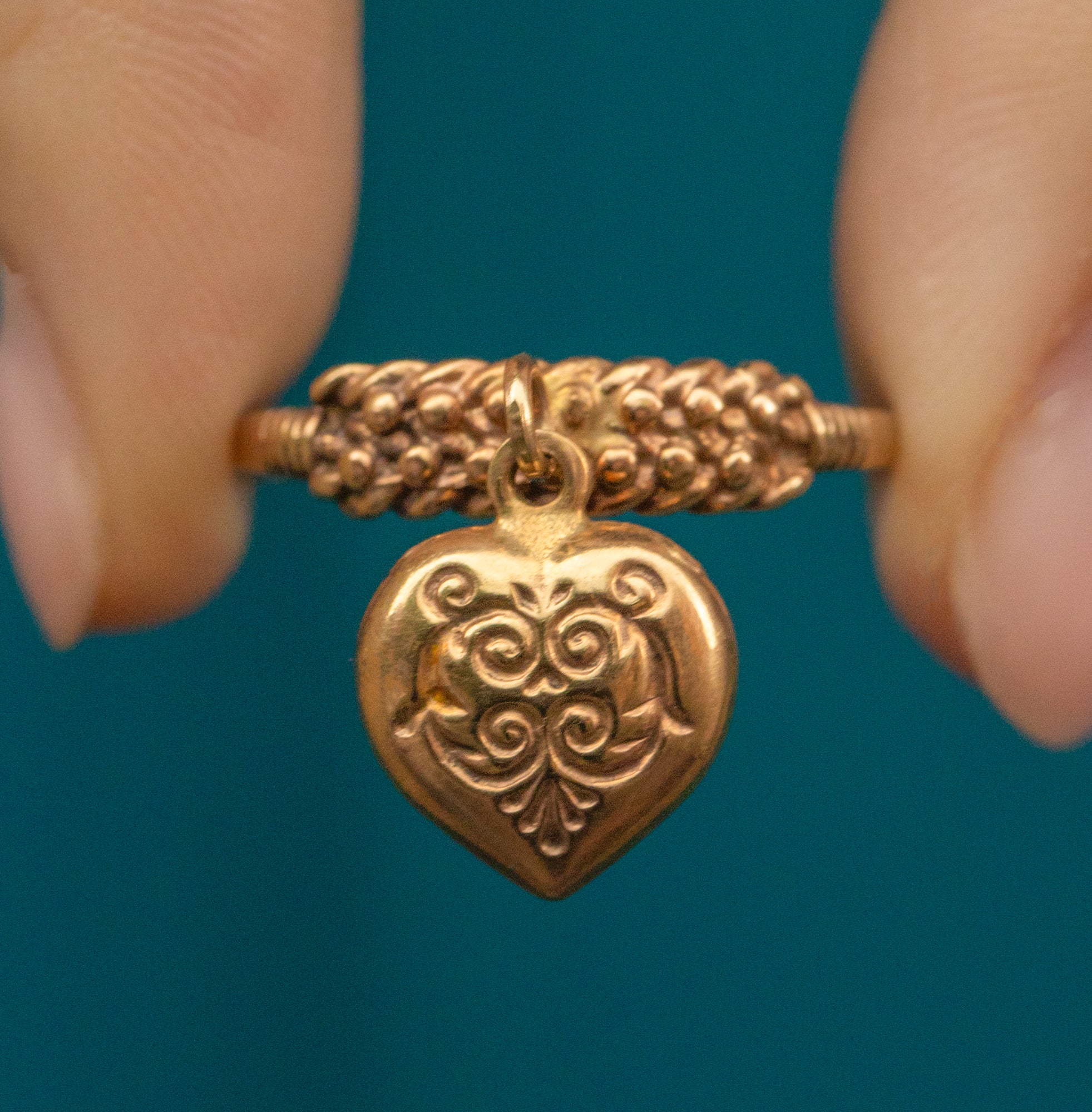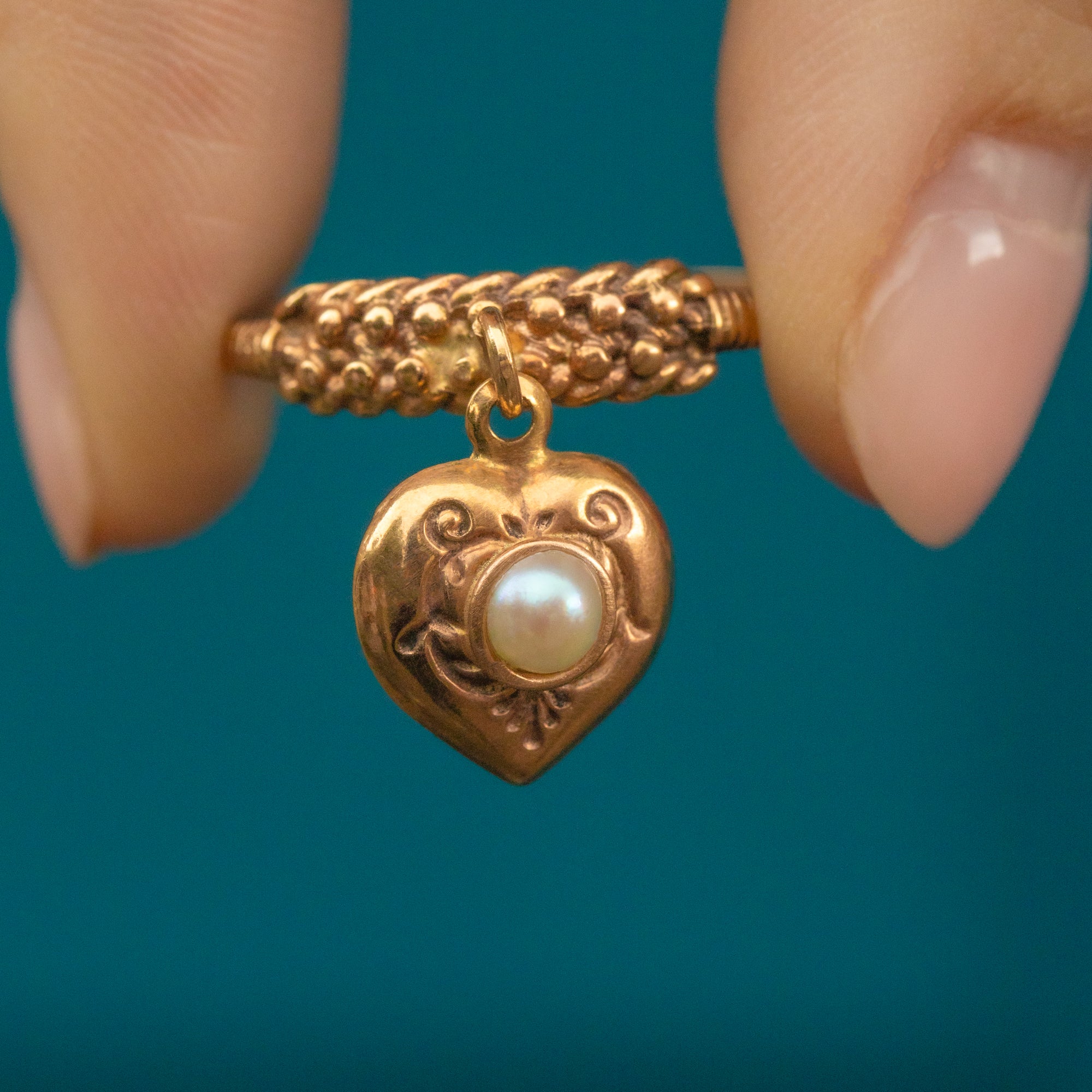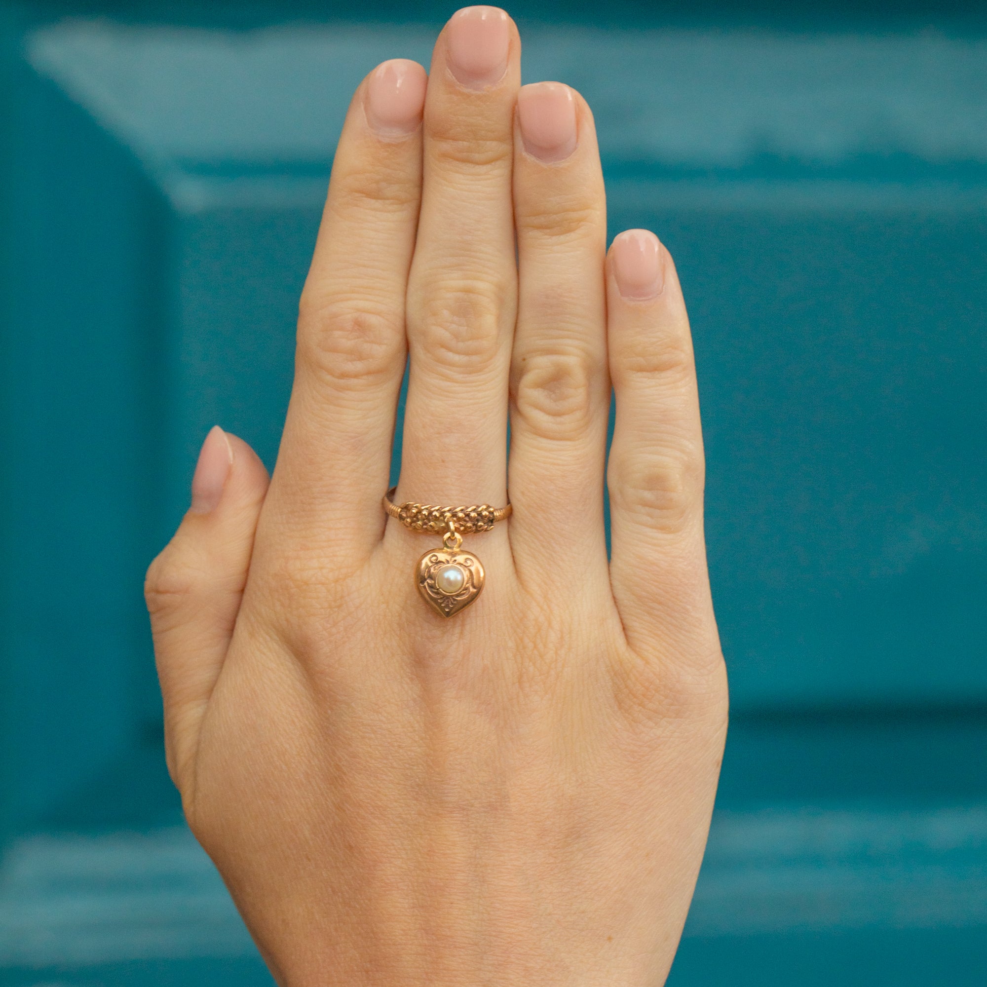 VERY GOOD. This antique 9ct Gold Pearl heart drop ring is in very good condition. The Gold is buttery throughout and the band has retained its form impeccably over the years. The heart has remained puffy and free from dings and is securely affixed to the band. The Pearl has a wonderful sheen and has retained its natural nacre. There are some subtle signs of wear to the back of the band, however this cannot be seen when worn. All in all, a superb and highly unique piece of Victorian jewellery ready to be worn and adored for many more years to come!