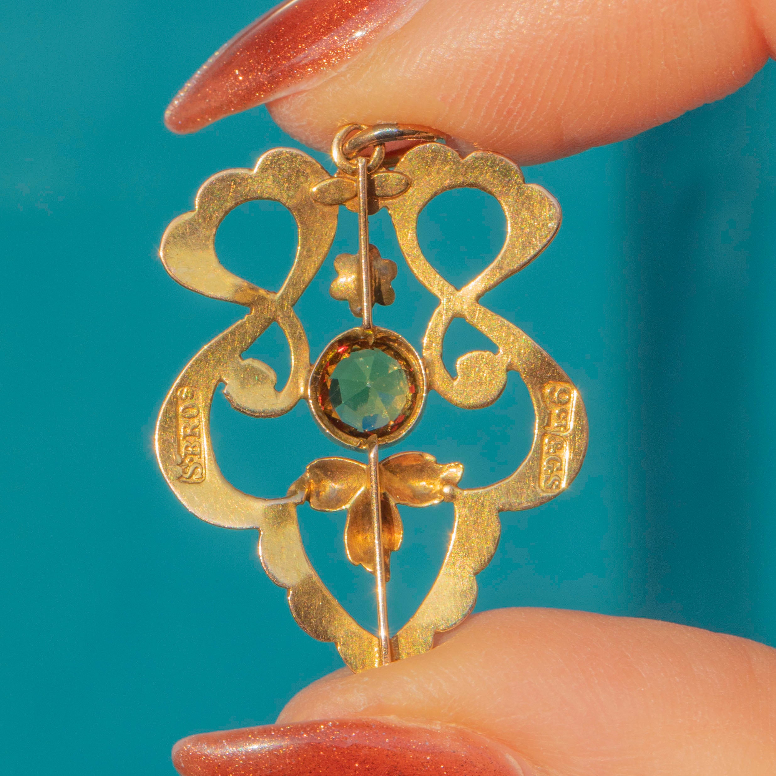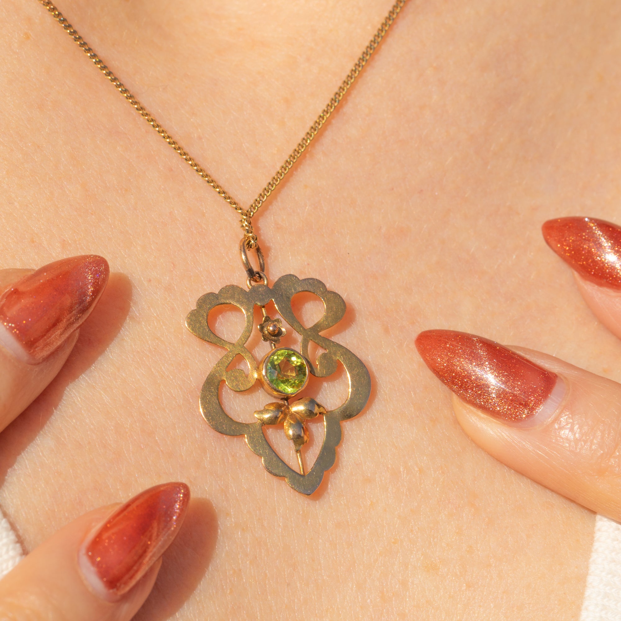 A whimsical antique 9ct Gold Peridot Lavalier pendant! This classic Edwardian treasure embraces all that was so loved about the era, with clean, flowing lines and a feminine appeal.