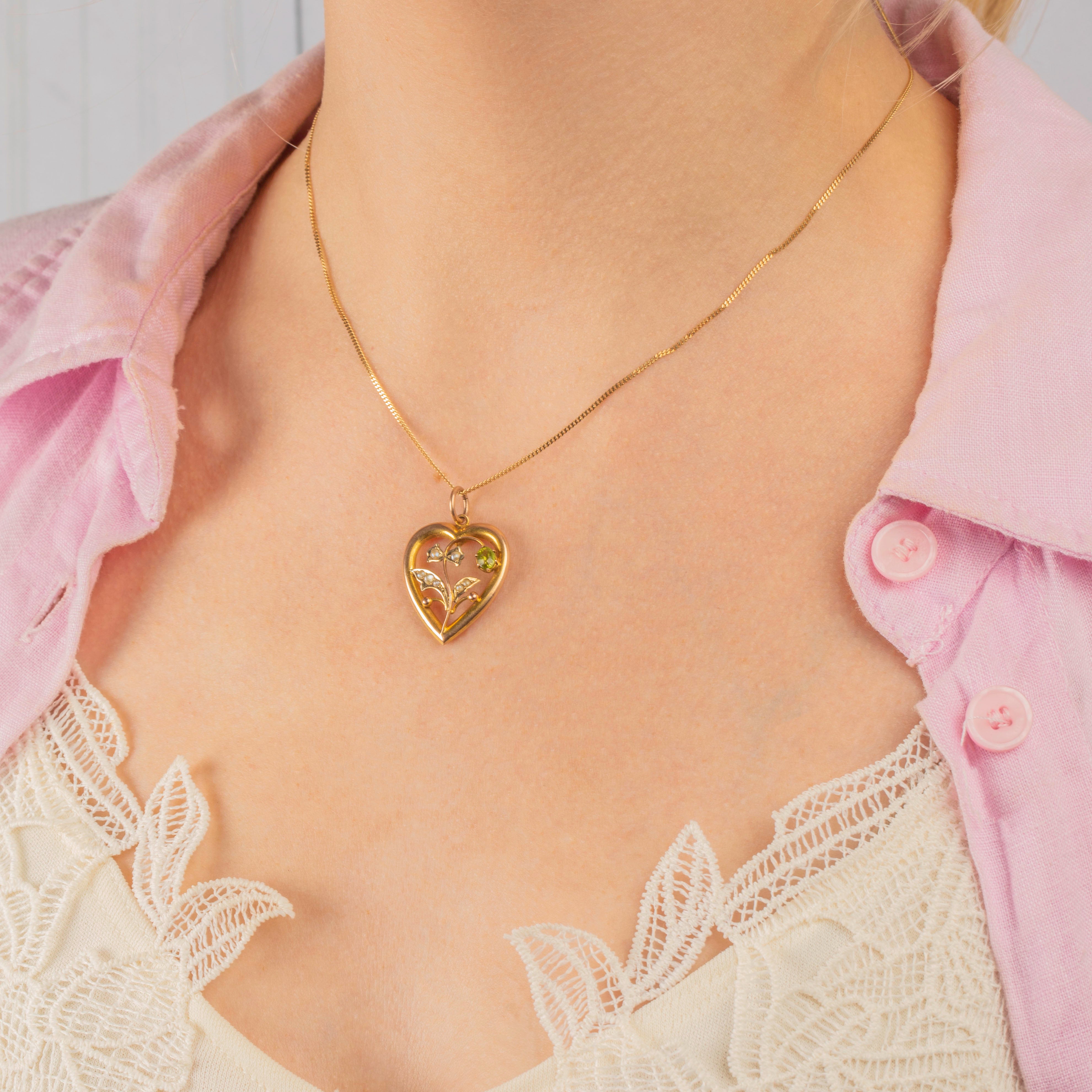We are madly in love with this antique 9ct Gold Peridot Pearl heart pendant! A delicate flower grows in the midst of a rich 9ct Gold heart, with her stem and flowers imbedded with lustrous seed Pearls. Growing from the flower is a zingy green Peridot head, bursting with vibrant hues.